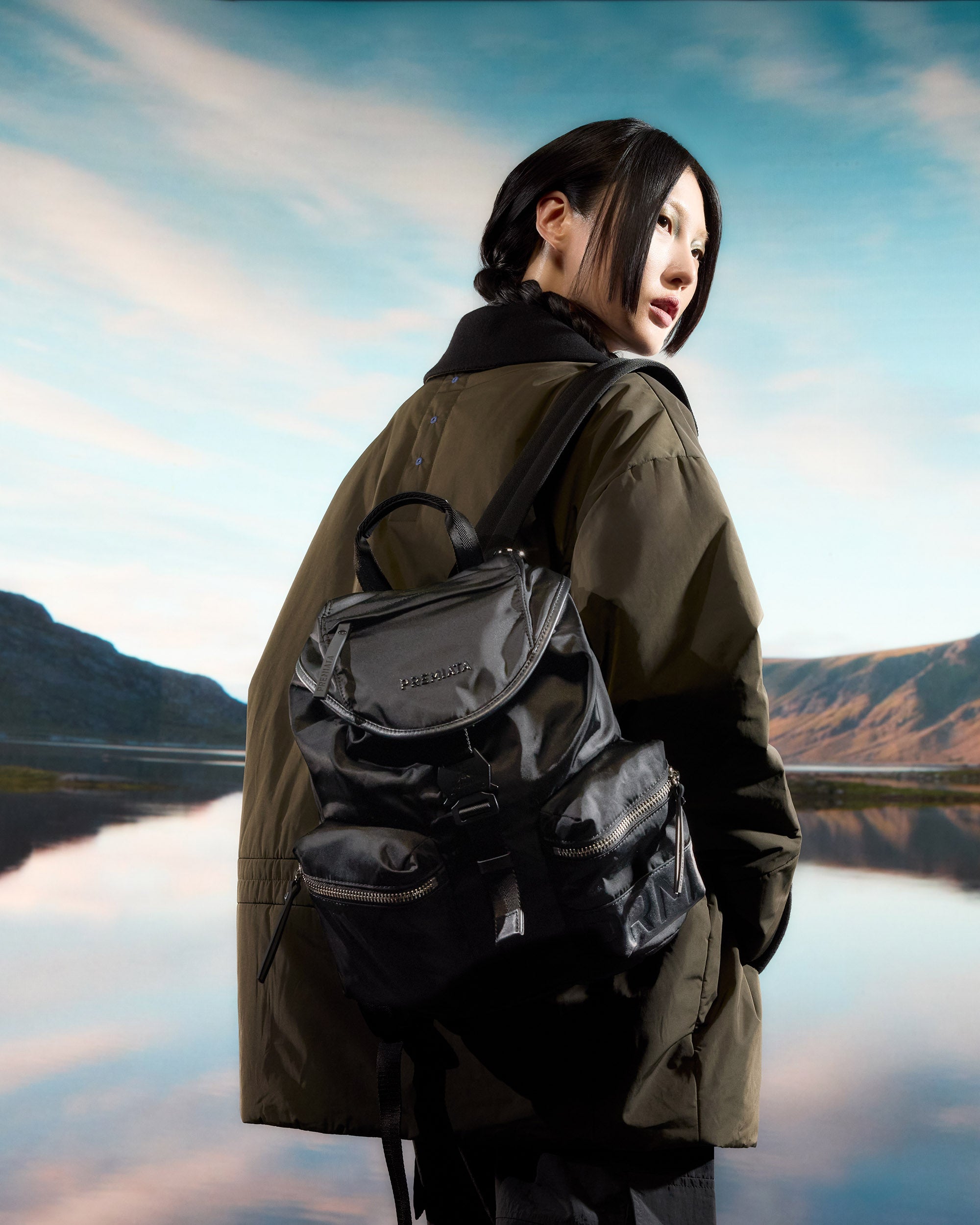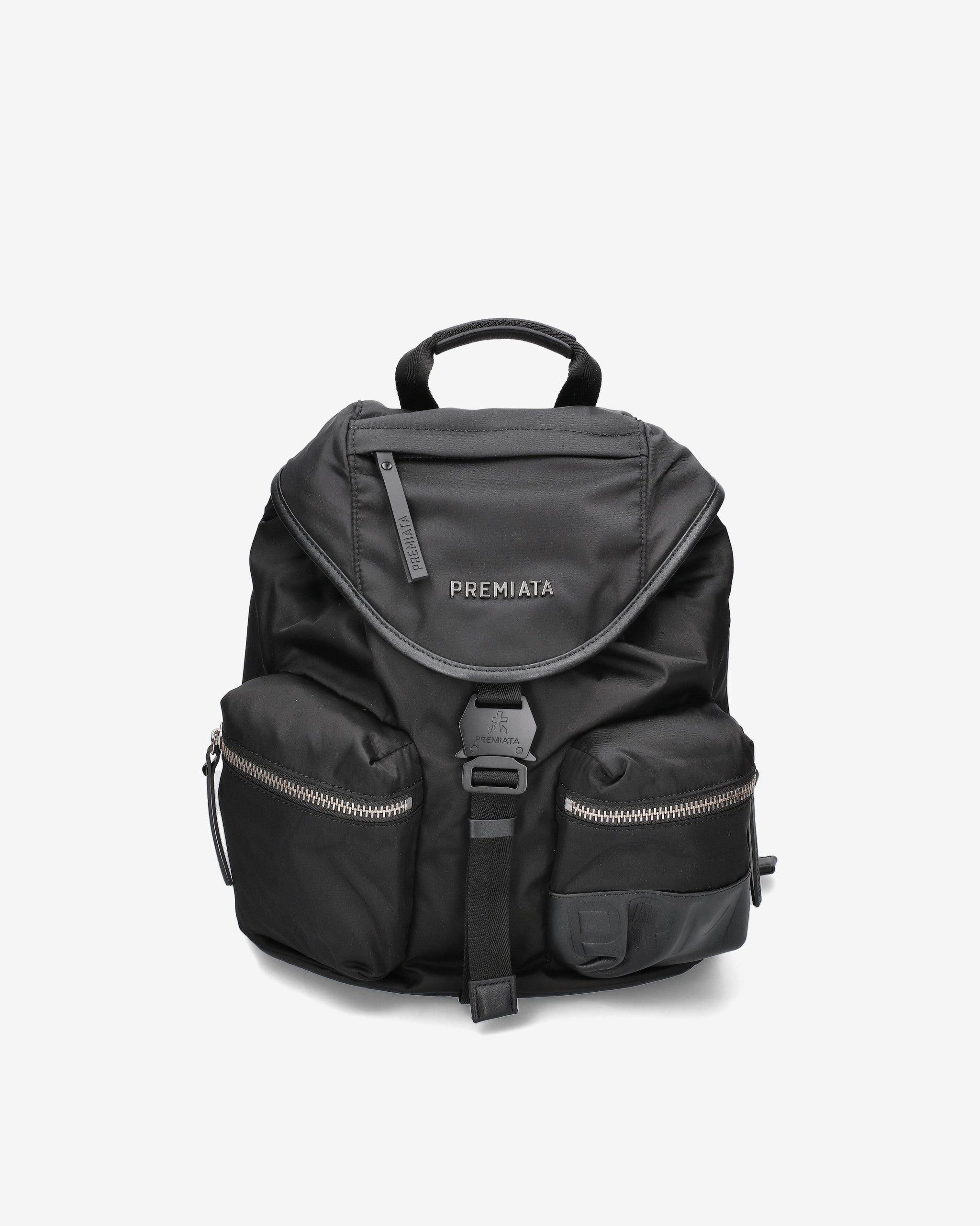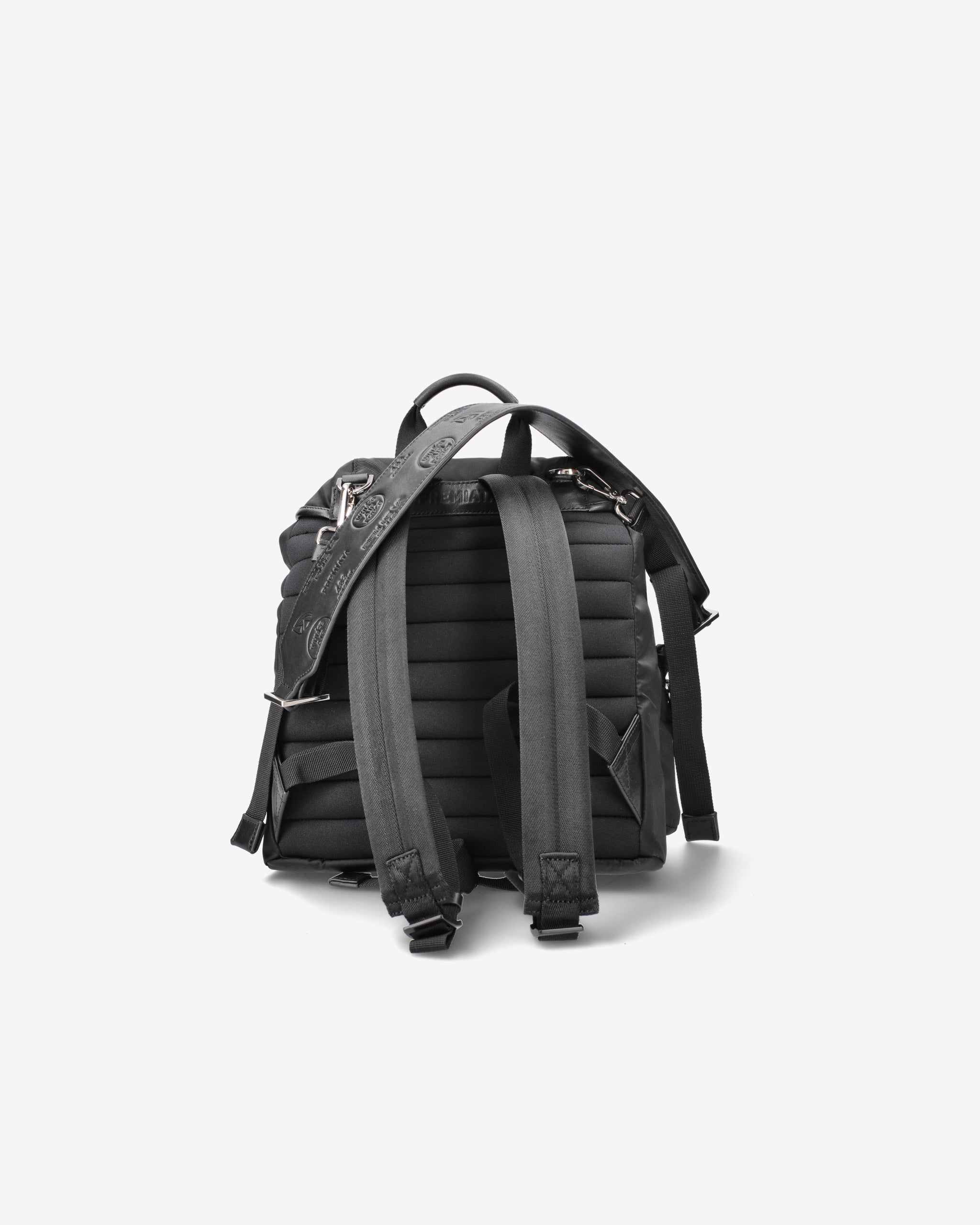 A capacious and versatile model in soft, premium rubberized effect fabric. Padded EVA back and shoulder straps for added comfort. Side pockets with calfskin leather trim and matte metal closures.