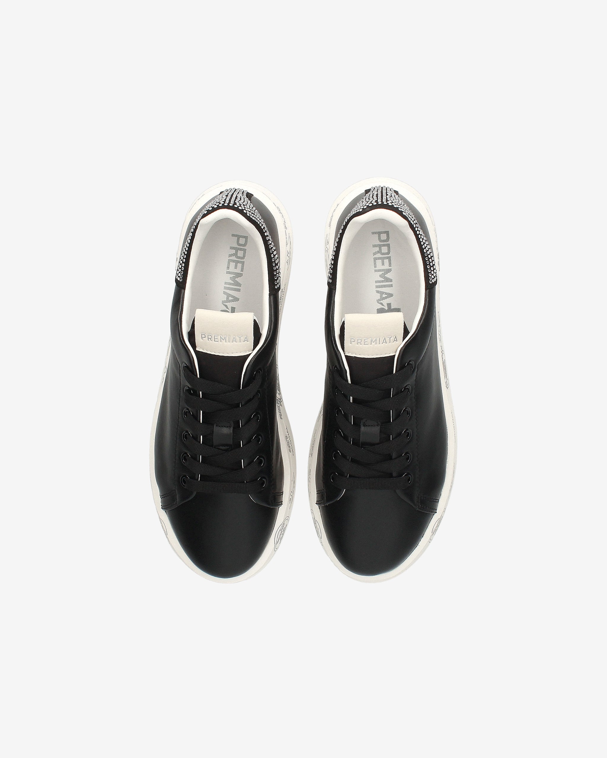 In smooth black leather with jewel detailing on the heel, the Belle sneaker is distinguished by a gritty elegance. Ton sur ton laces and a sole with original Premiata signature graphics add character and recognizability. The essential design is embellished with the brand's signature side lettering and comfort.