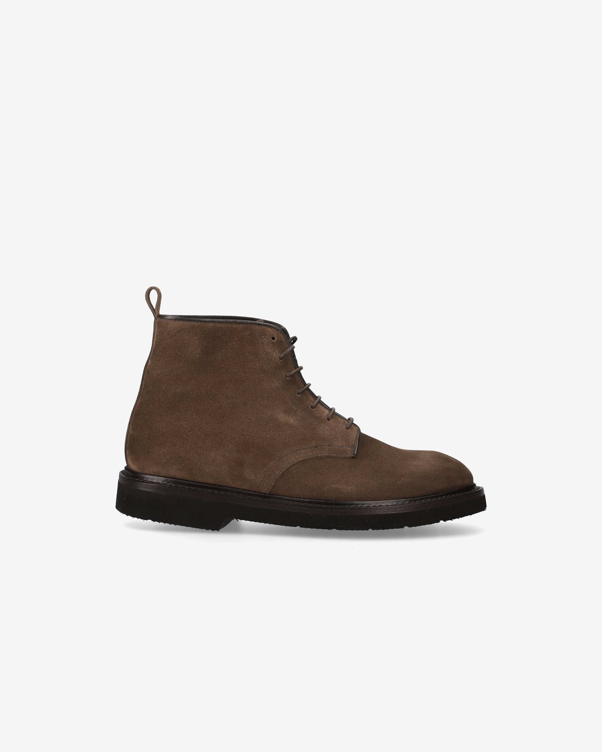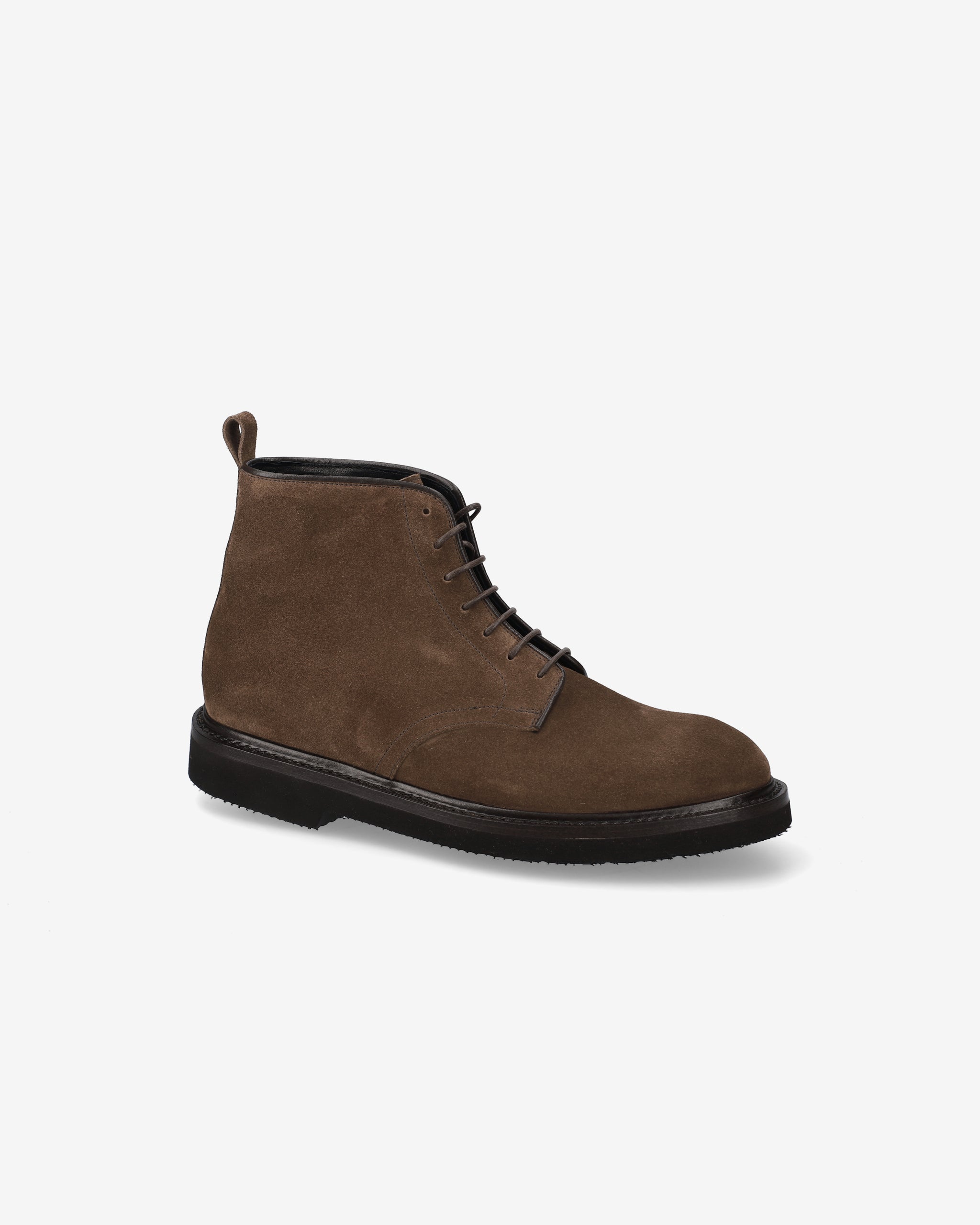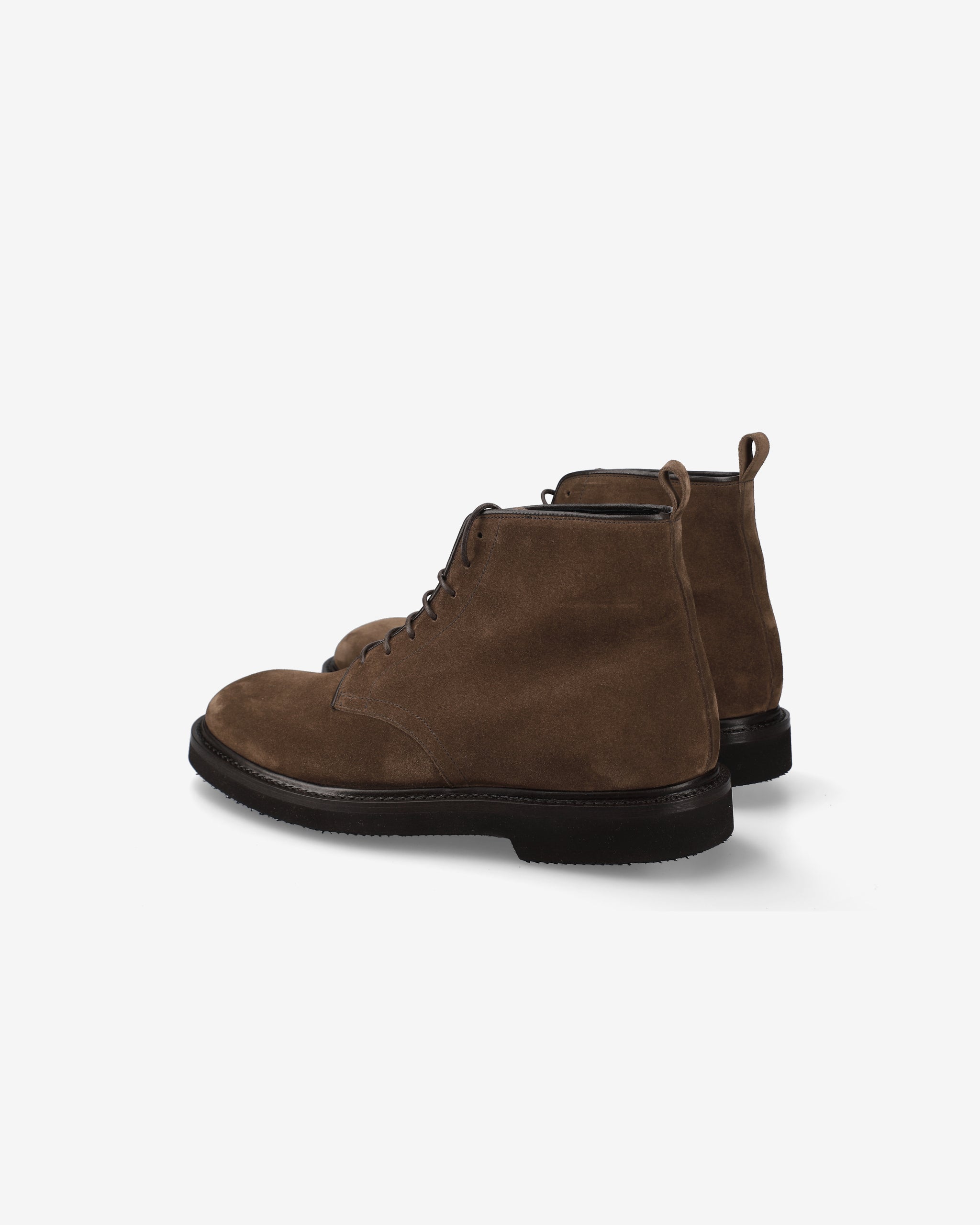 Lace-up ankle boots with an essential and contemporary design, made of split leather and finished with fine kangaroo leather edging. The custom super-light Eva bottom provides maximum lightness and comfort.
