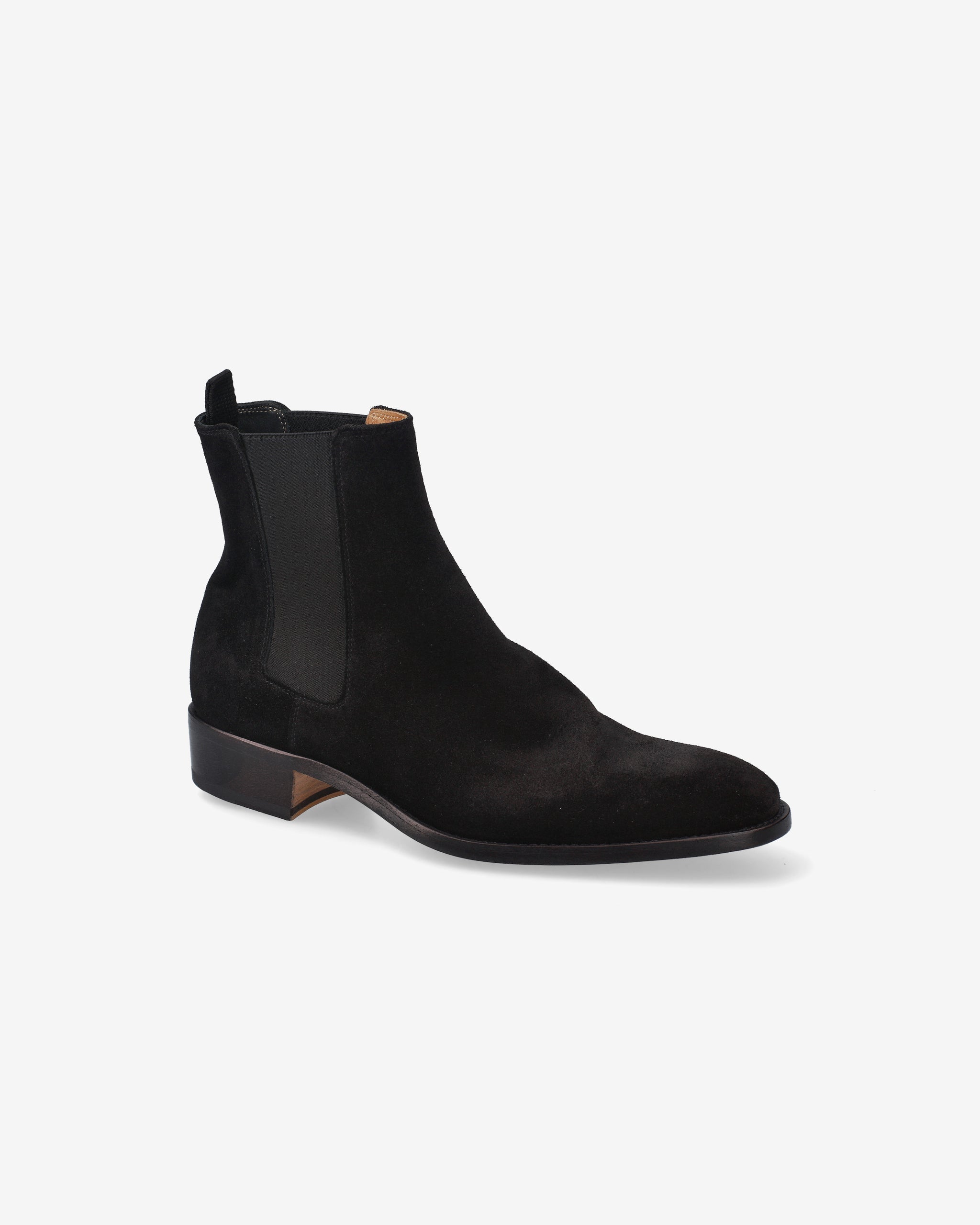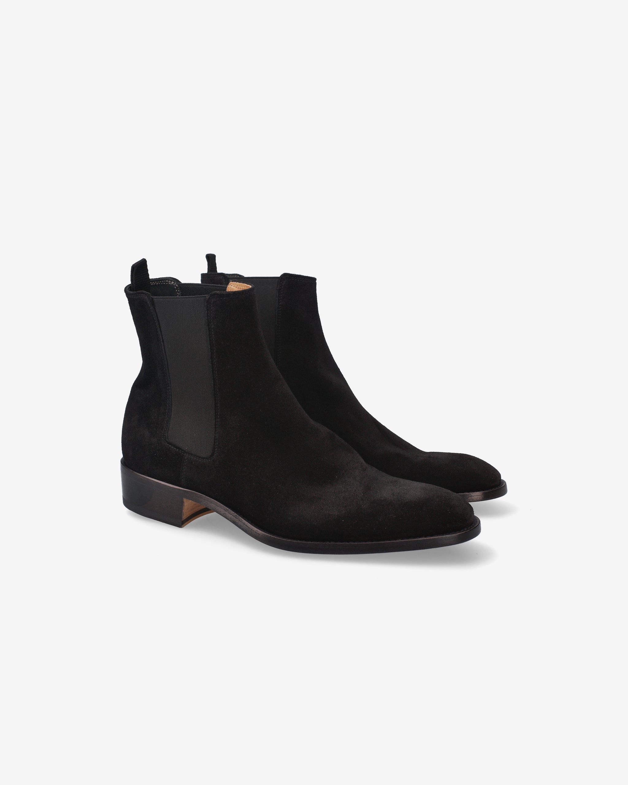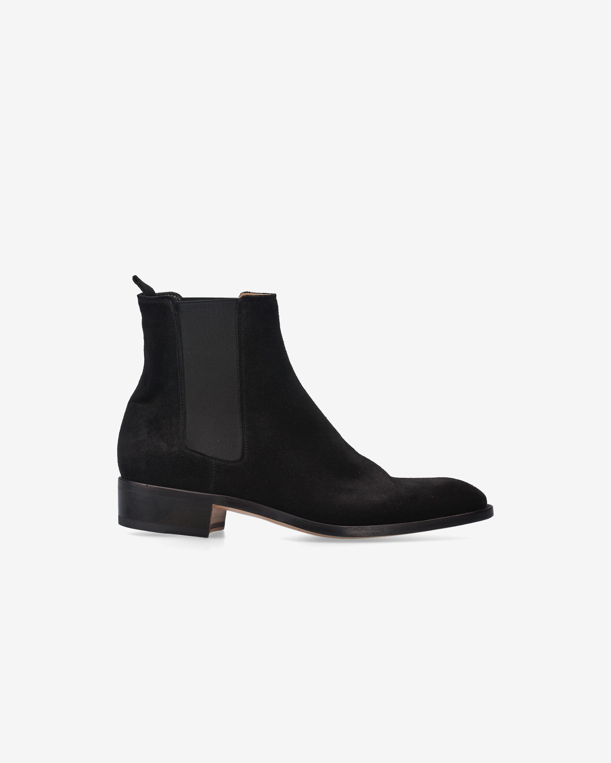 Elegant and minimalist ankle boots, crafted from black suede with a tapered silhouette and clean profile. The leather sole and Blake stitching highlight the artisanal quality, while the elastic side ensures a practical and comfortable fit. The leather insole and 30mm heel complete this sophisticated and versatile look.