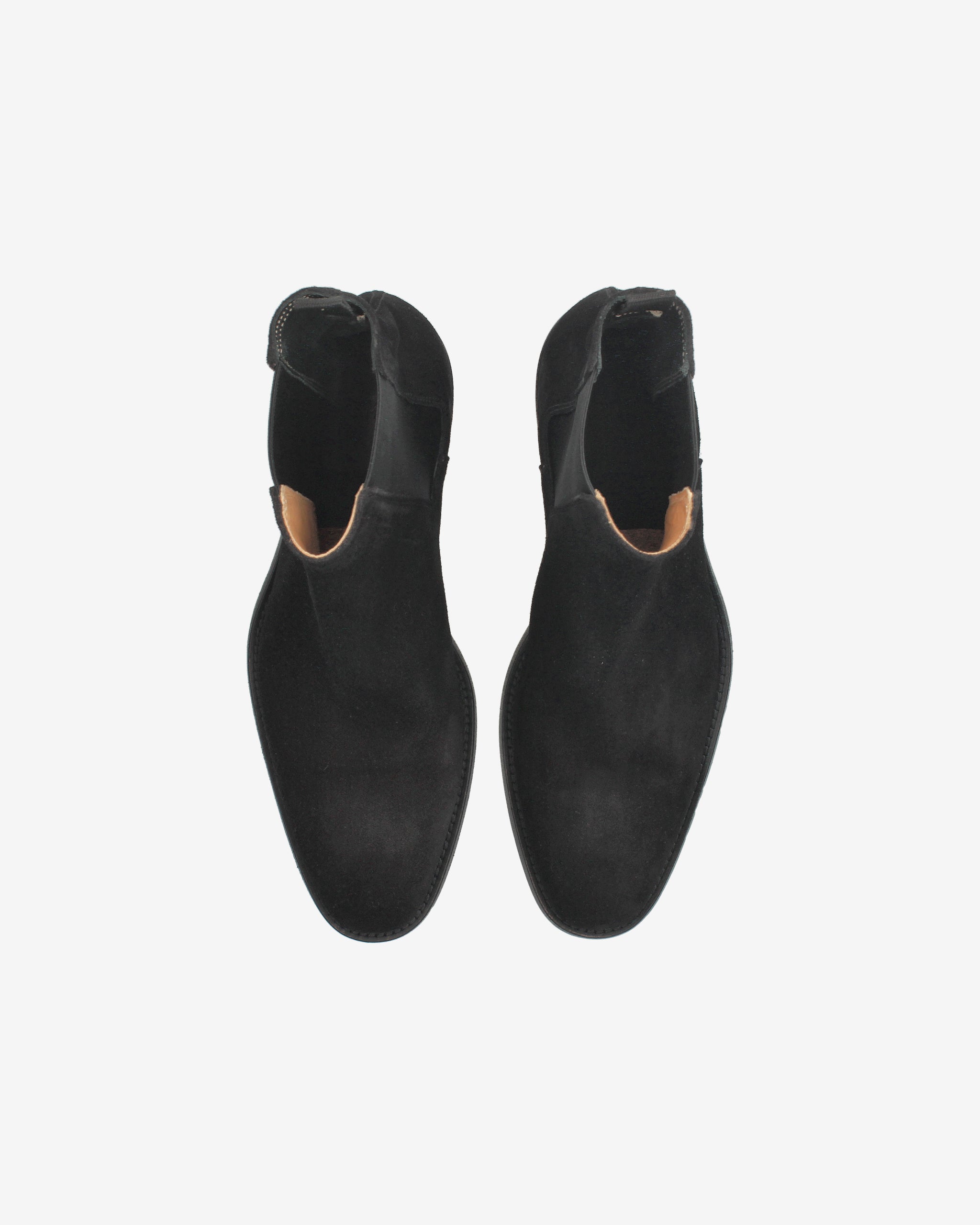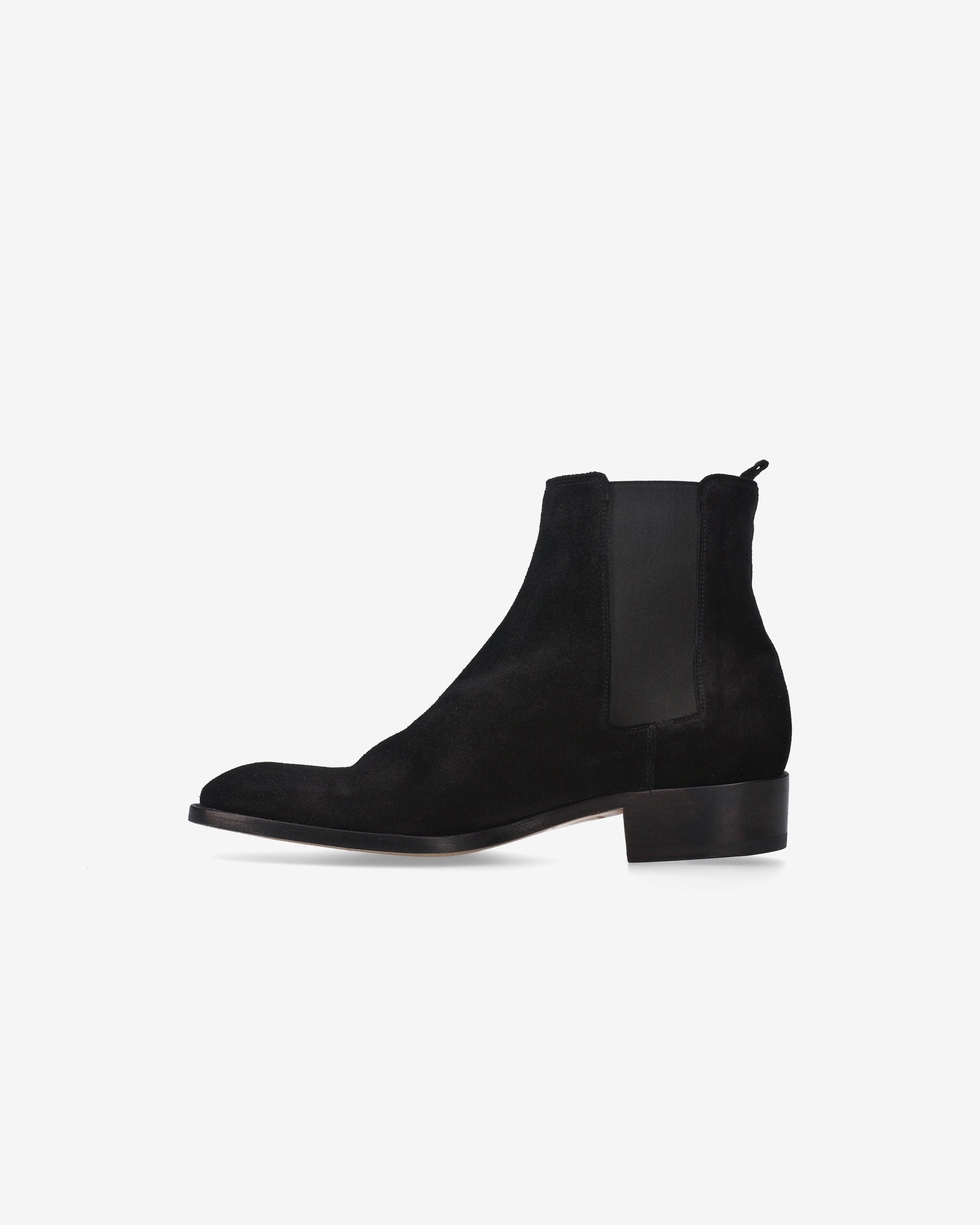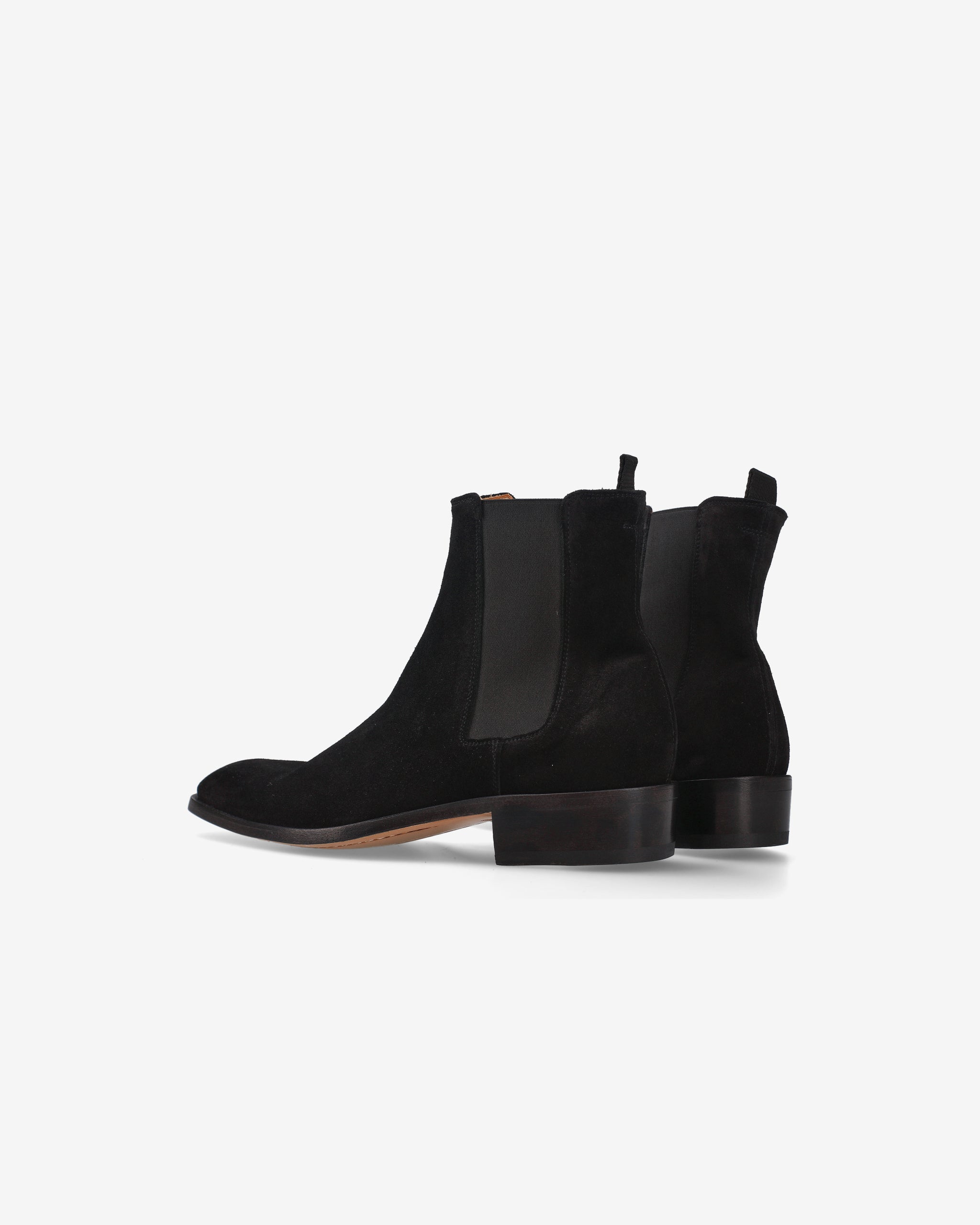 Elegant and minimalist ankle boots, crafted from black suede with a tapered silhouette and clean profile. The leather sole and Blake stitching highlight the artisanal quality, while the elastic side ensures a practical and comfortable fit. The leather insole and 30mm heel complete this sophisticated and versatile look.