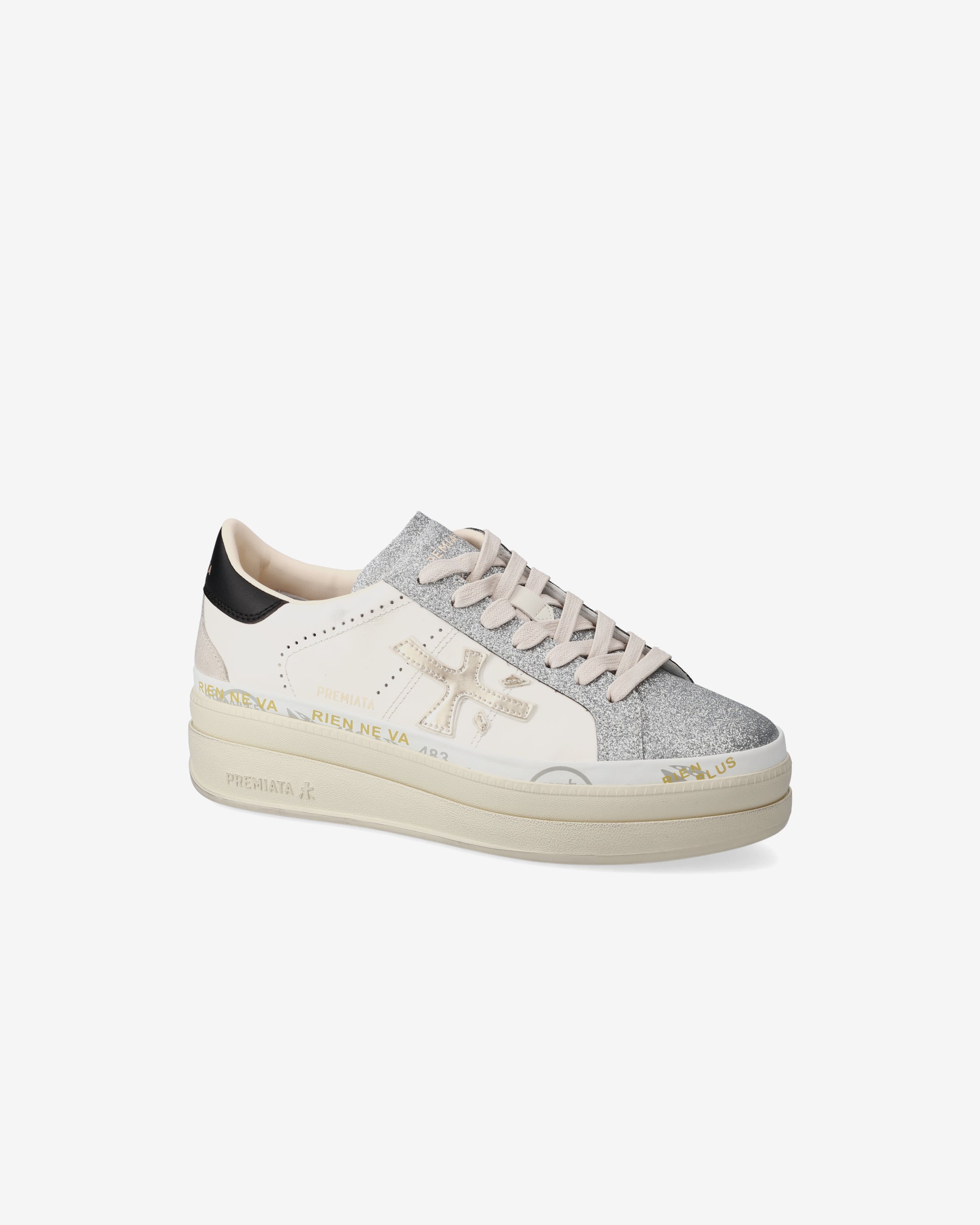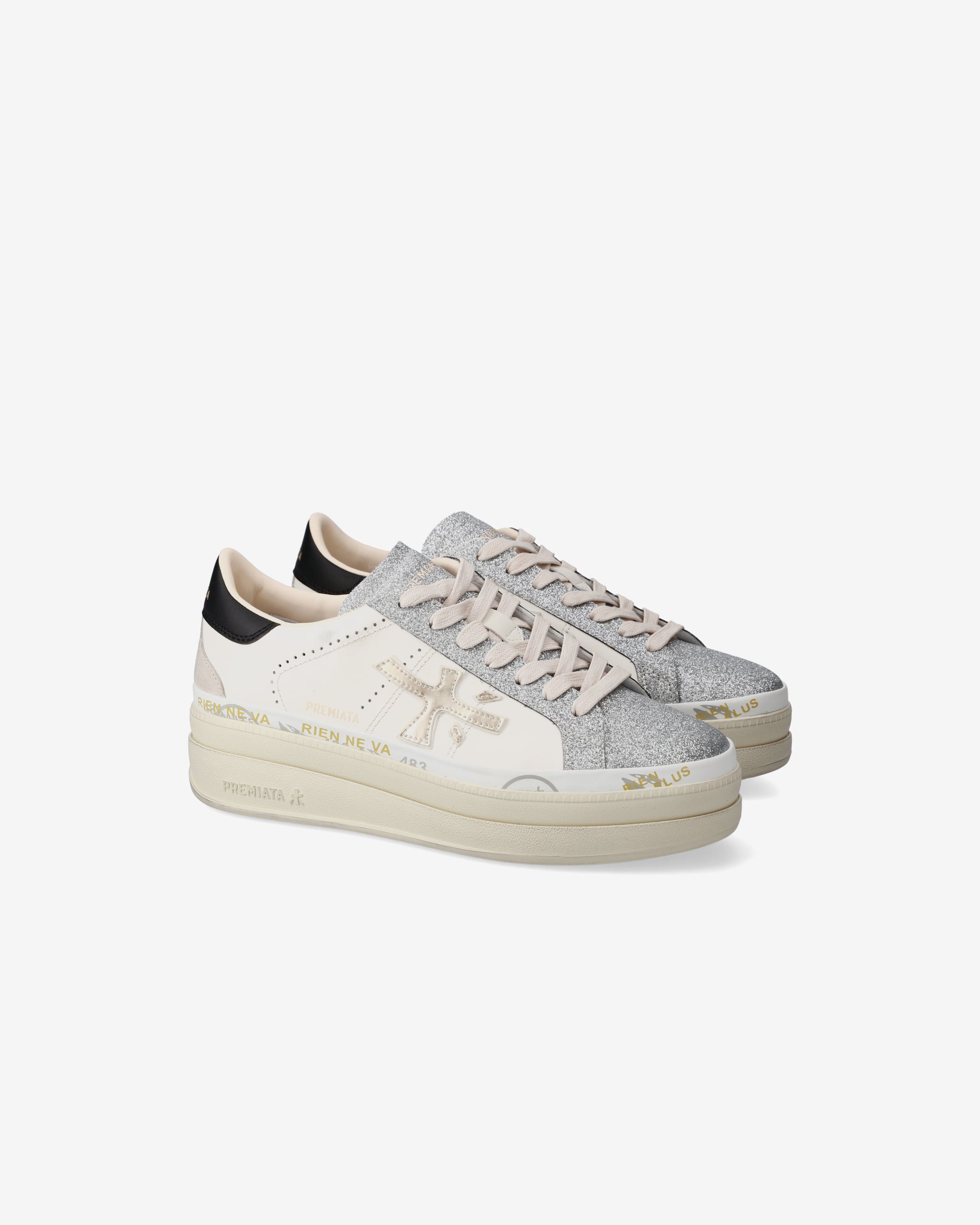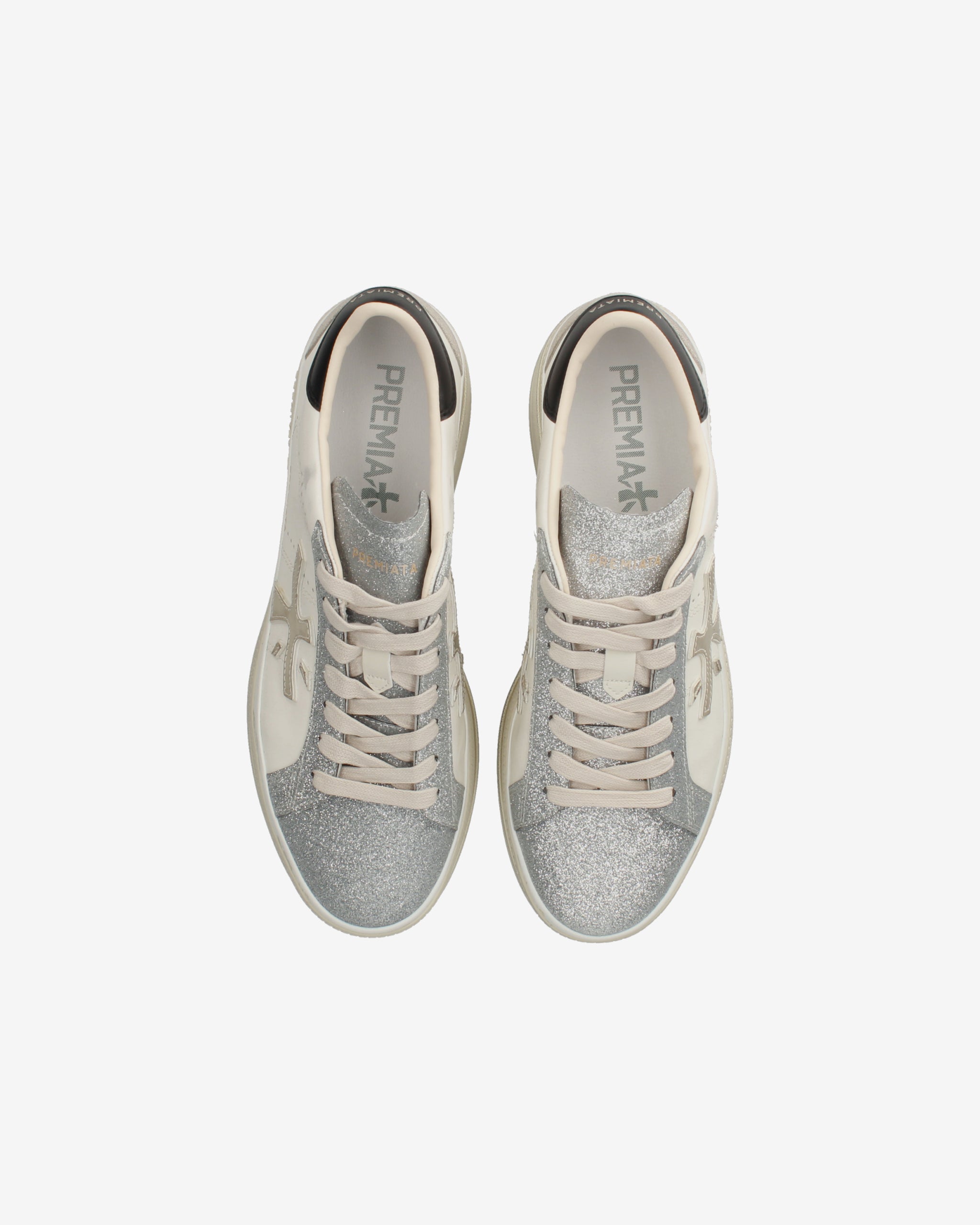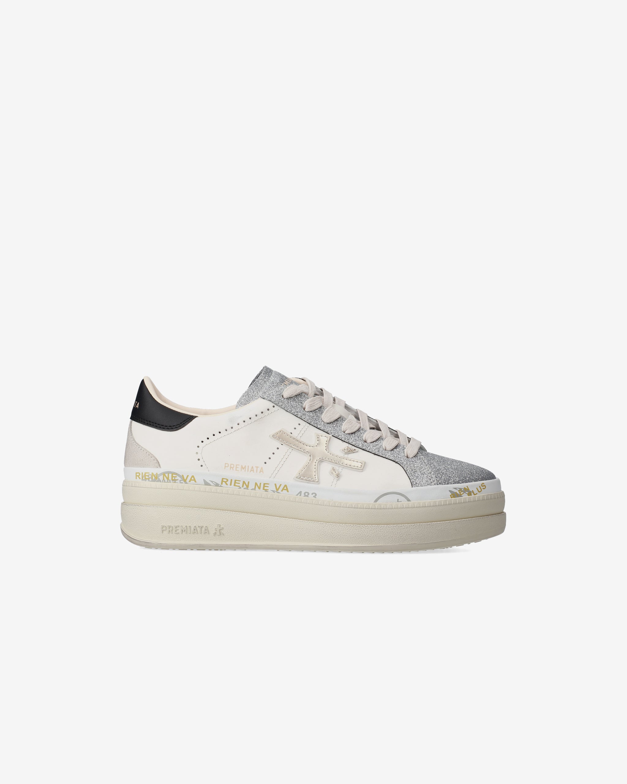 Premiata sneaker in beige leather and fabric with silver details. Side logo with golden "Premiata" lettering and sole with iconic brand stamps. A clean and versatile model for any occasion.