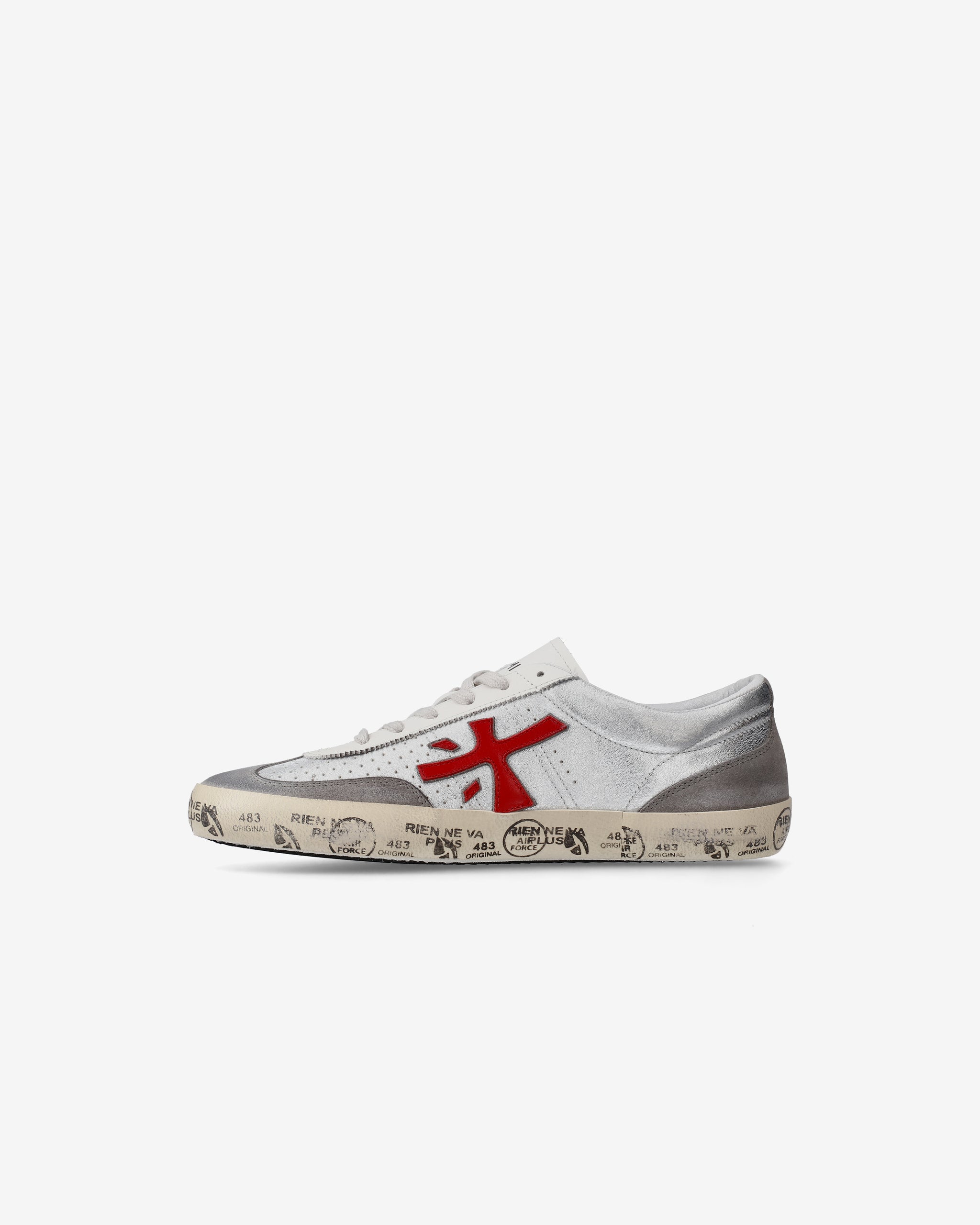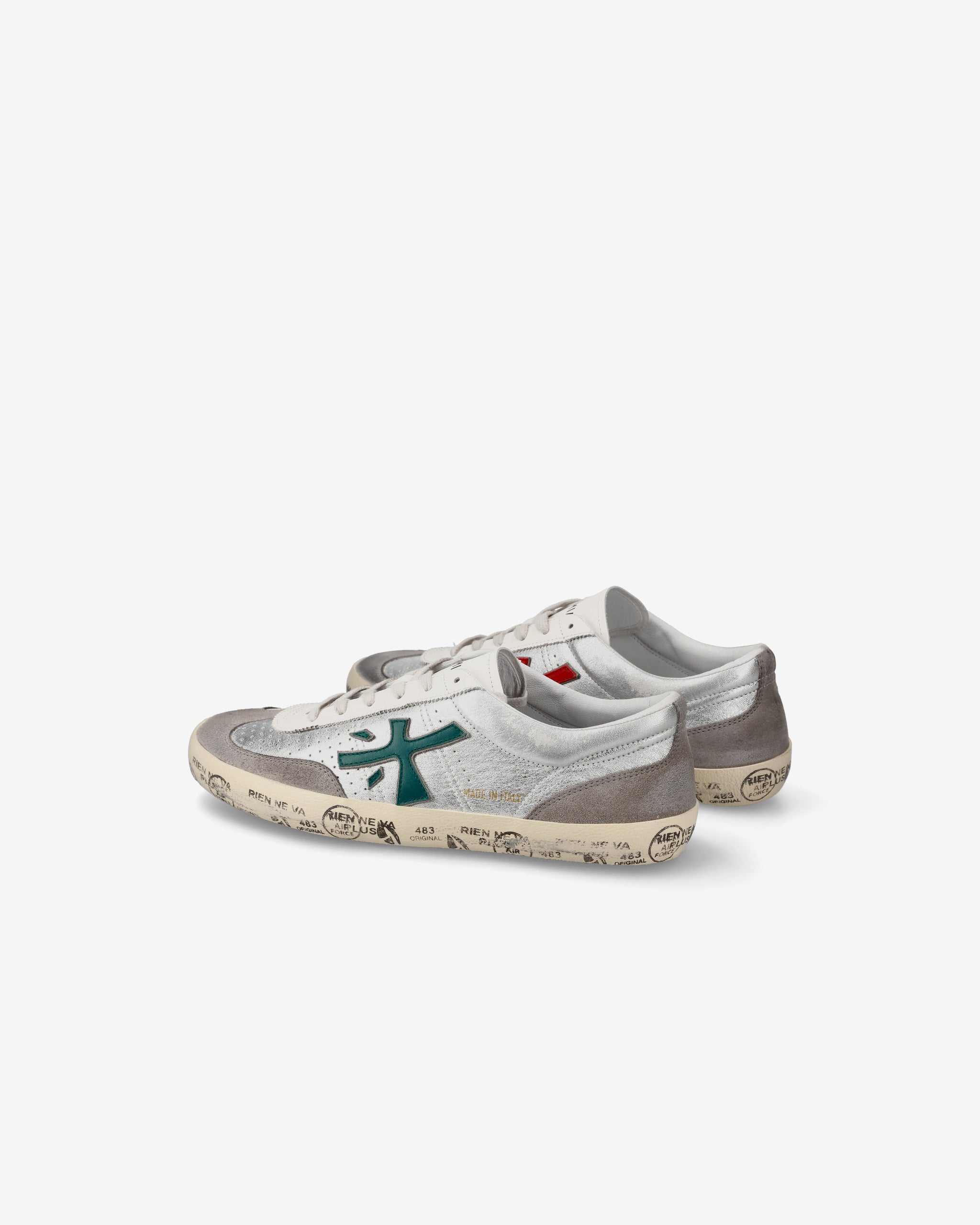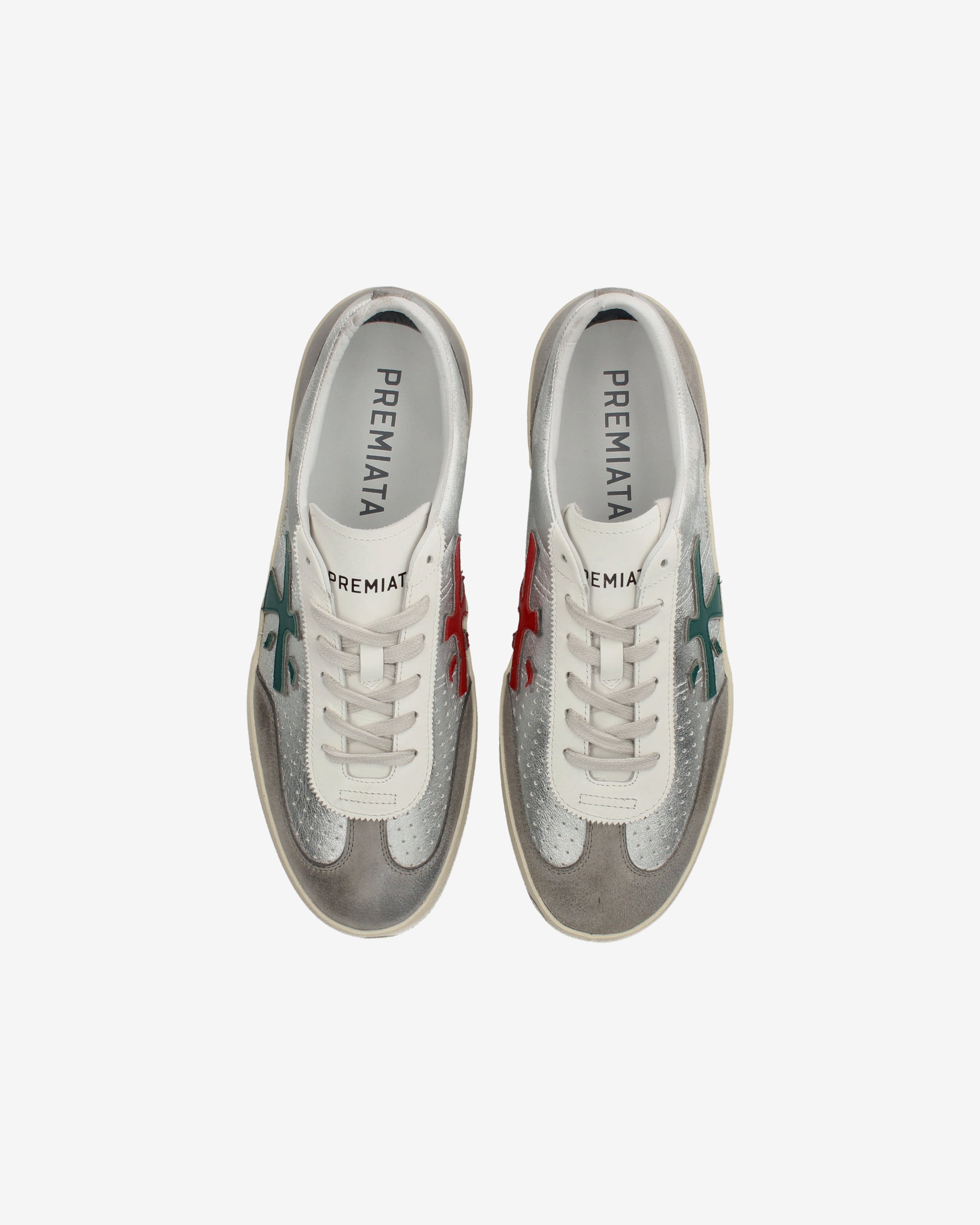A model with a sporty and bright spirit, with a metallic effect upper and contrasting details that enhance its dynamism. The mix of textures gives energy and uniqueness to a sneaker designed to stand out, always with the unmistakable Premiata style.