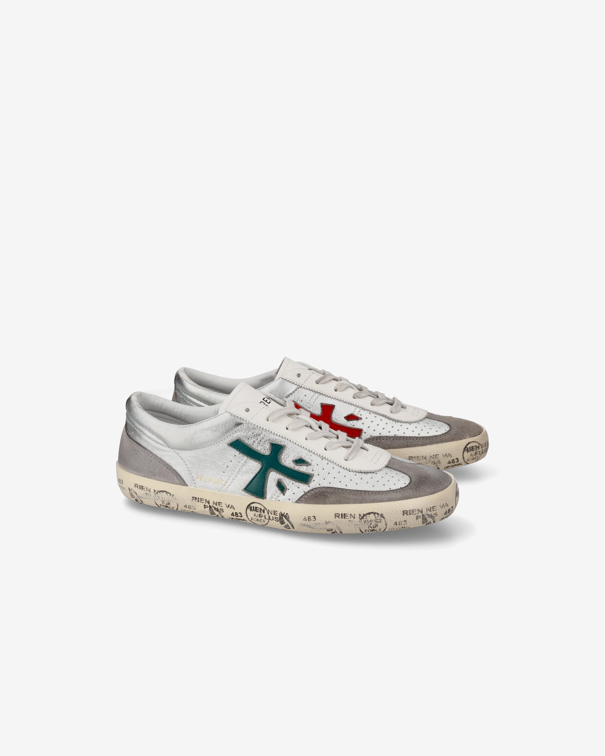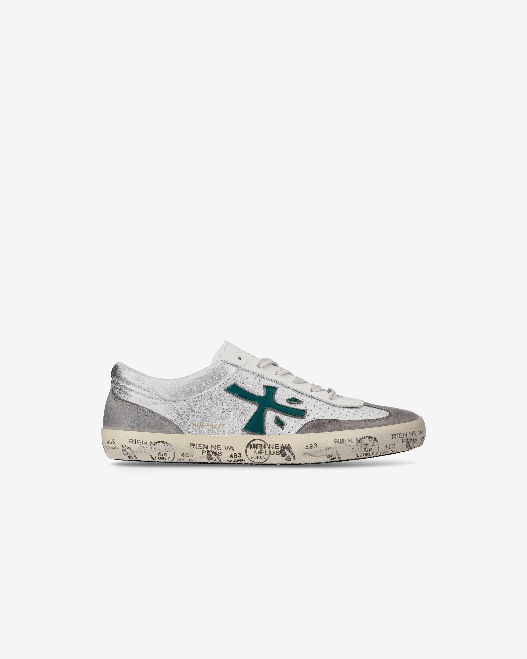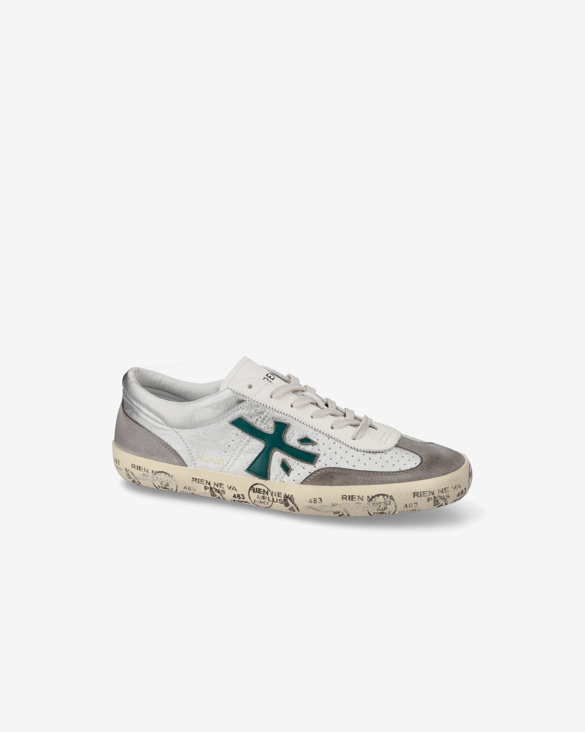 A model with a sporty and bright spirit, with a metallic effect upper and contrasting details that enhance its dynamism. The mix of textures gives energy and uniqueness to a sneaker designed to stand out, always with the unmistakable Premiata style.