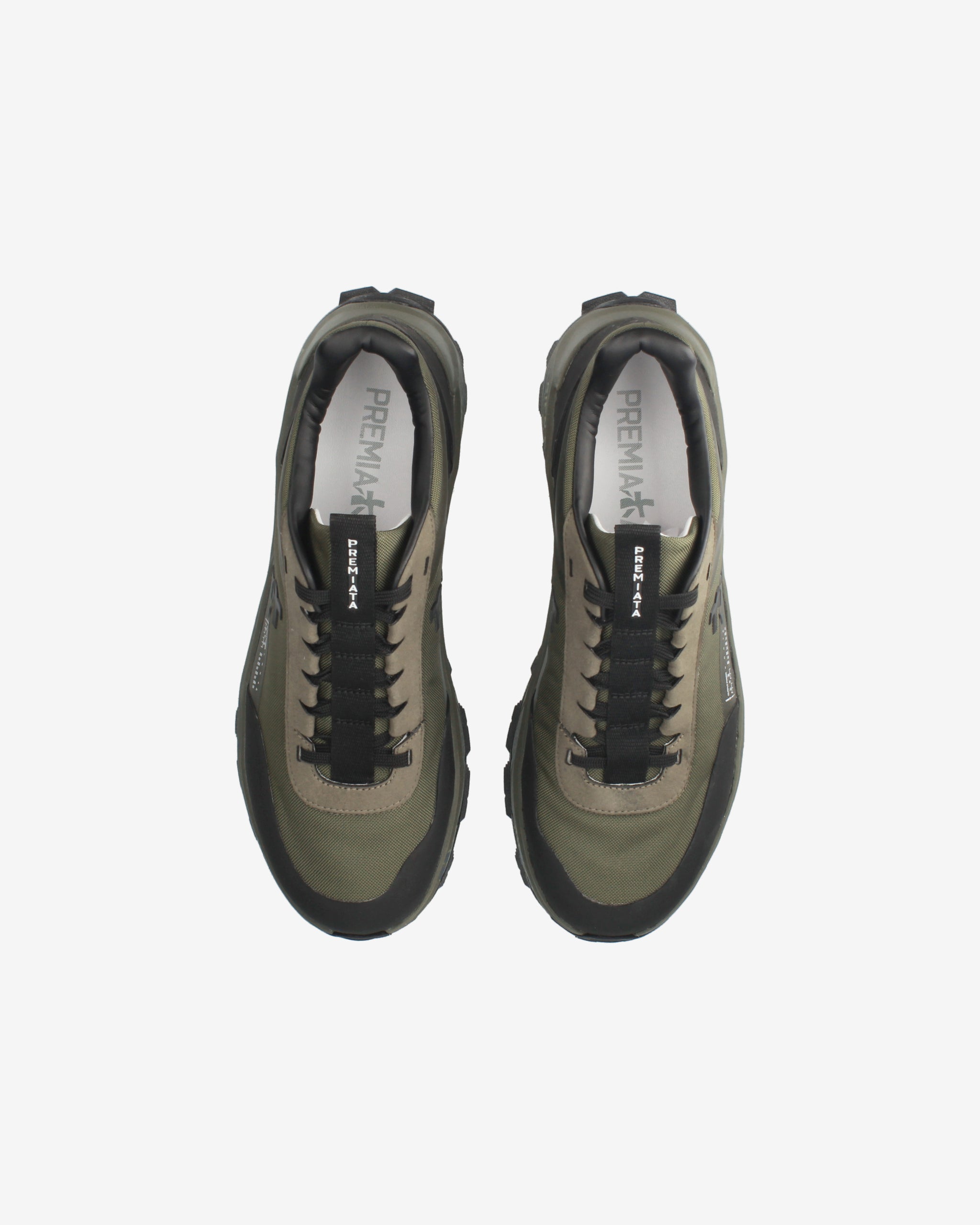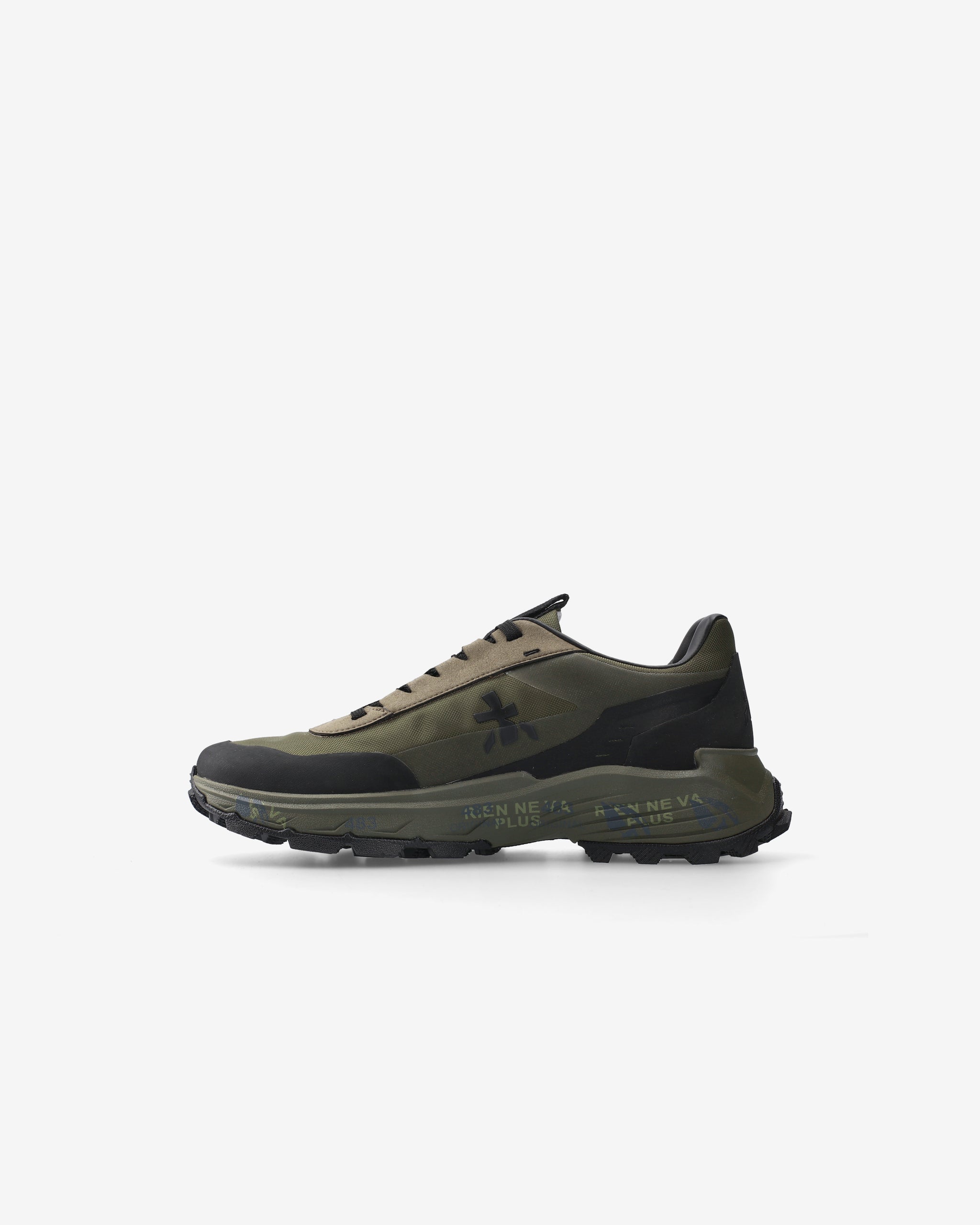 This hiking shoe combines a modern design with natural tones, with an army green upper and black details. The Vibram-marked sculpted sole lends character and reliability, ideal for tackling outdoor trails in style.