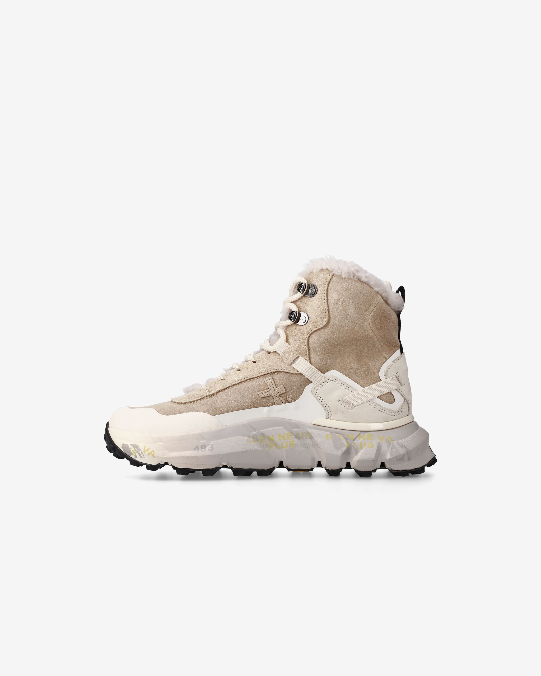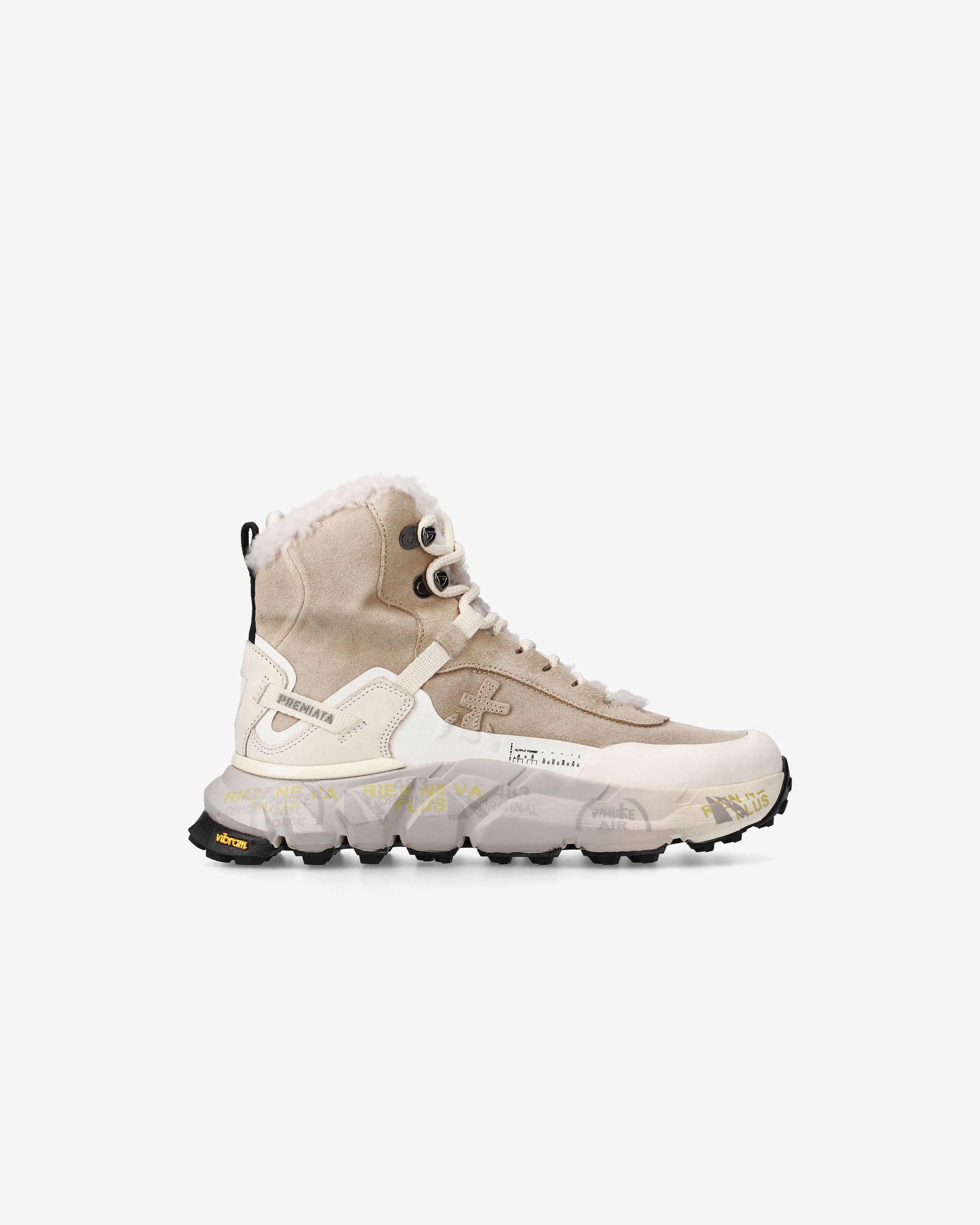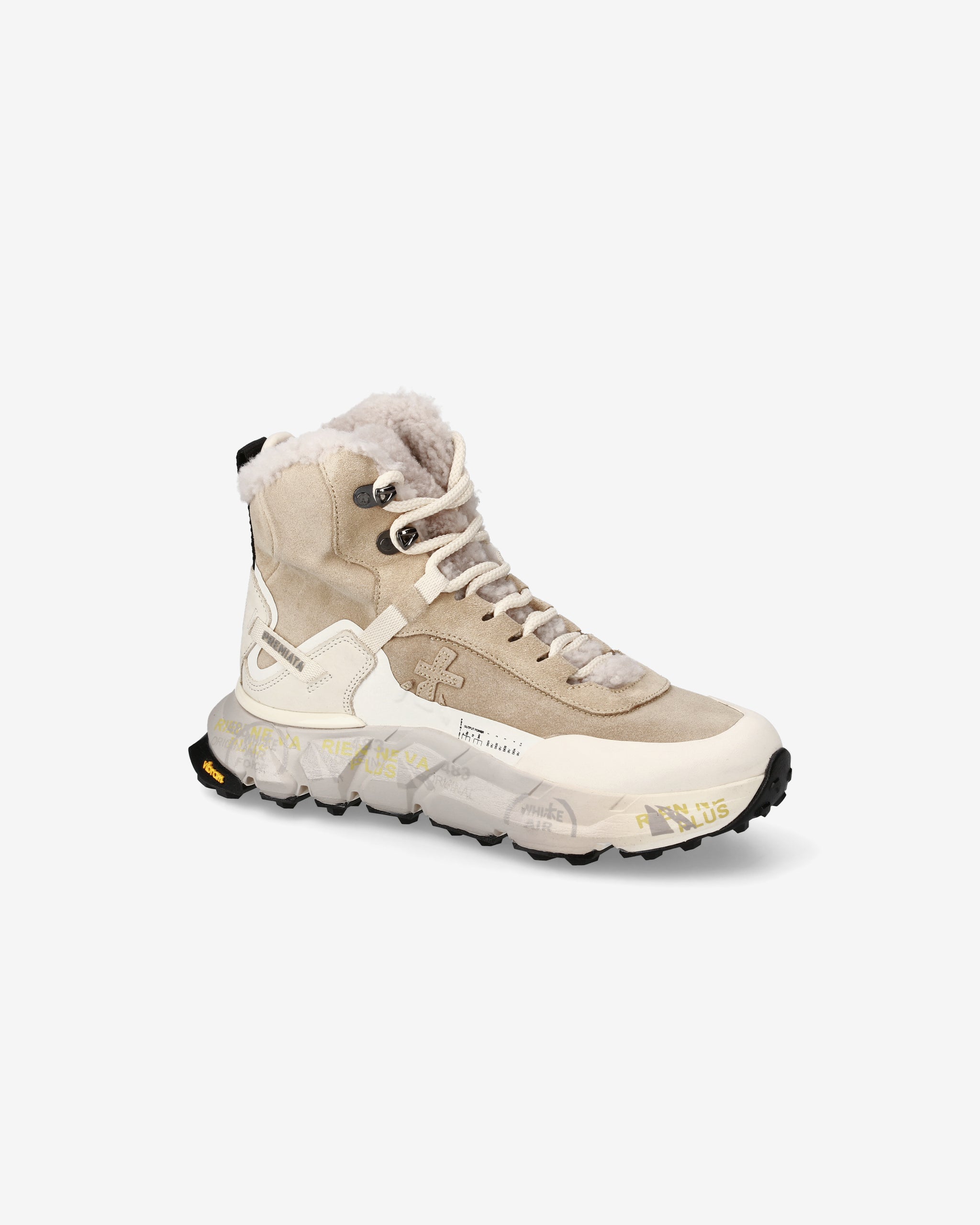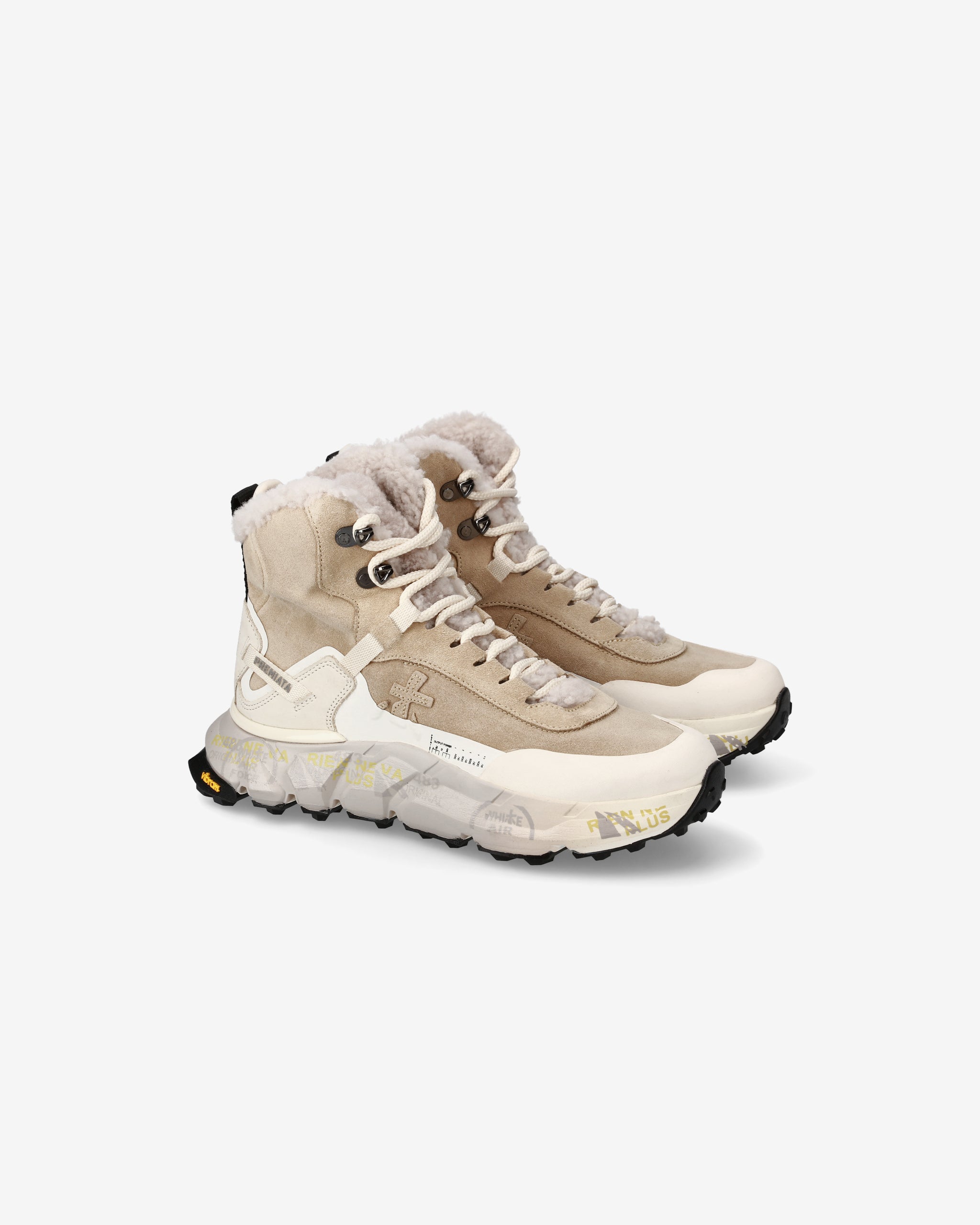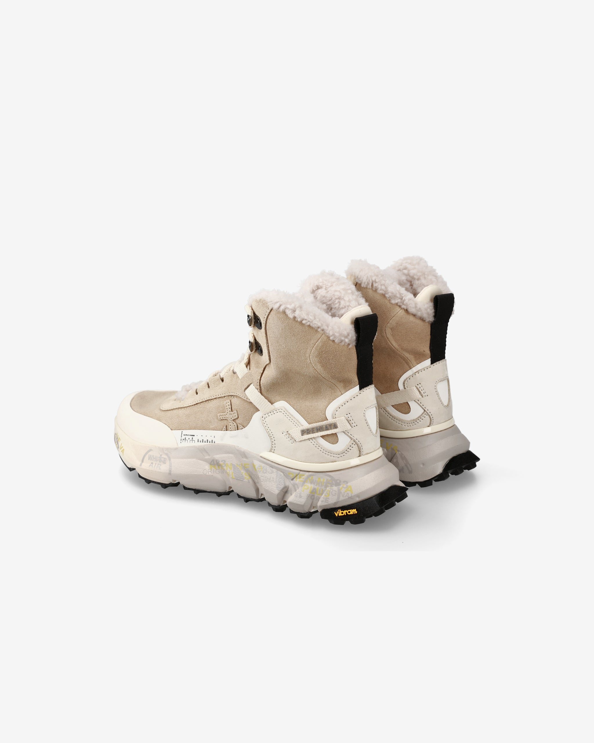 Premiata hiking shoe with rugged and comfortable design and sole suitable for uneven terrain. Sheepskin lined, not waterproof. Ideal for daily use and dry trails.