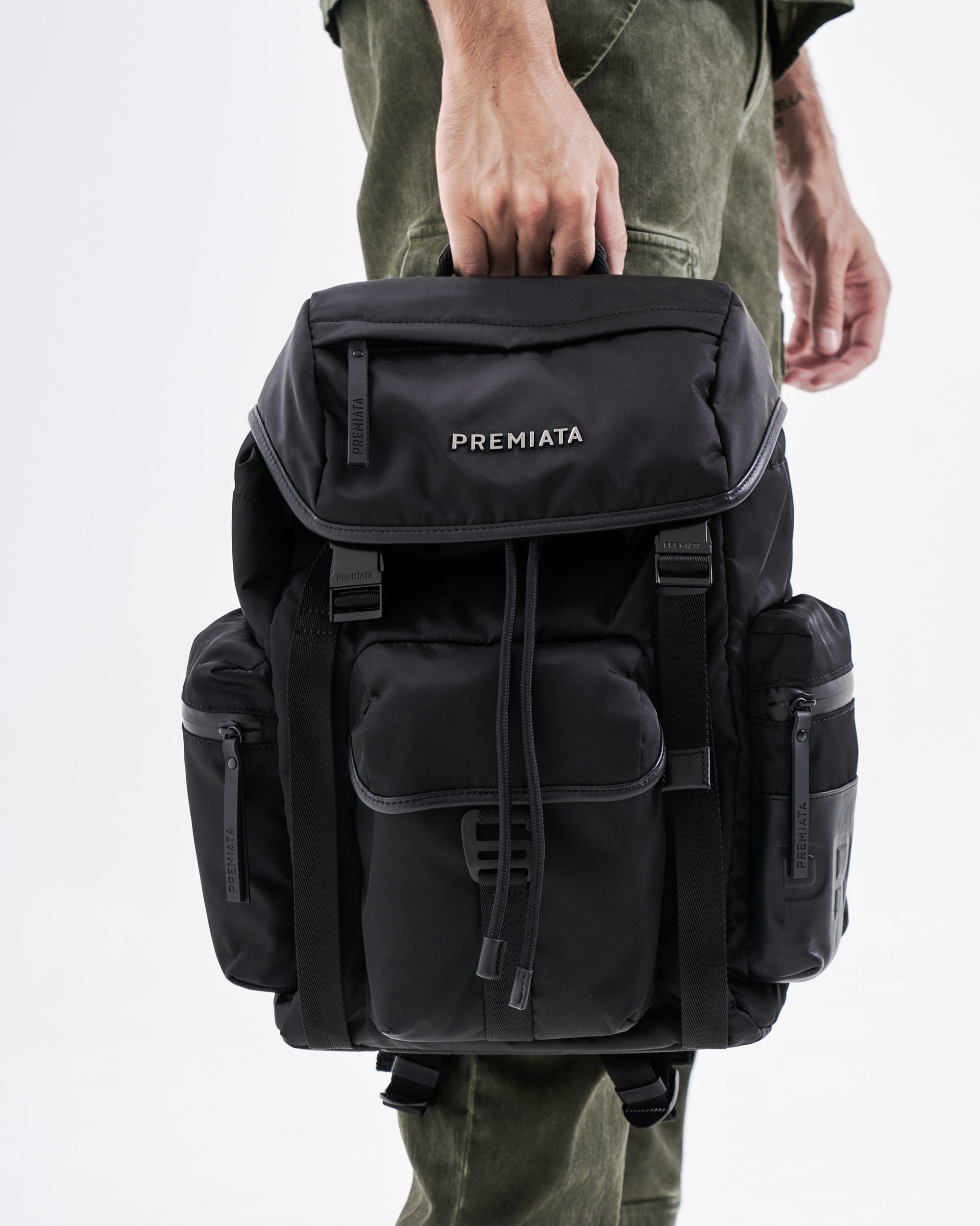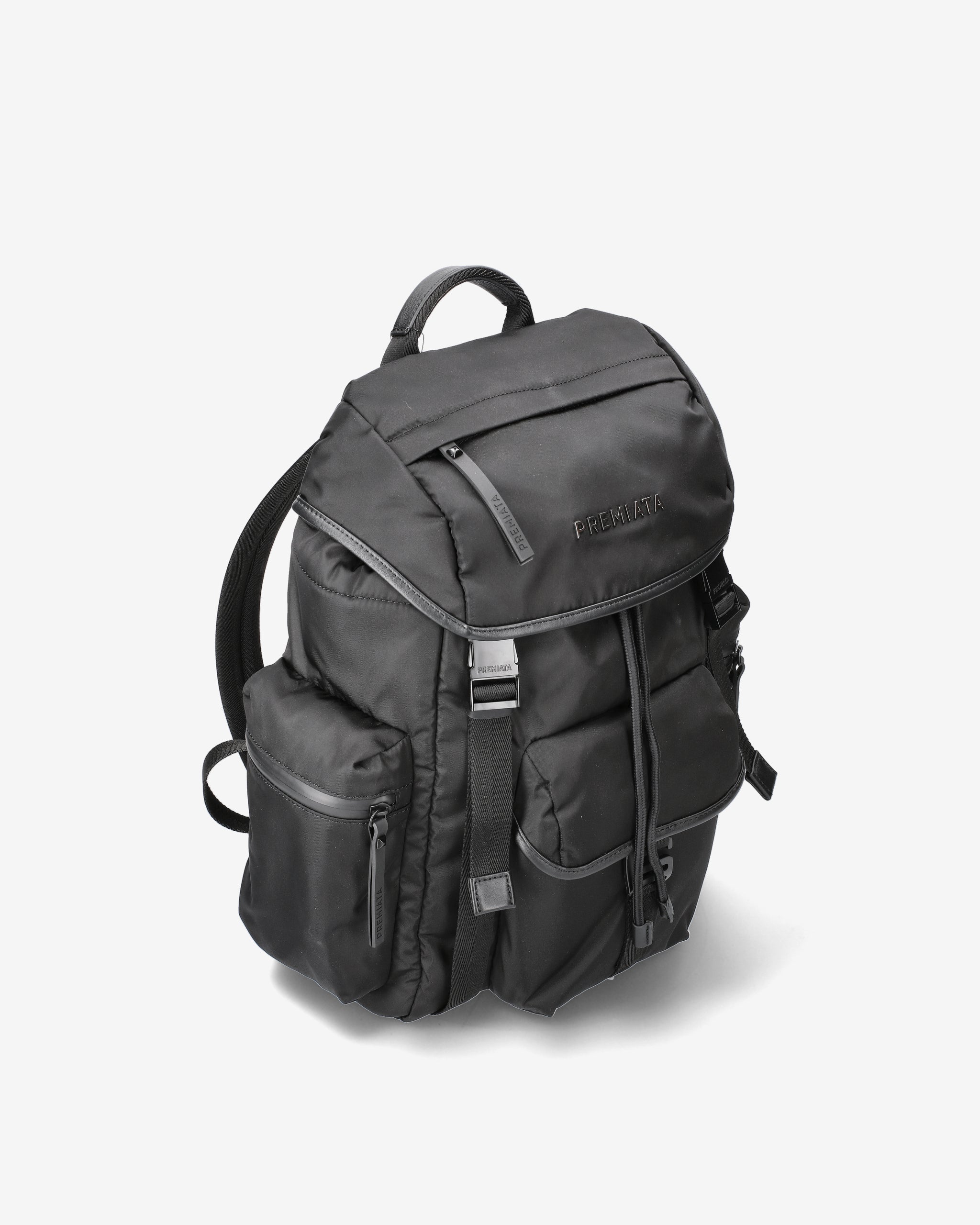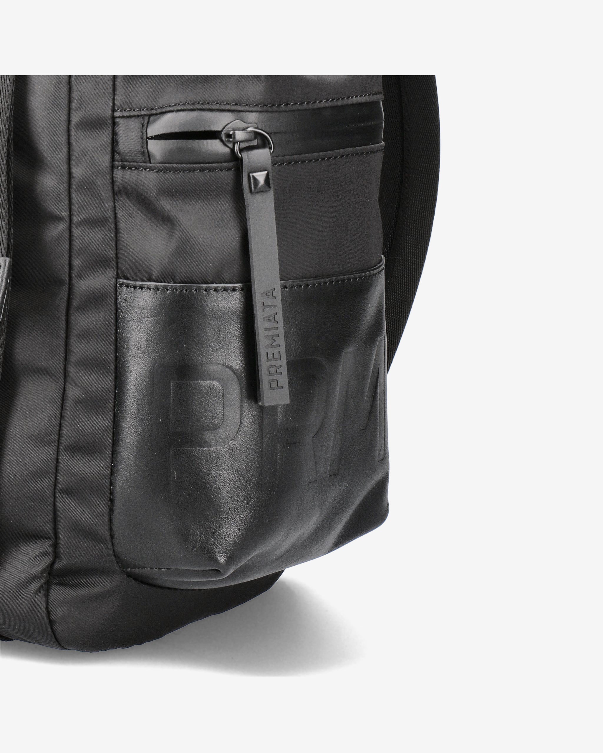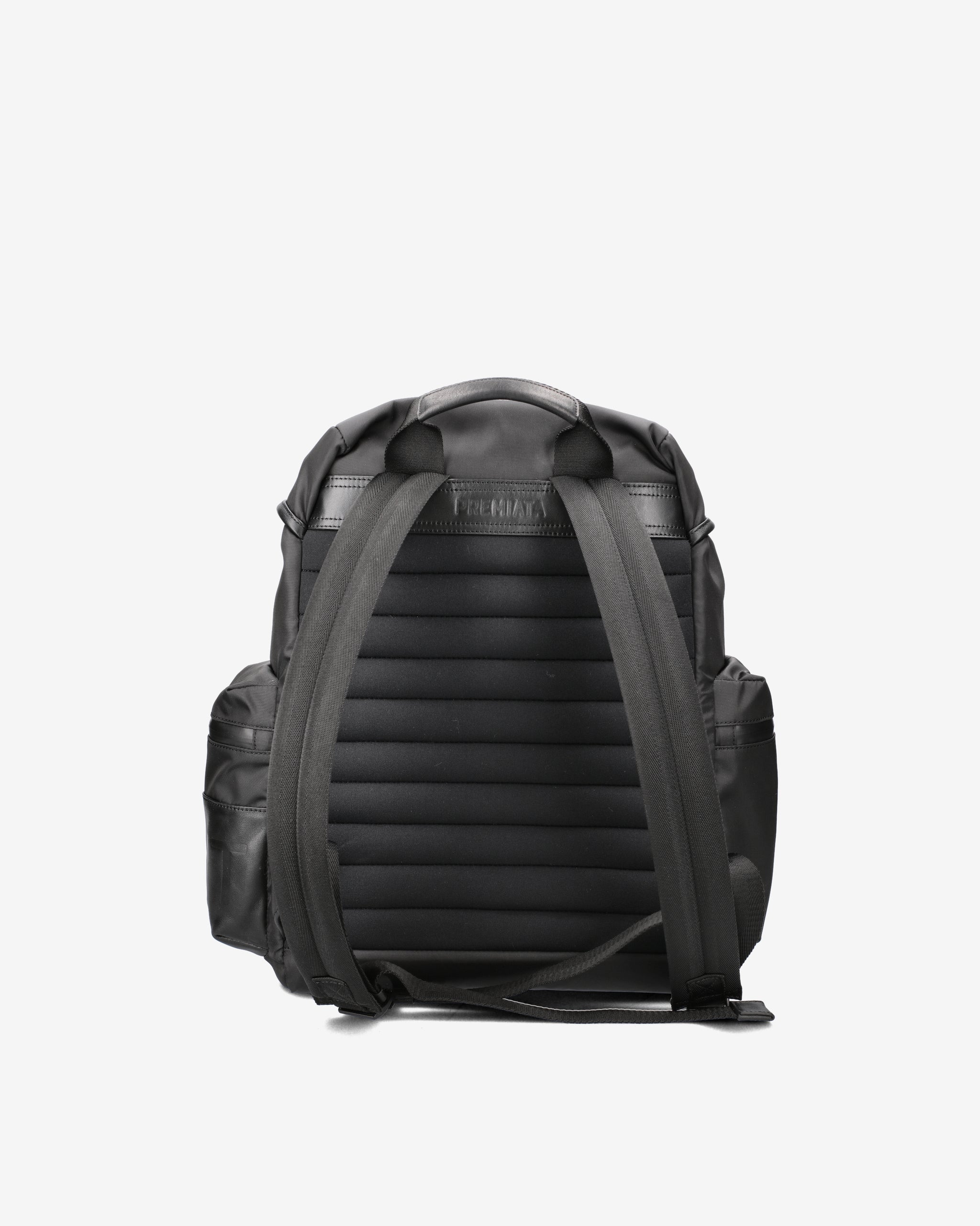 A capacious and versatile model made of premium nylon gabardine with anti-fray and water-repellent treatment. Padded EVA back and shoulder straps for added comfort. Waterproof side pockets with calfskin leather trim and matte metal fasteners.
