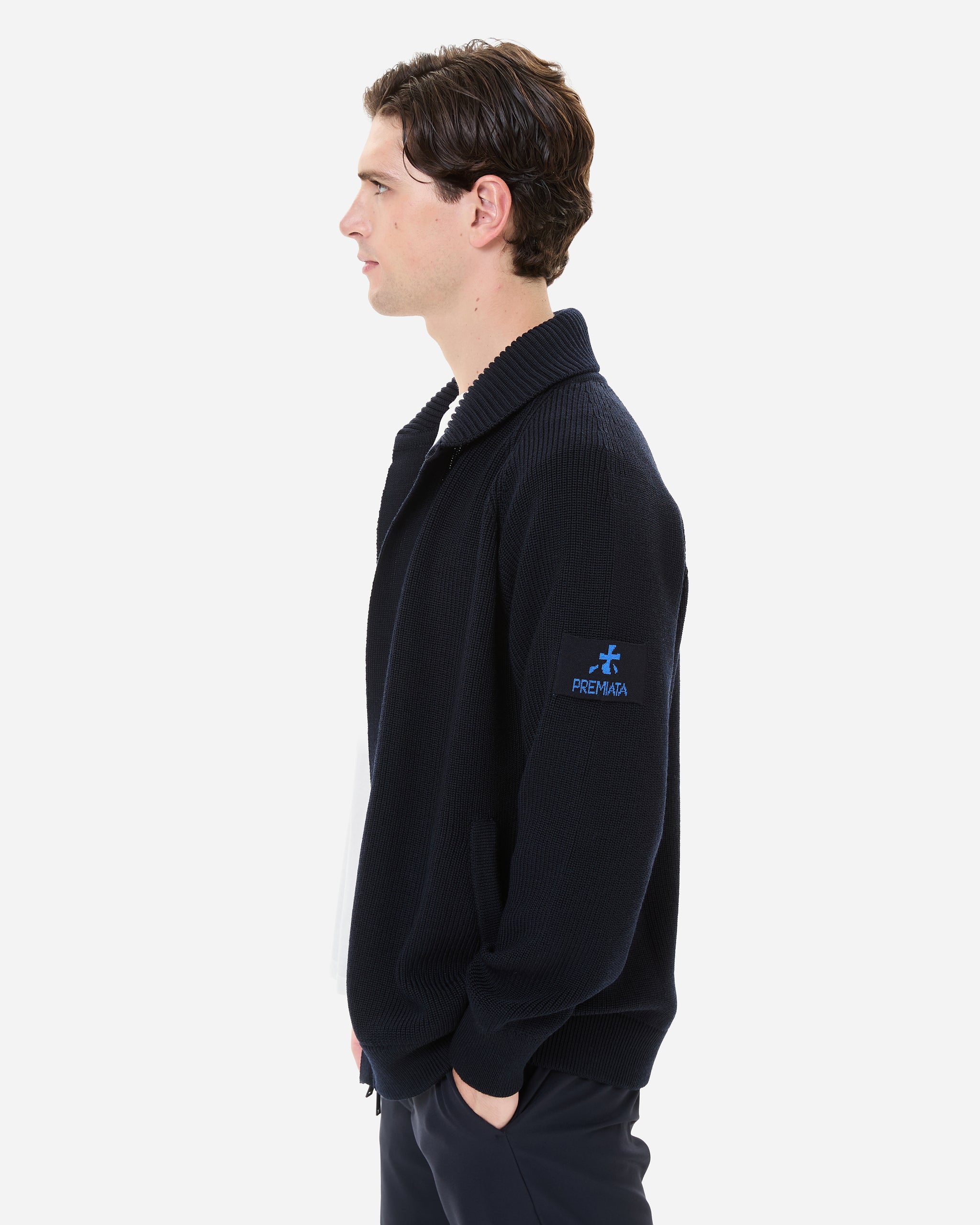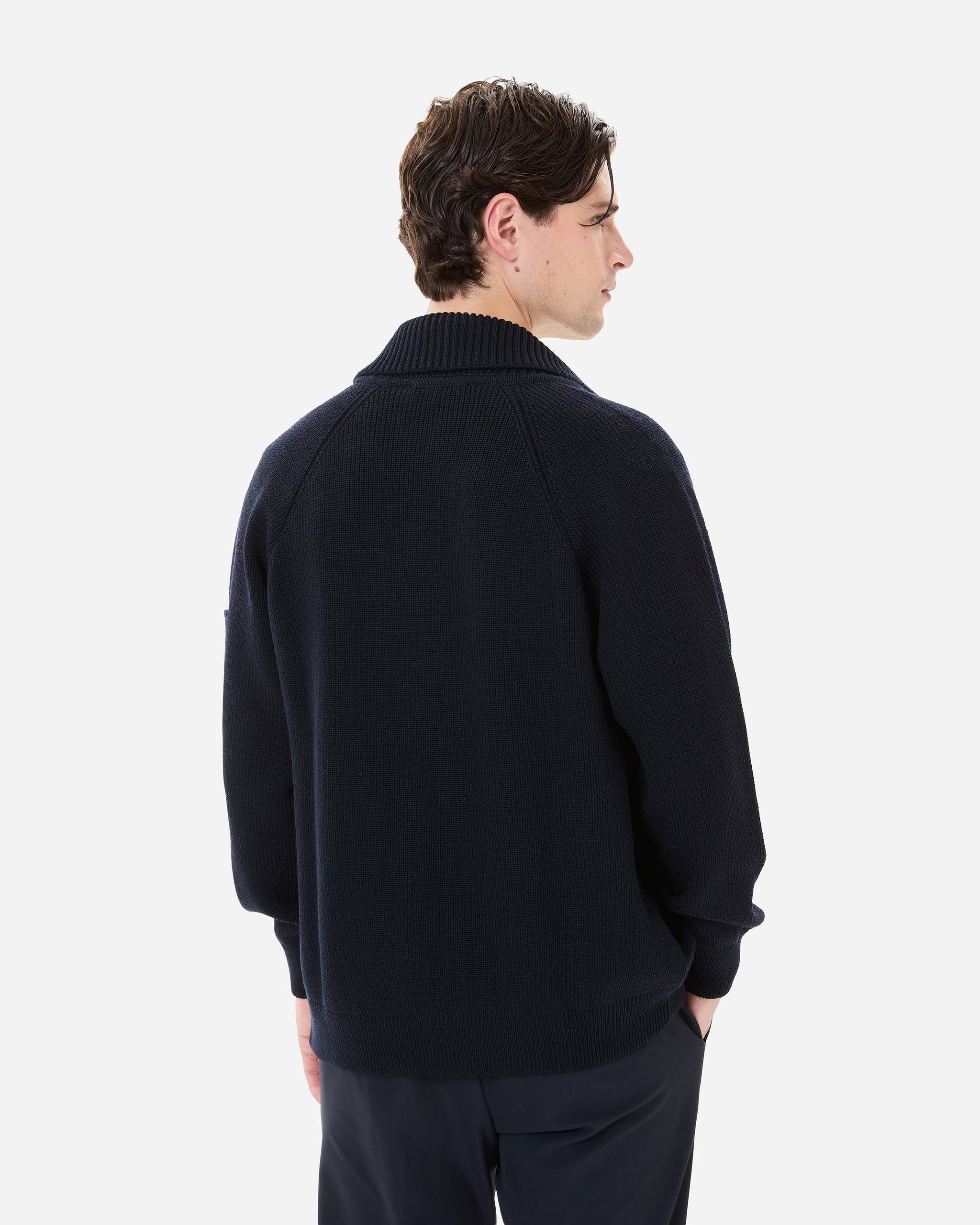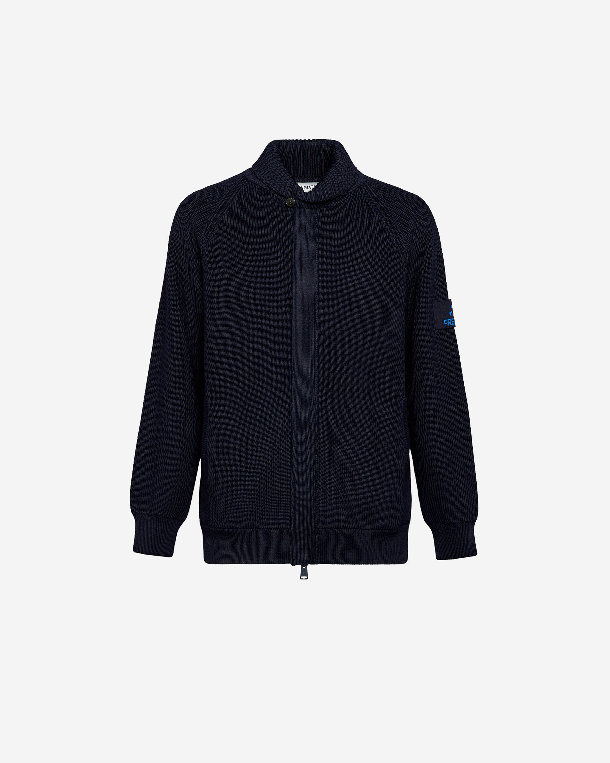 - Shawl collar with 2X2 English knit rib attached with Peter Pan knitting