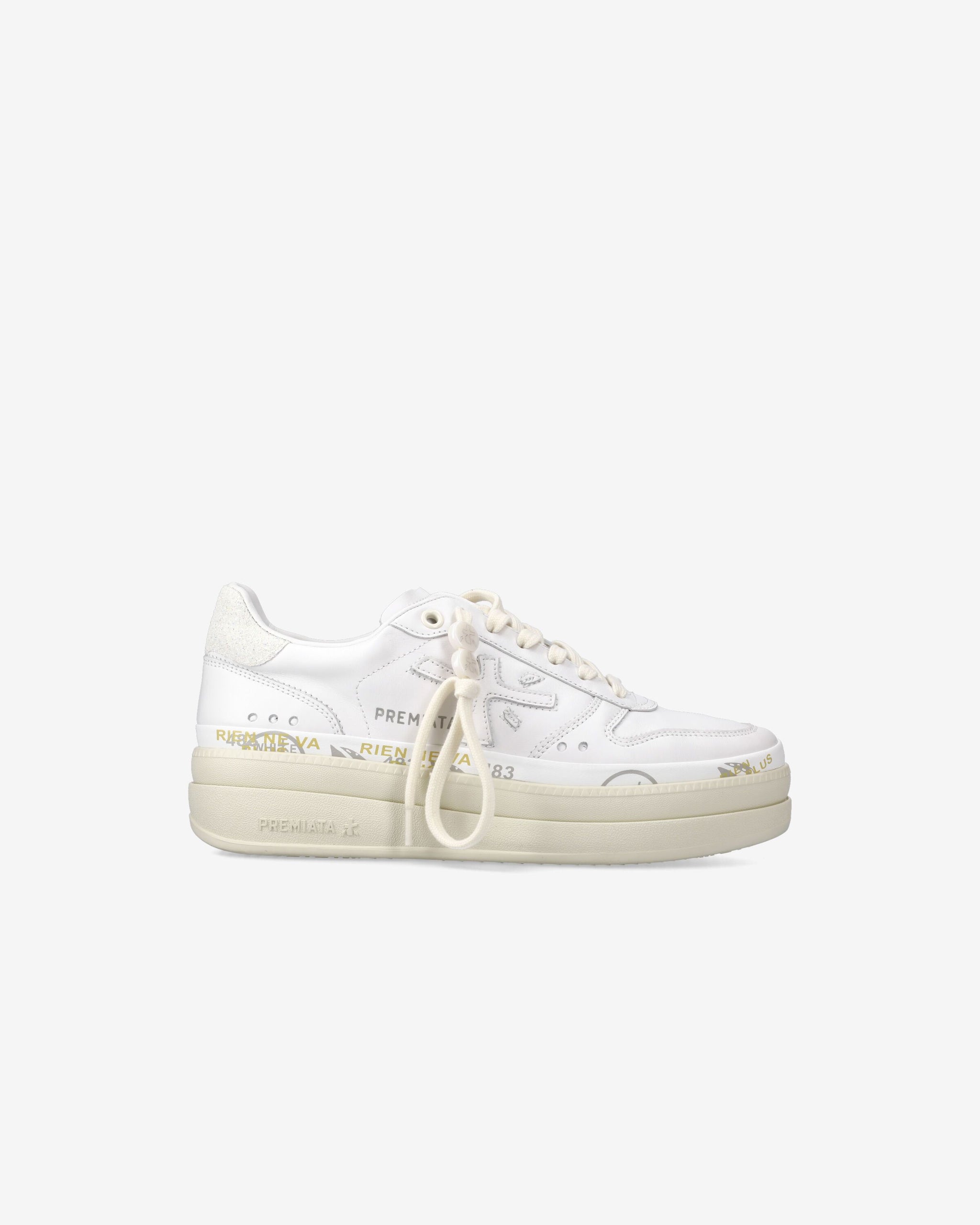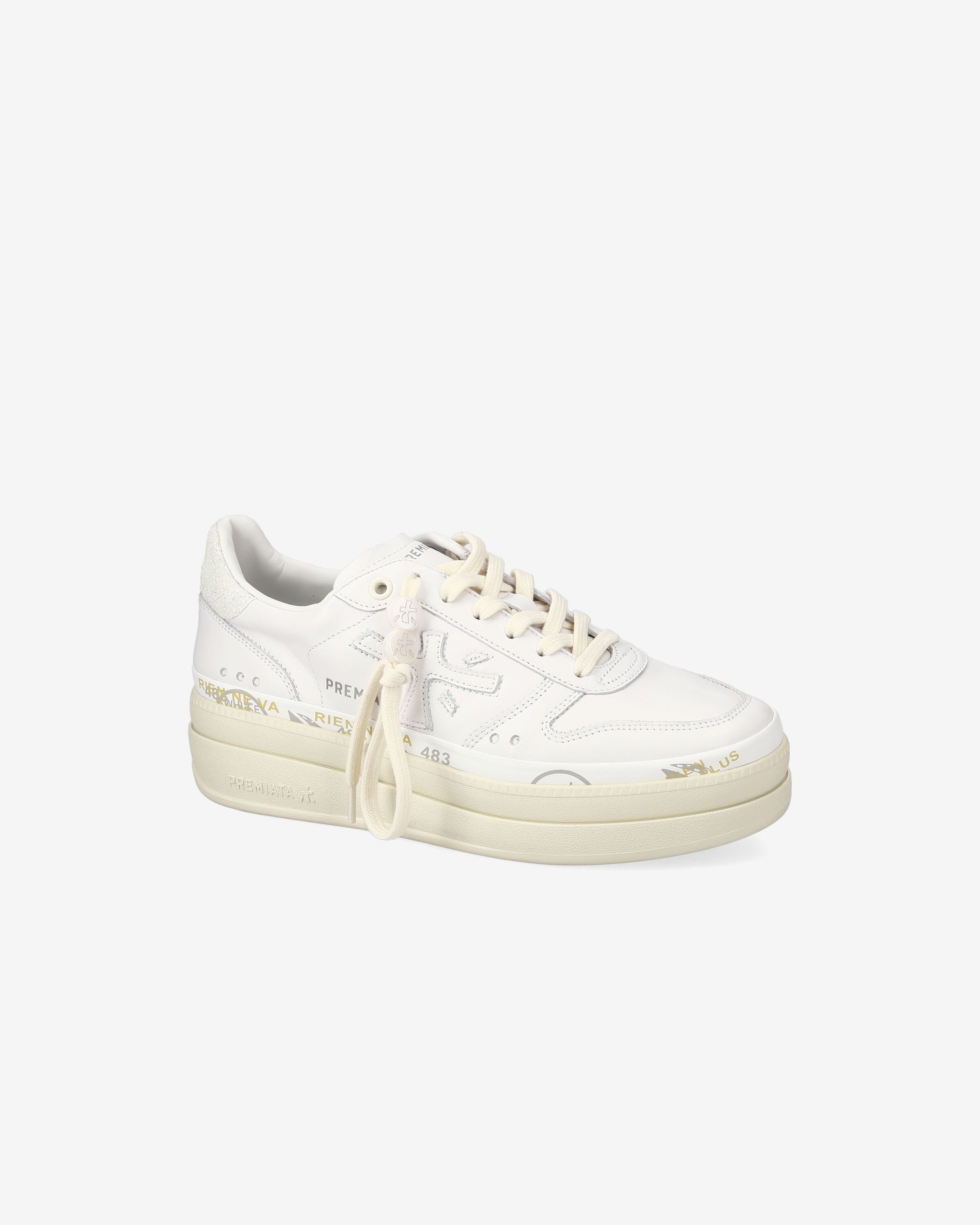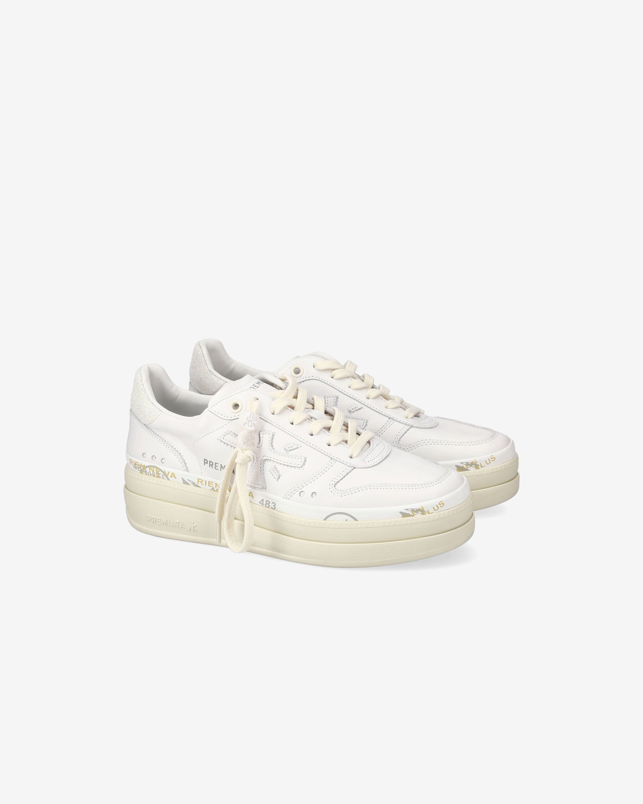 Among Premiata's new must-haves. Style reaches new heights, combining designs such as a double-layered platform sole with a midsole embellished with the brand's iconic stamps.