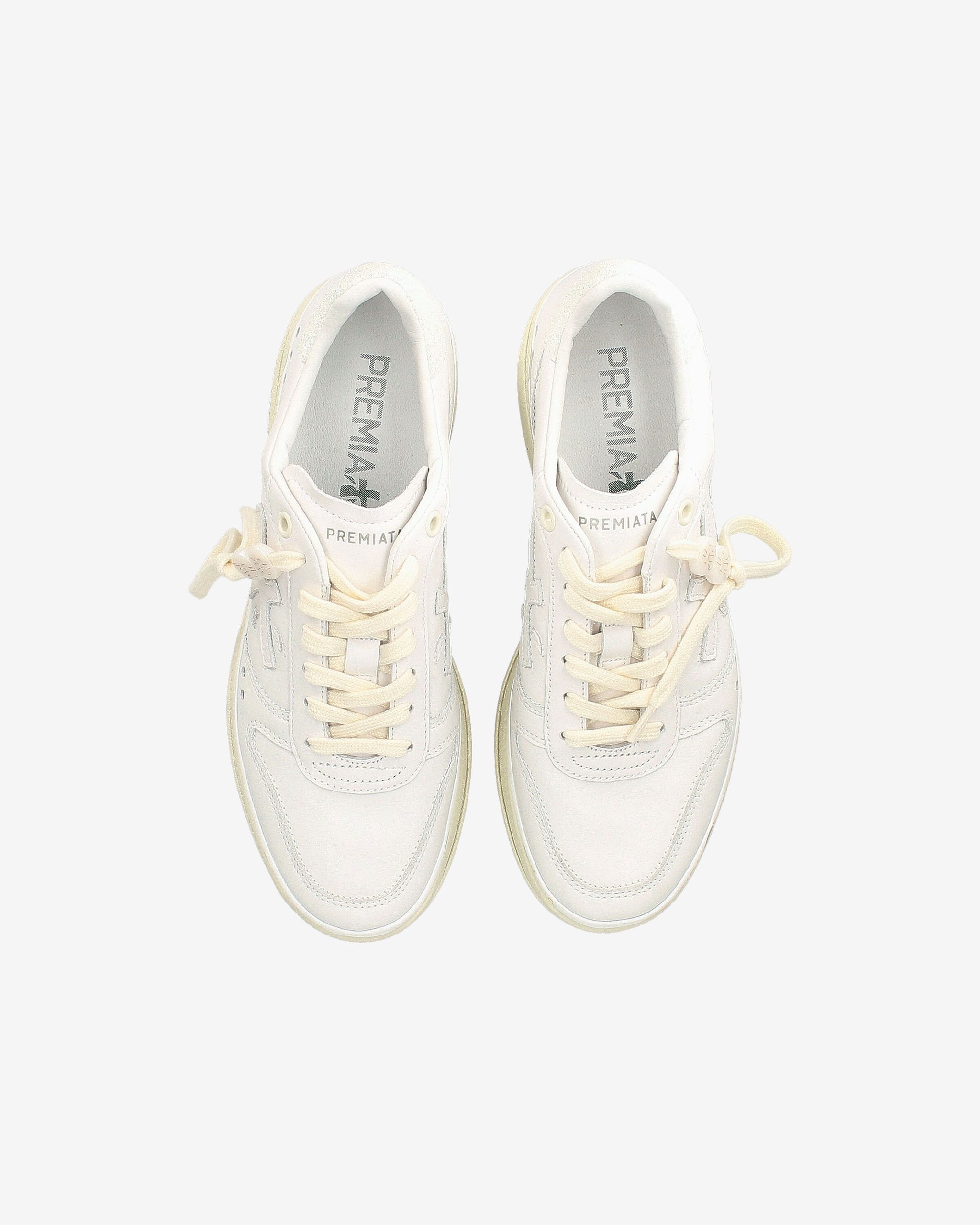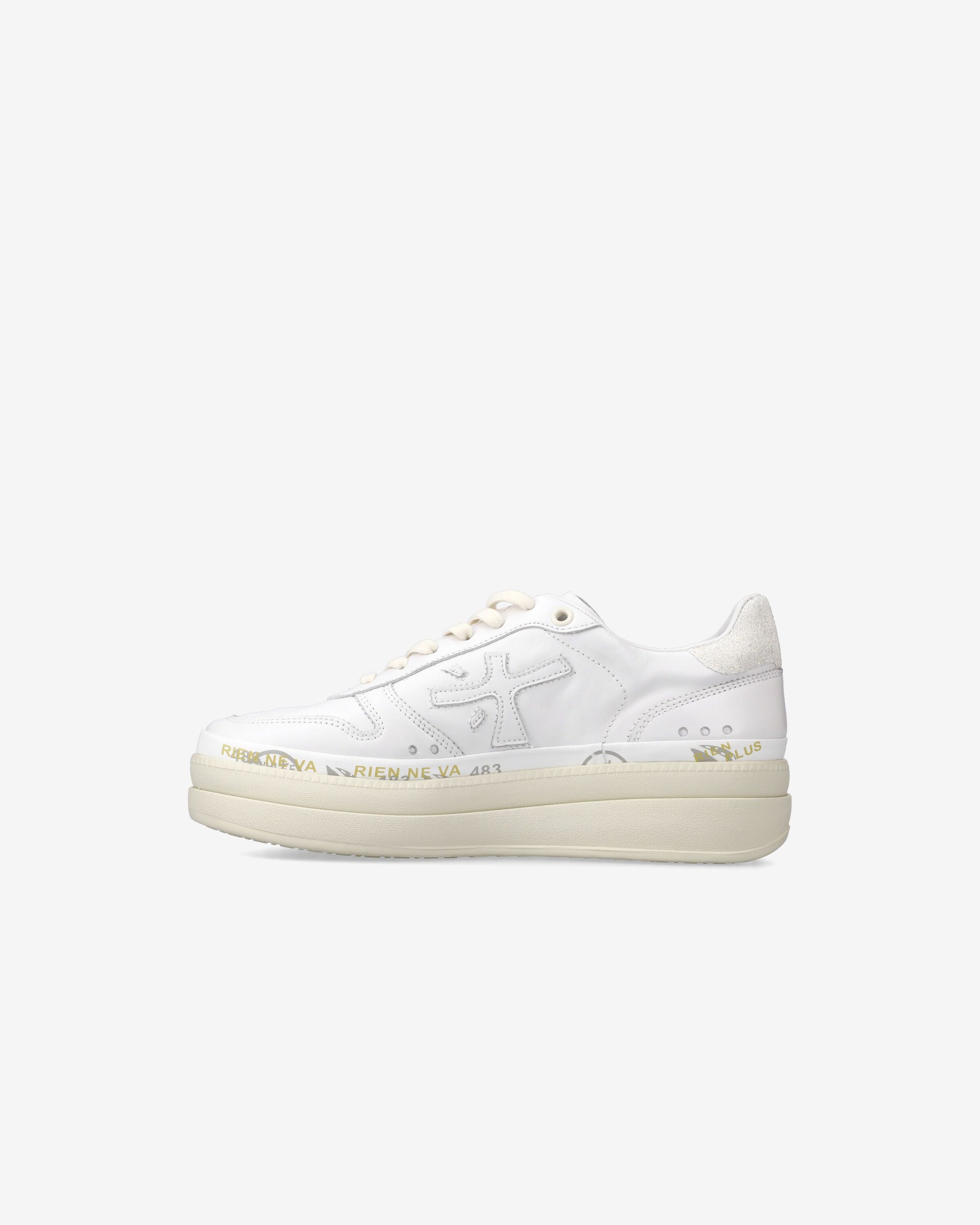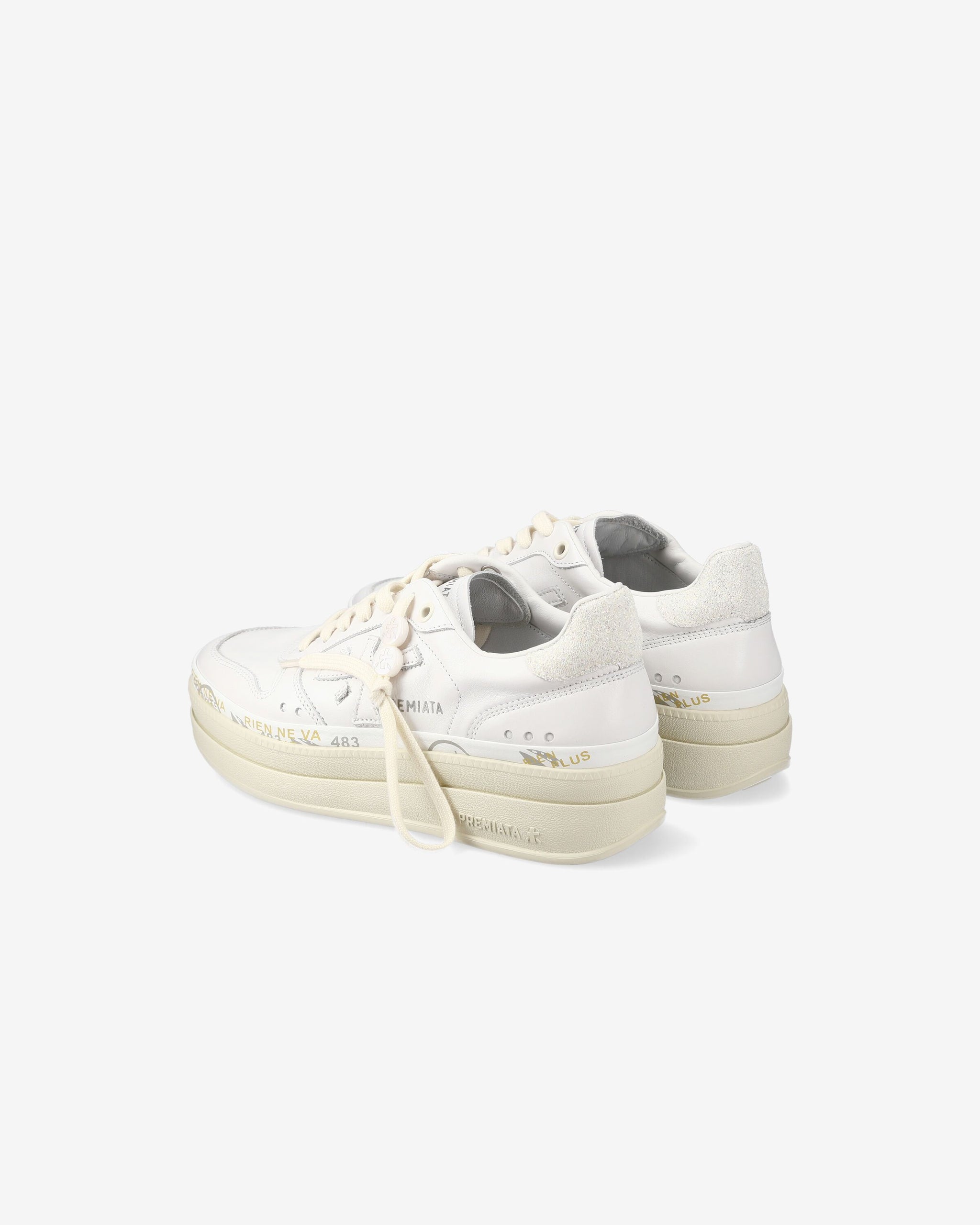 Among Premiata's new must-haves. Style reaches new heights, combining designs such as a double-layered platform sole with a midsole embellished with the brand's iconic stamps.
