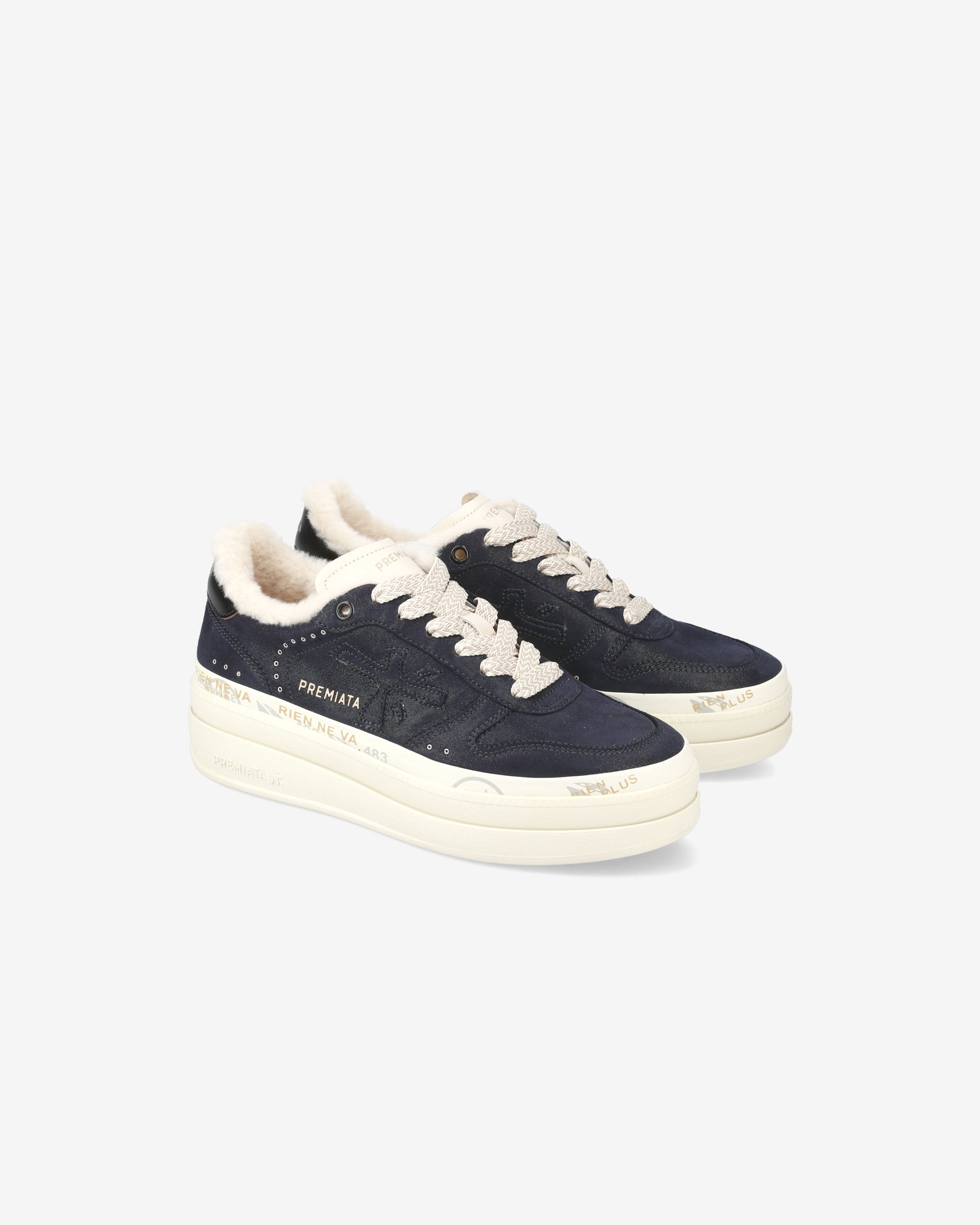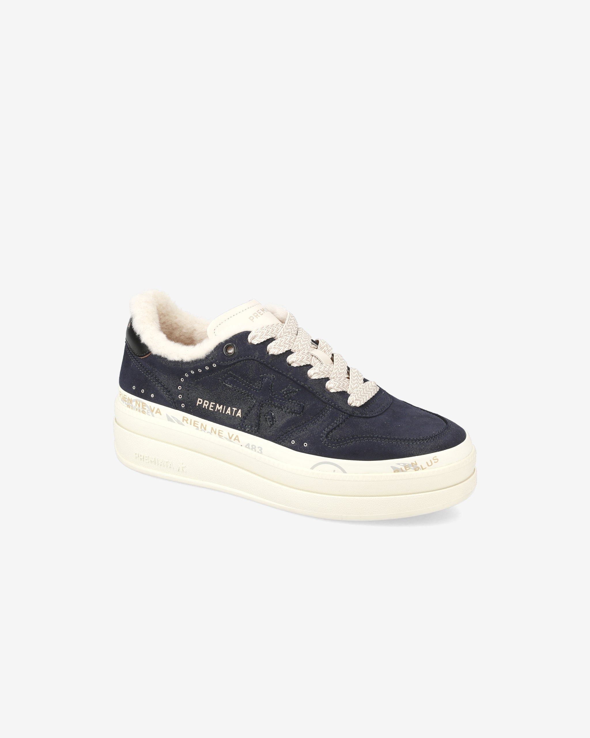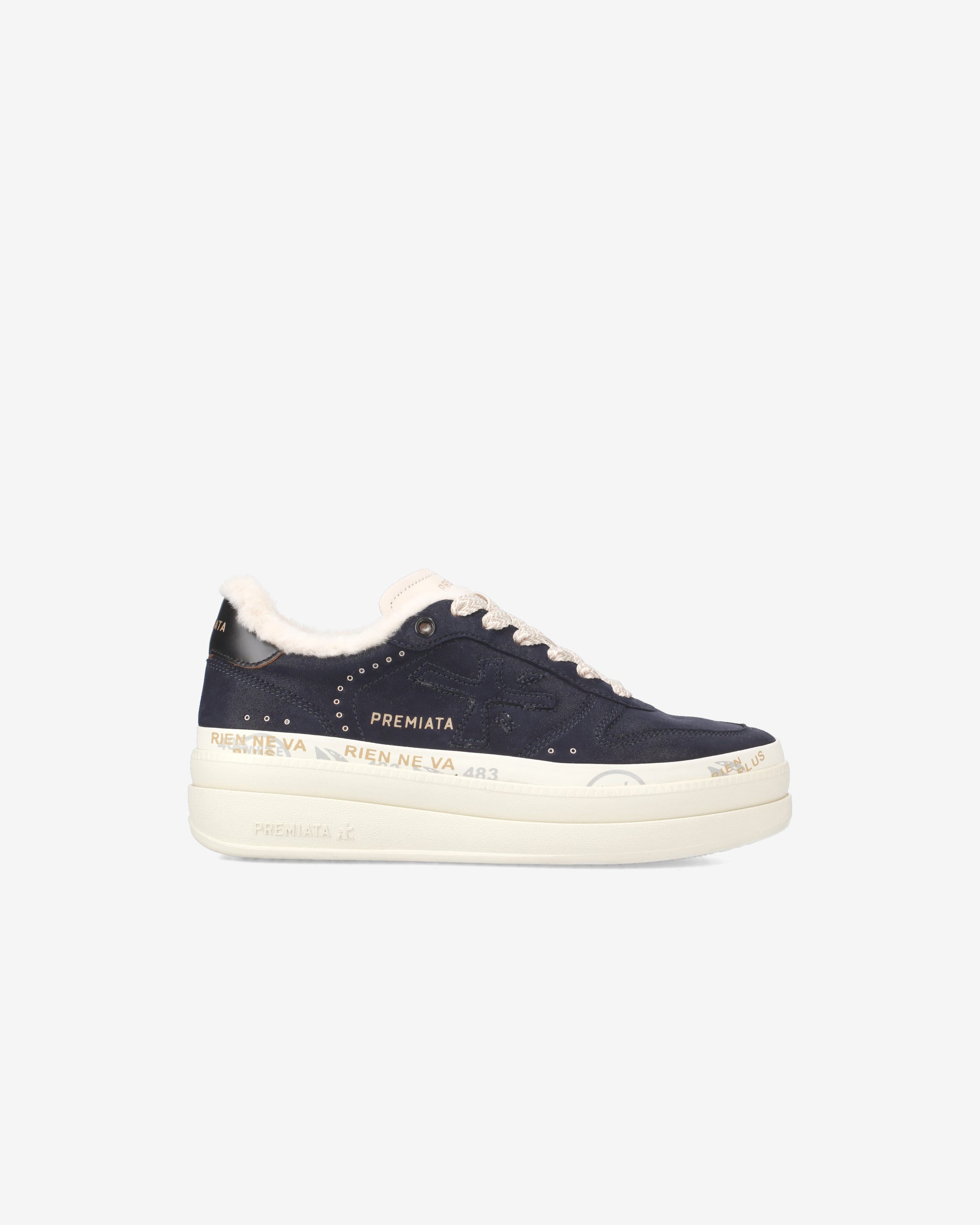 Among Premiata's new must-haves. Style reaches new heights, combining designs such as a double-layered platform sole with a midsole embellished with the brand's iconic stamps and a sheepskin-lined interior.