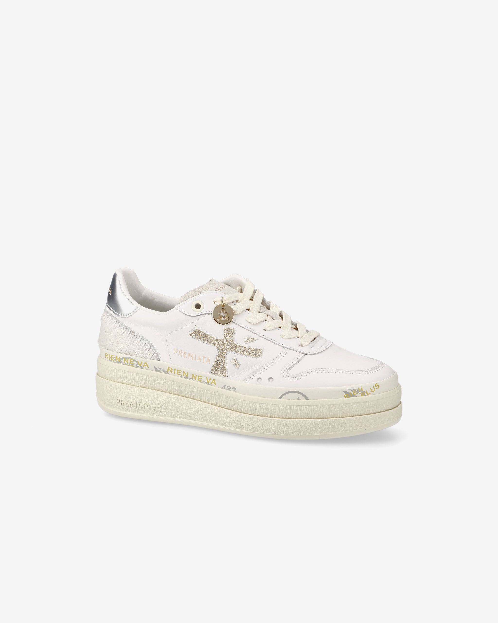 Among Premiata's new must-haves. Style reaches new heights, combining designs such as a double-layered platform sole with a midsole embellished with the brand's iconic stamps.