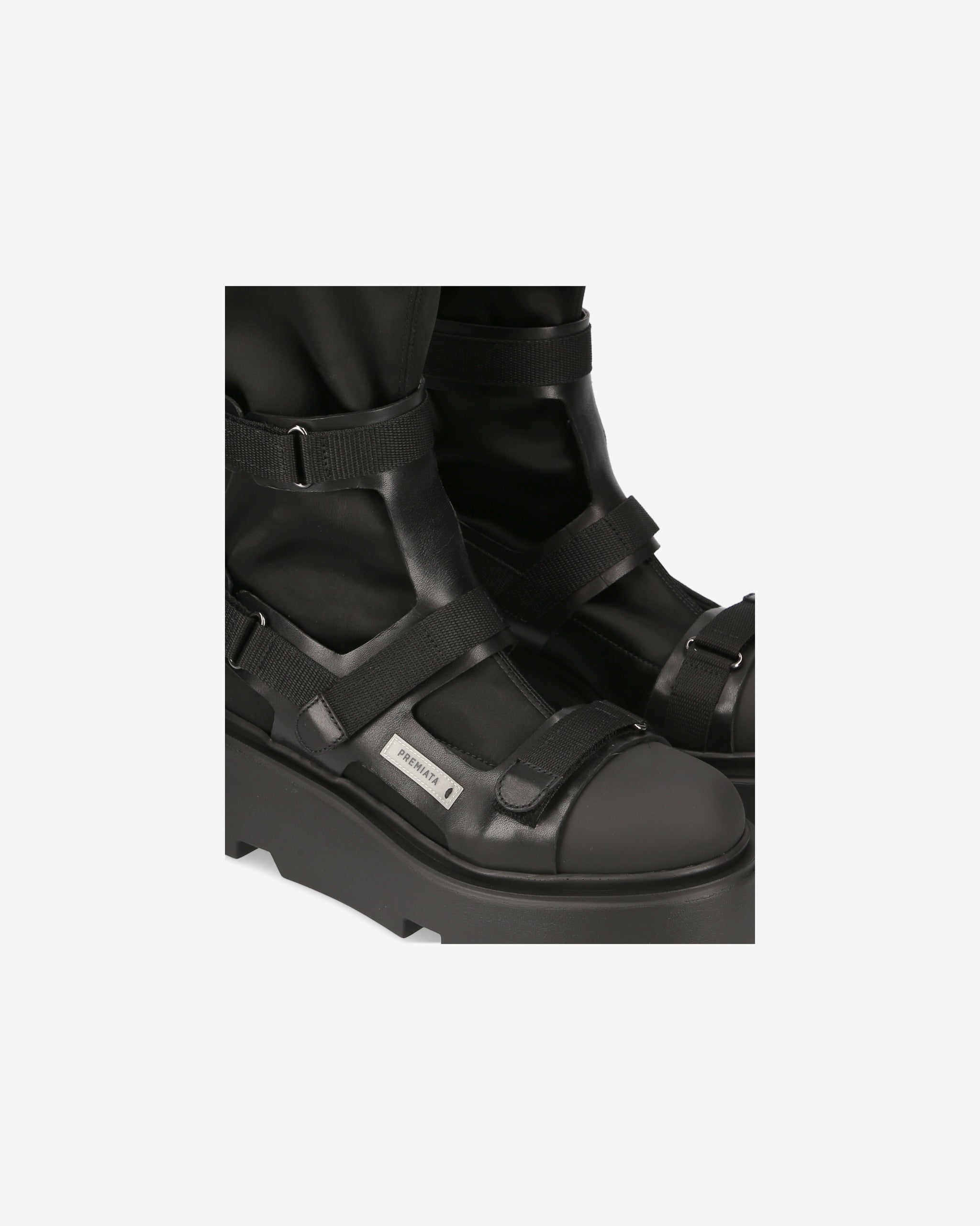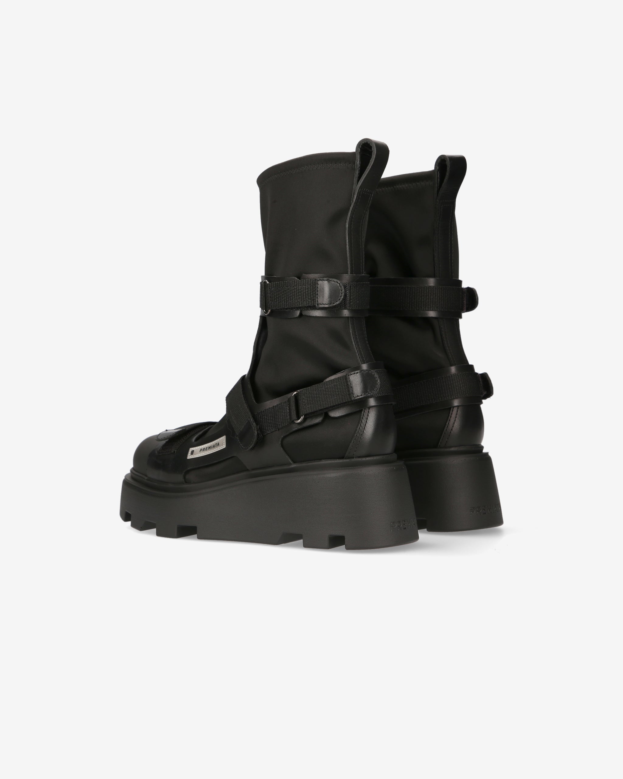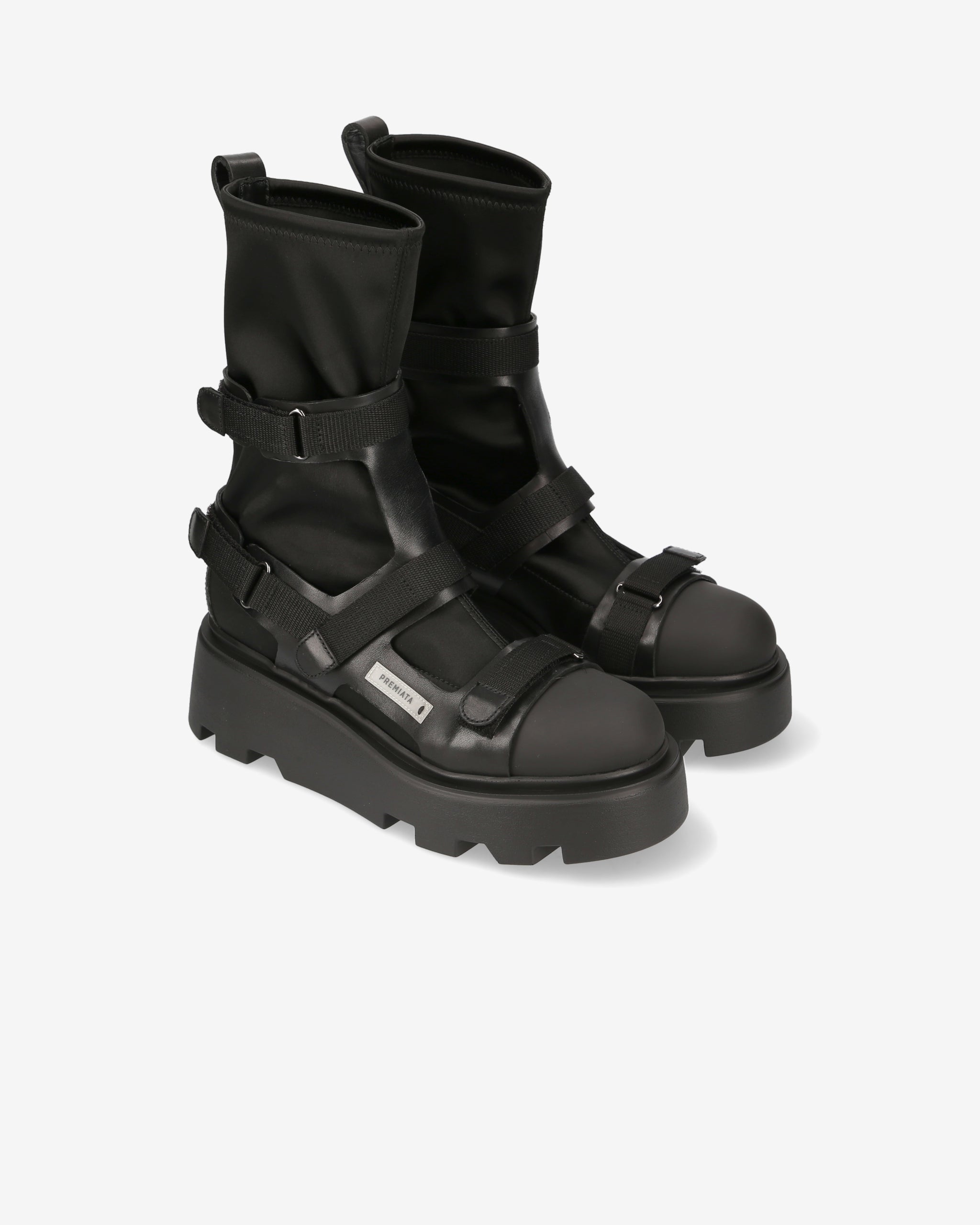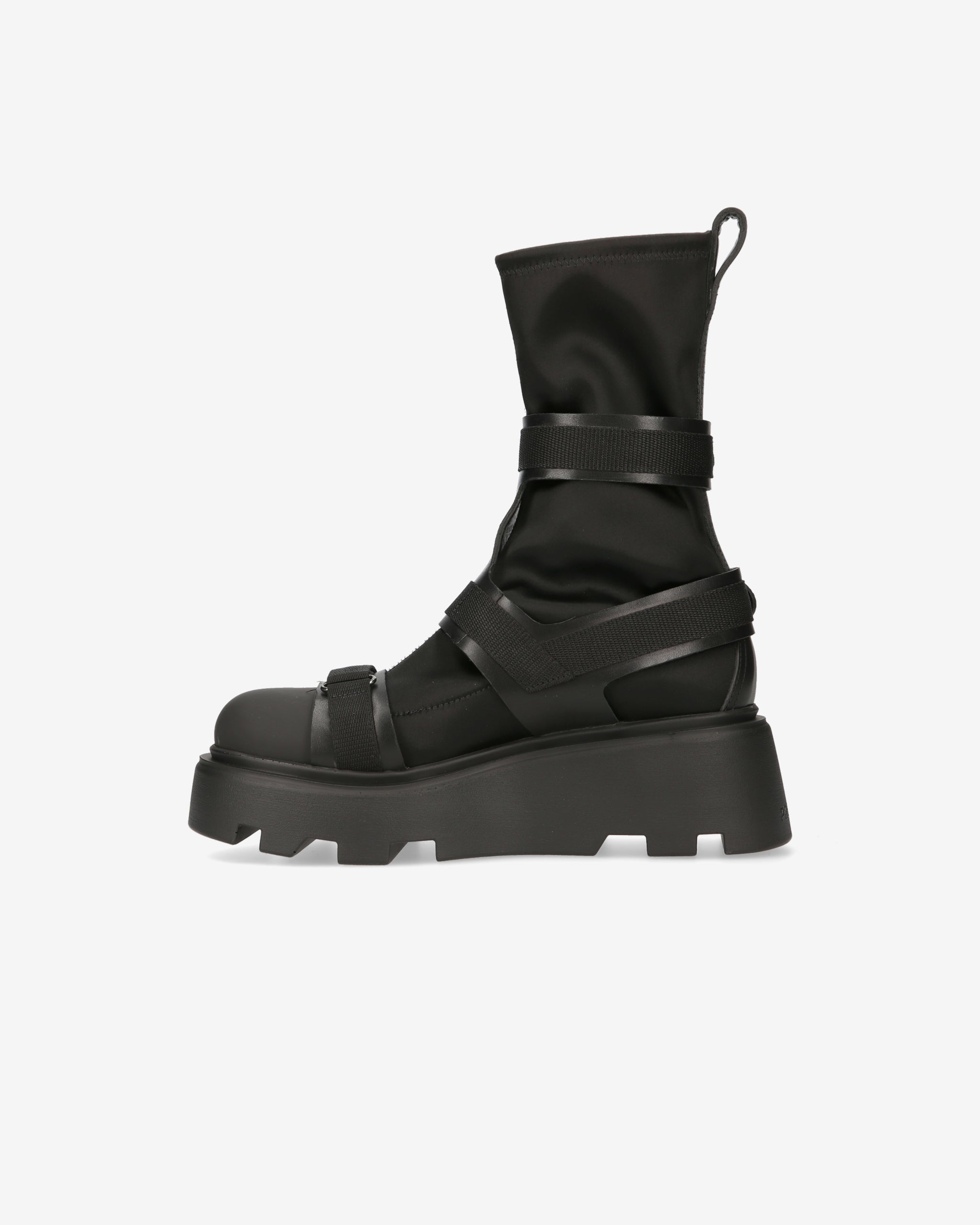 Eleganza rock per degli stivaletti in raso e pelle, caratterizzati da una doppia struttura in velcro che sovrasta la tomaia. Spicca sul laterale in logo lettering che ha sempre contraddistinto il brand.