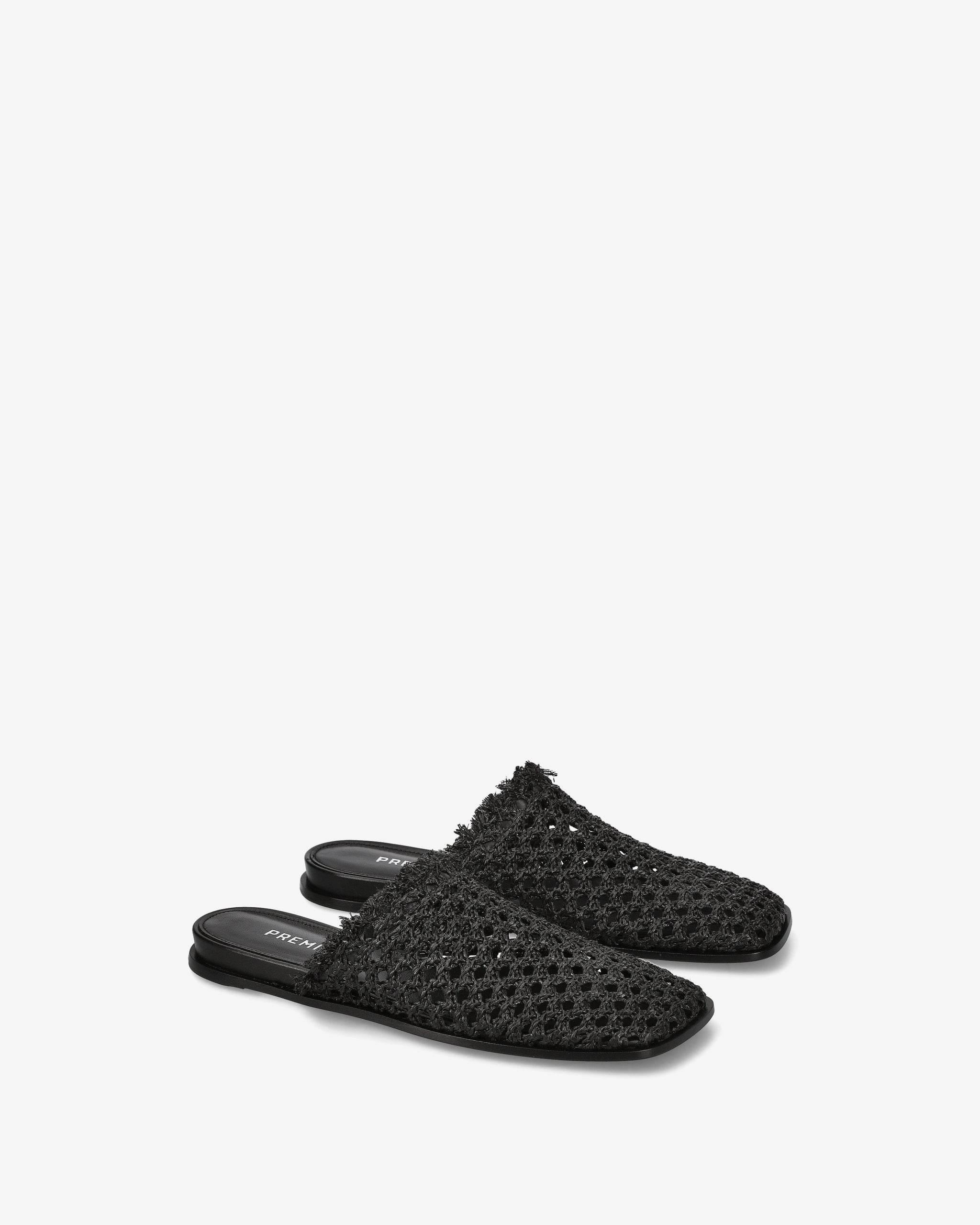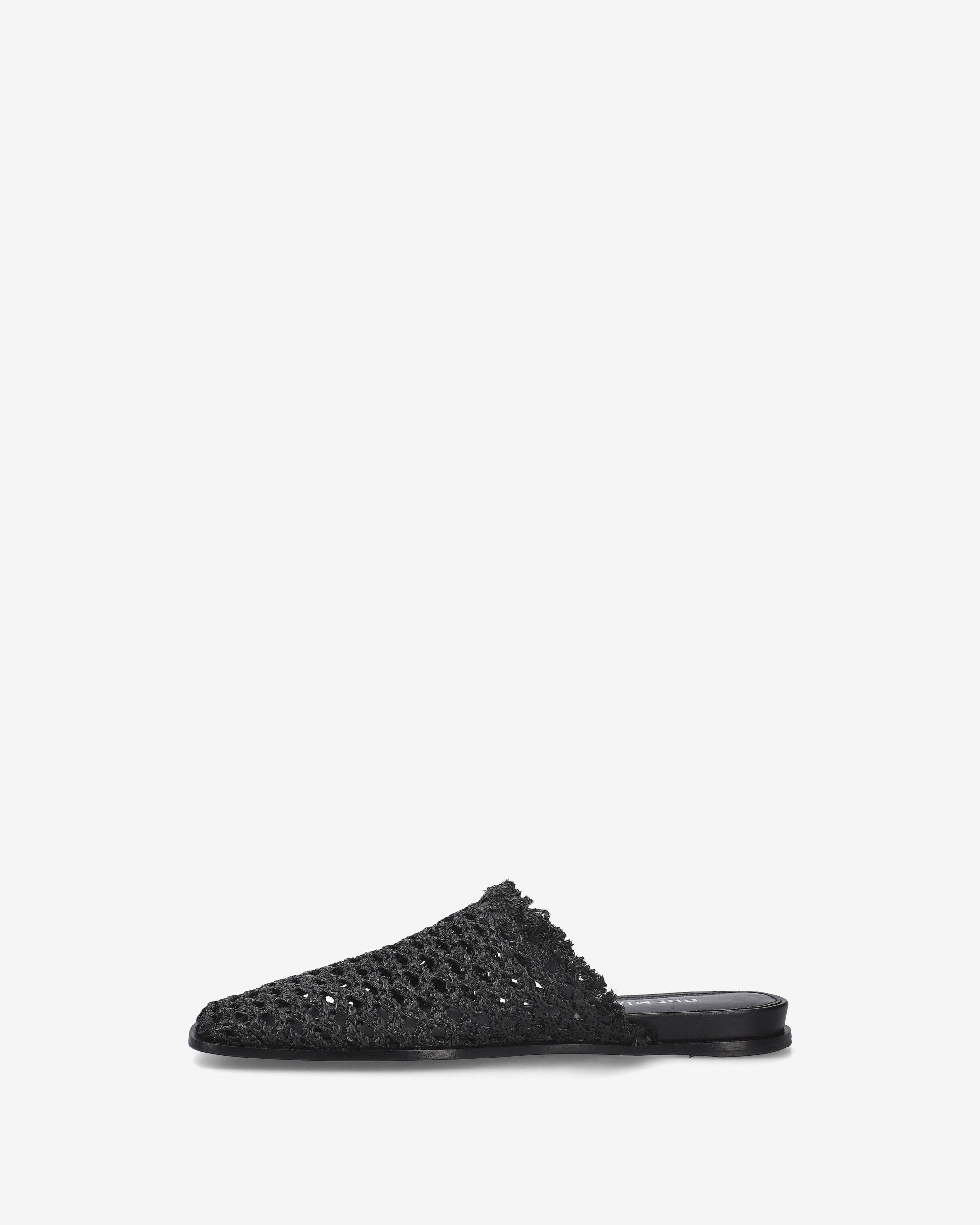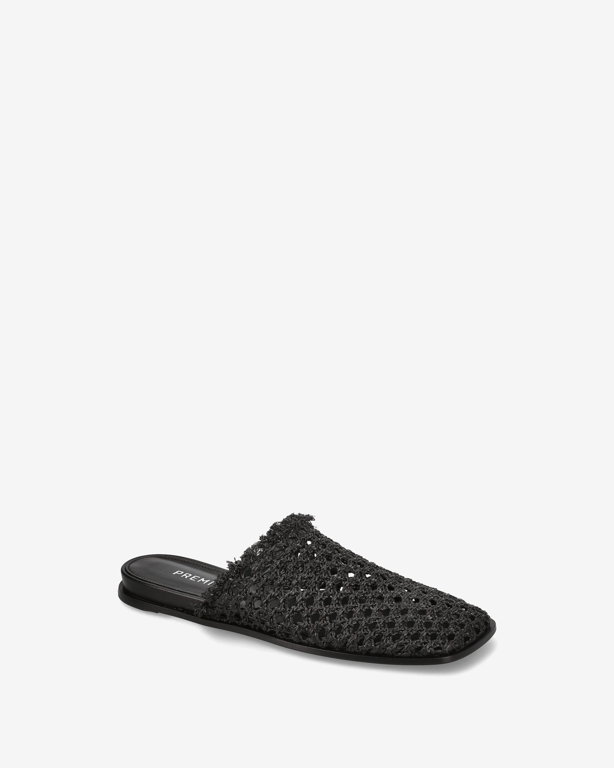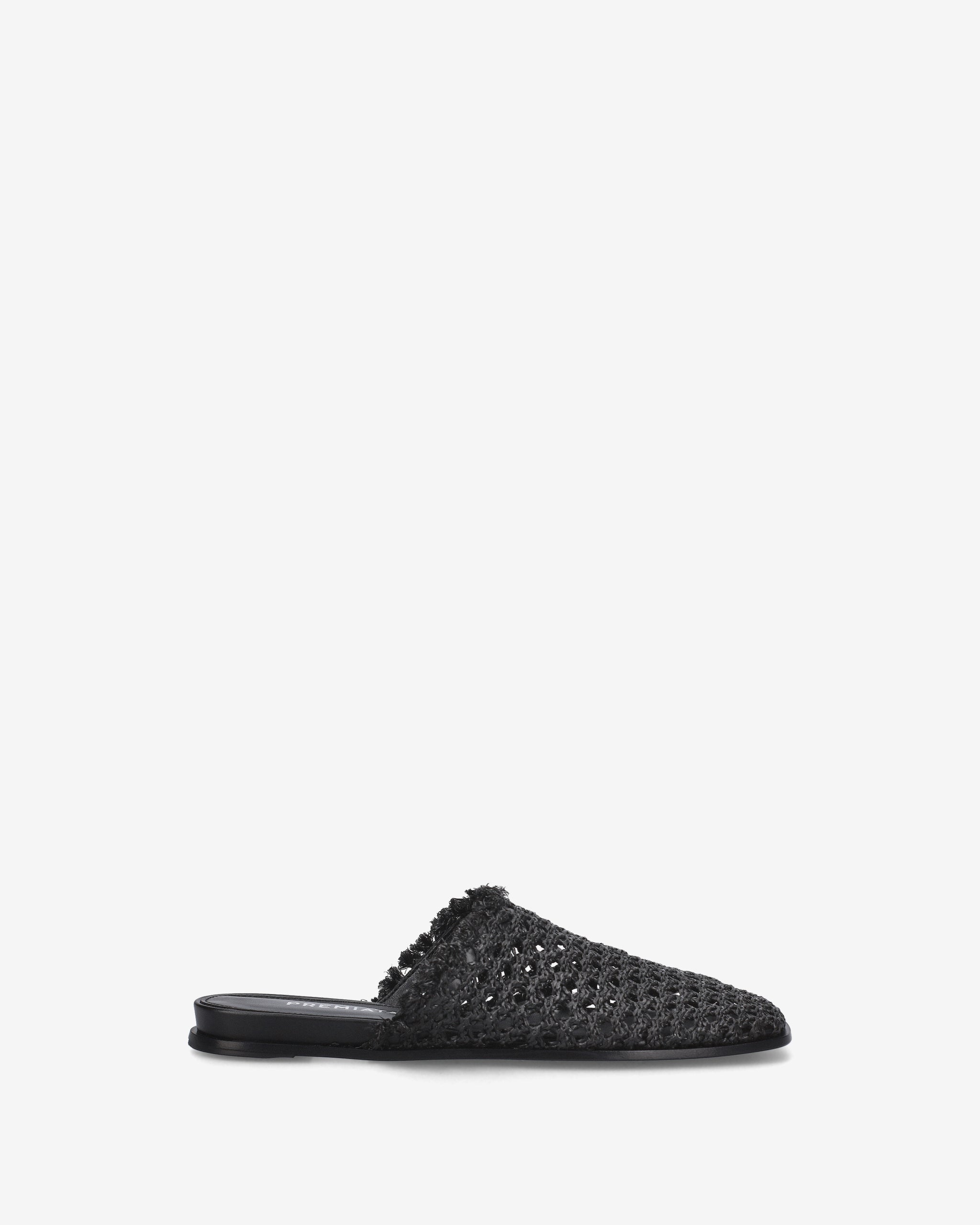Elegant and versatile sabot sandals made from perforated woven raffia, with a raw-cut neckline finished with fringed details. The internal wedge has a flat square shape, ensuring comfort and style for every occasion.