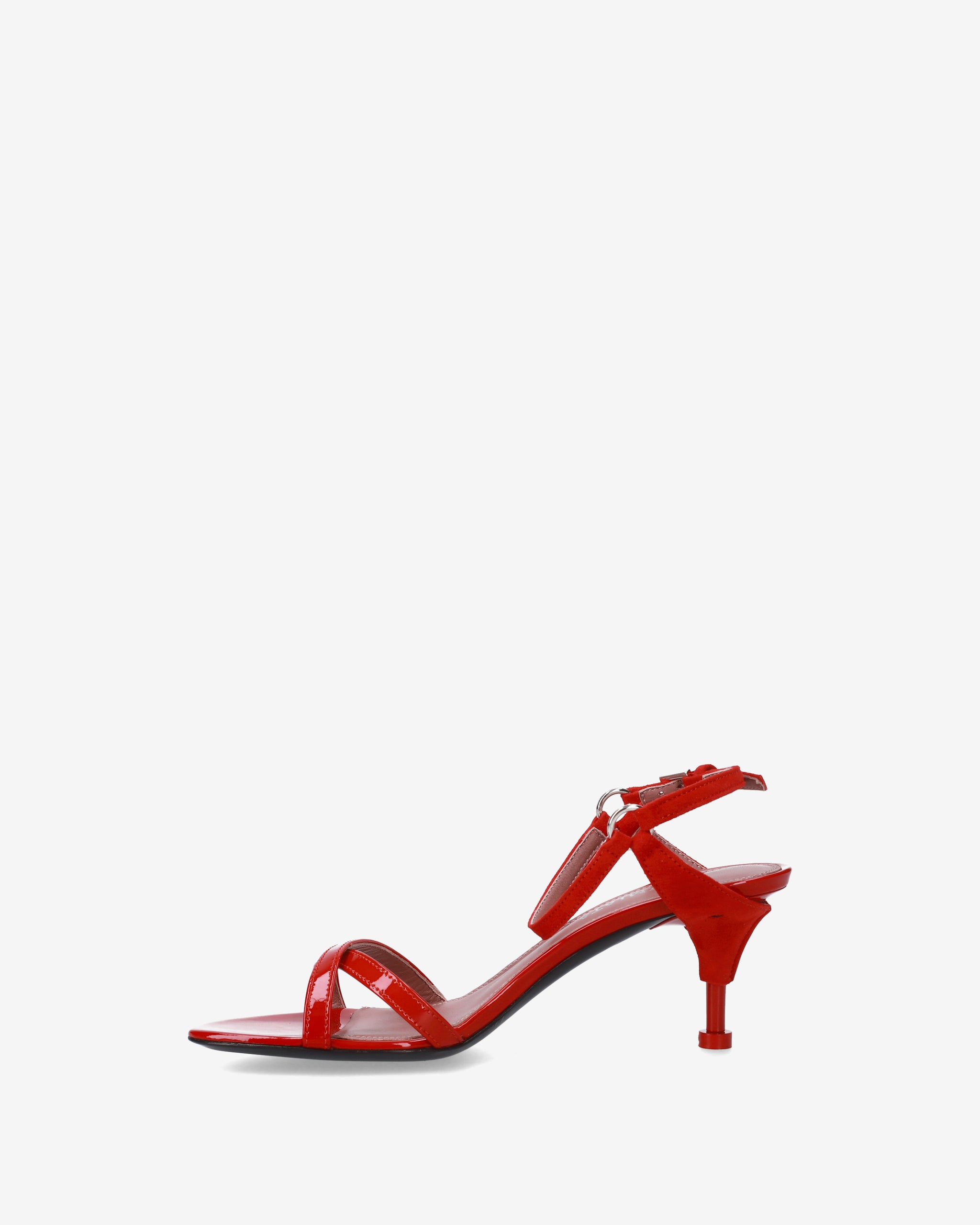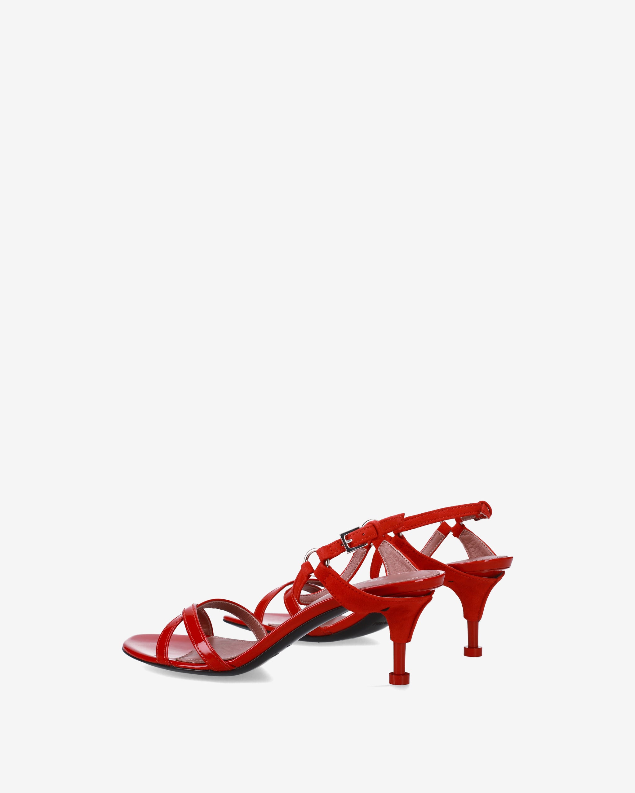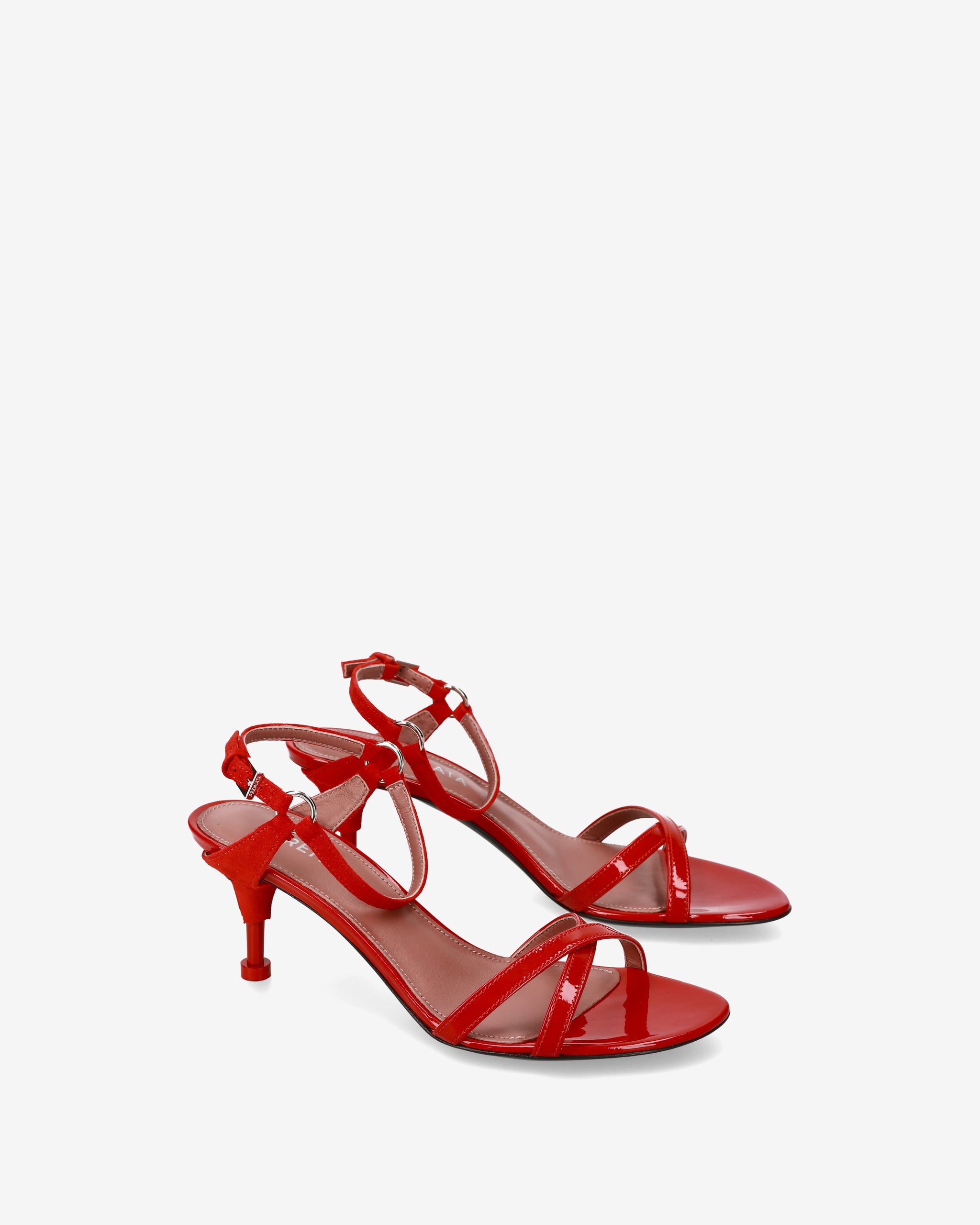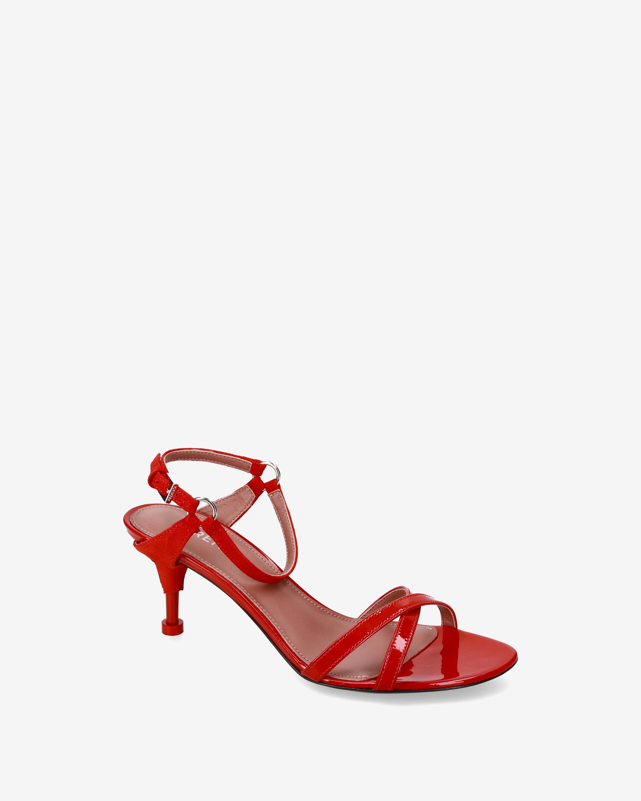 Cross-strap sandal in red patent leather, with heel and strap partially covered in fine red suede. The elegant and bold design is completed by a 60mm heel.