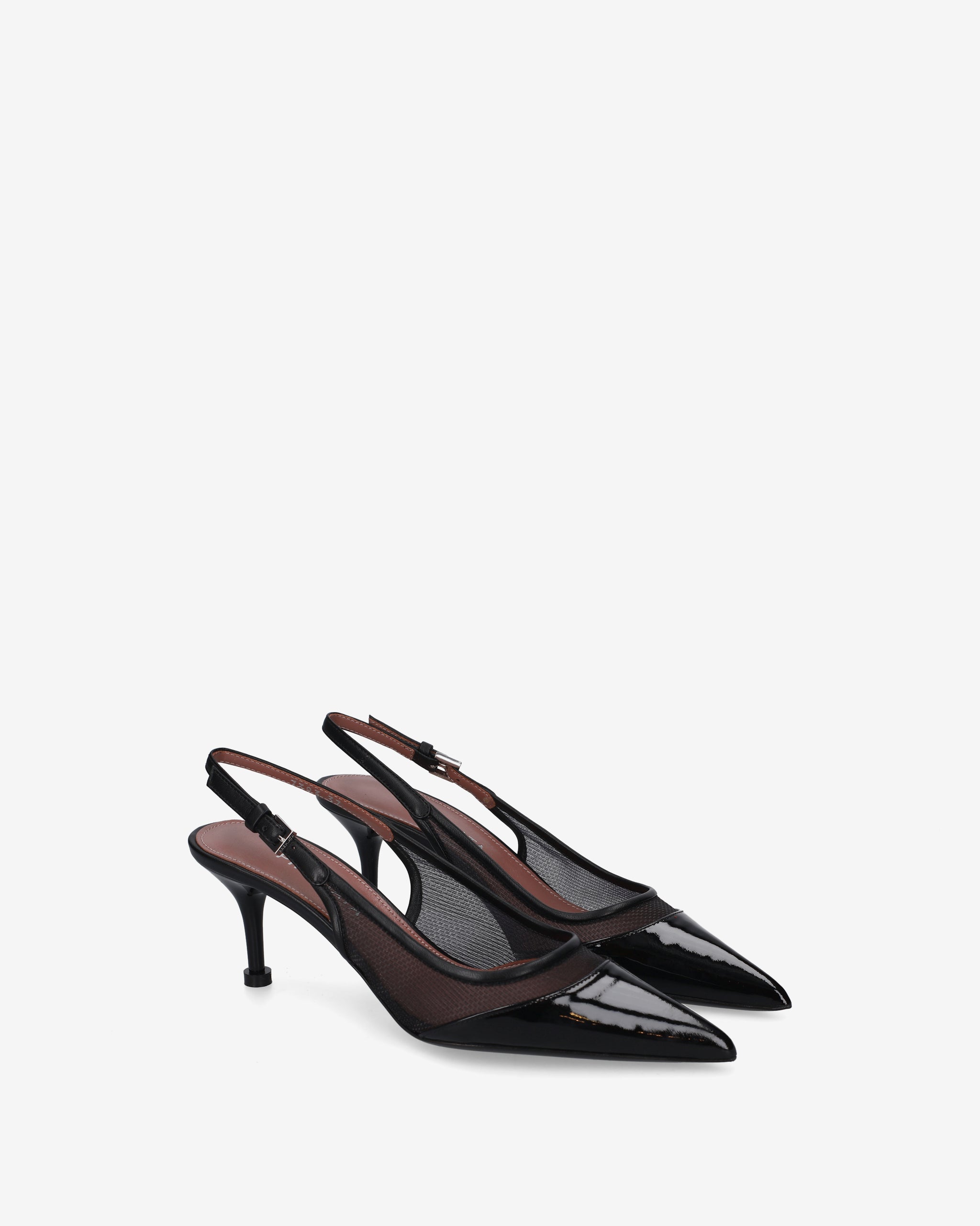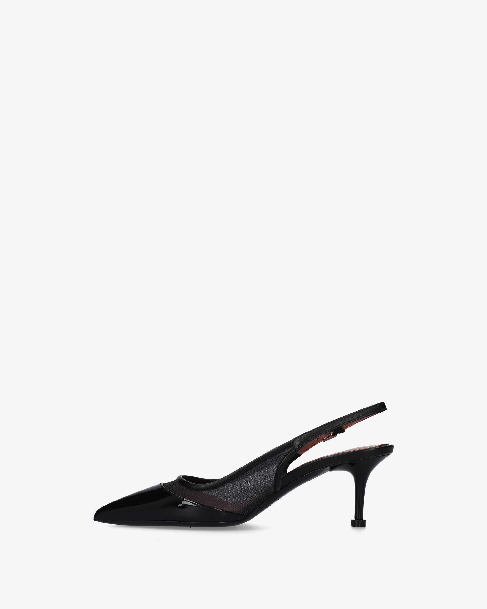 A refined shoe that reinterprets the classic slingback silhouette through a play of transparencies and textured materials. The tapered design and thin heel give the model a modern and slender elegance.