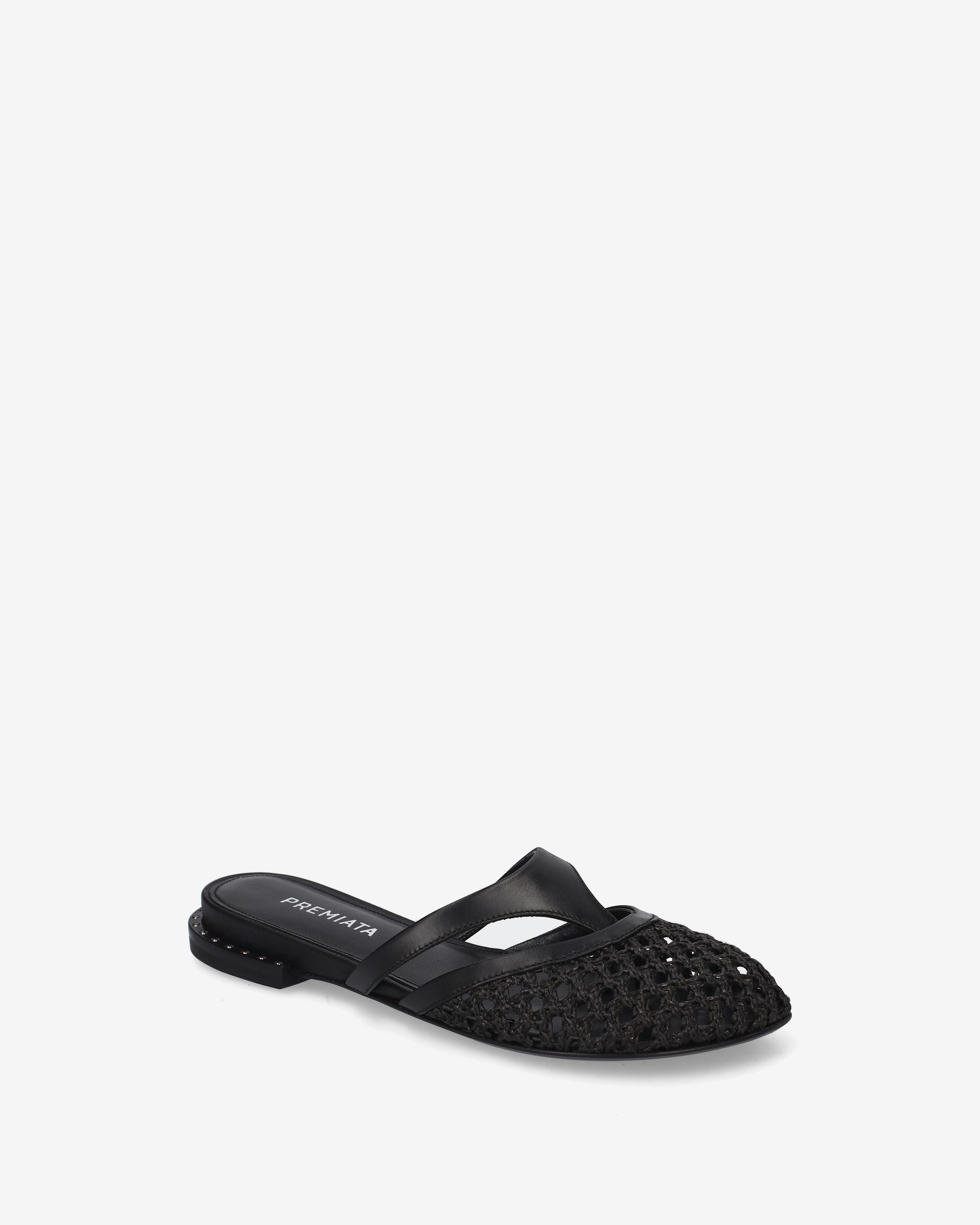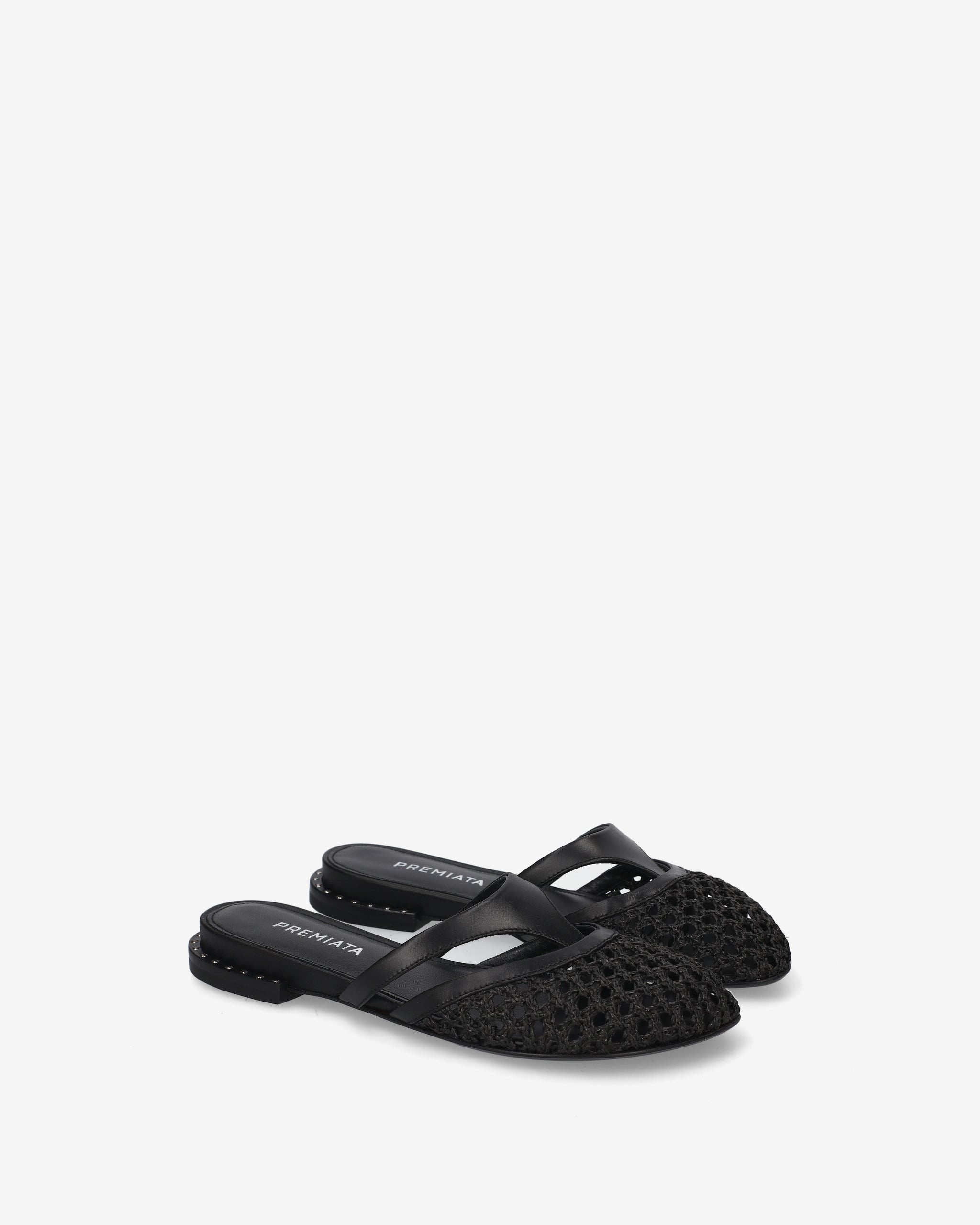 These flat sabots combine the material elegance of woven fabric with a geometric strap design. A lightweight and sophisticated shoe, perfect for enhancing outfits with a touch of contemporary craftsmanship.