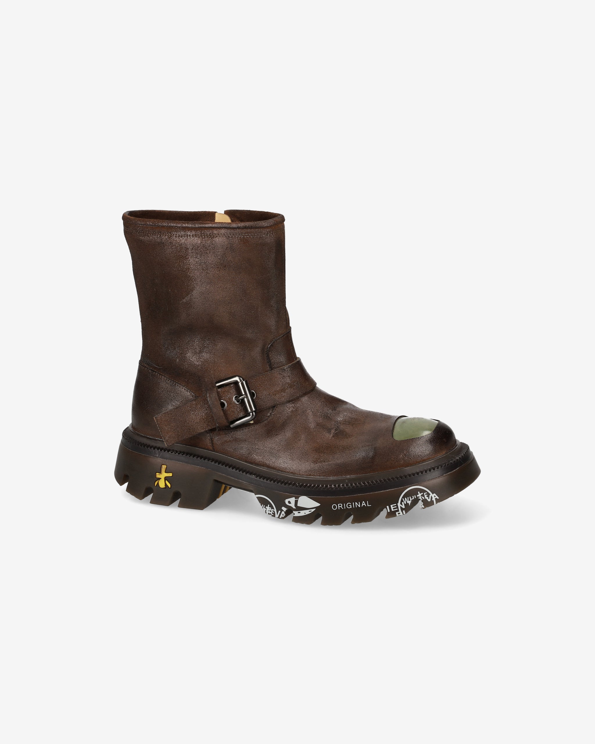 Biker in crosta ingrassata e sporcata a mano con fibbia laterale, puntale in ABS in tono al pellame e fondo traslucido color testa di moro. Un modello grintoso e artigianale, ispirato all’estetica underground londinese.