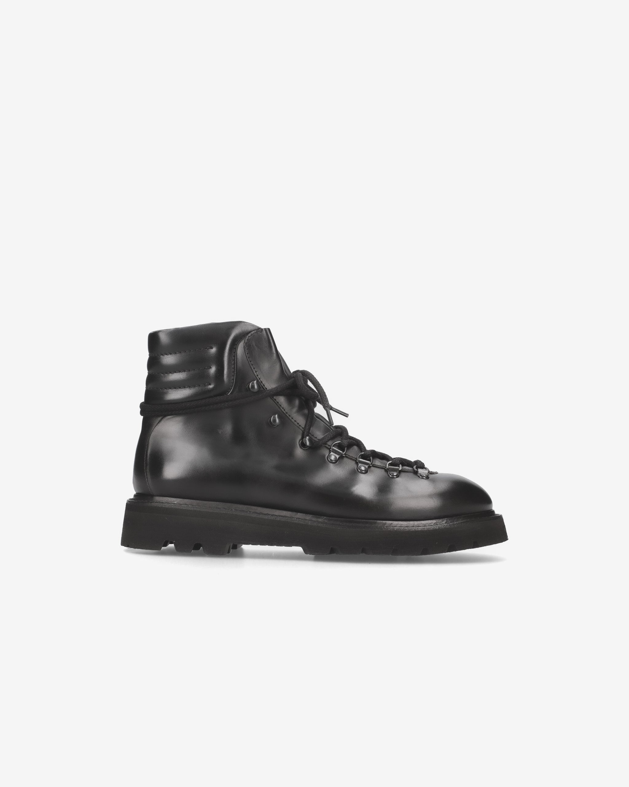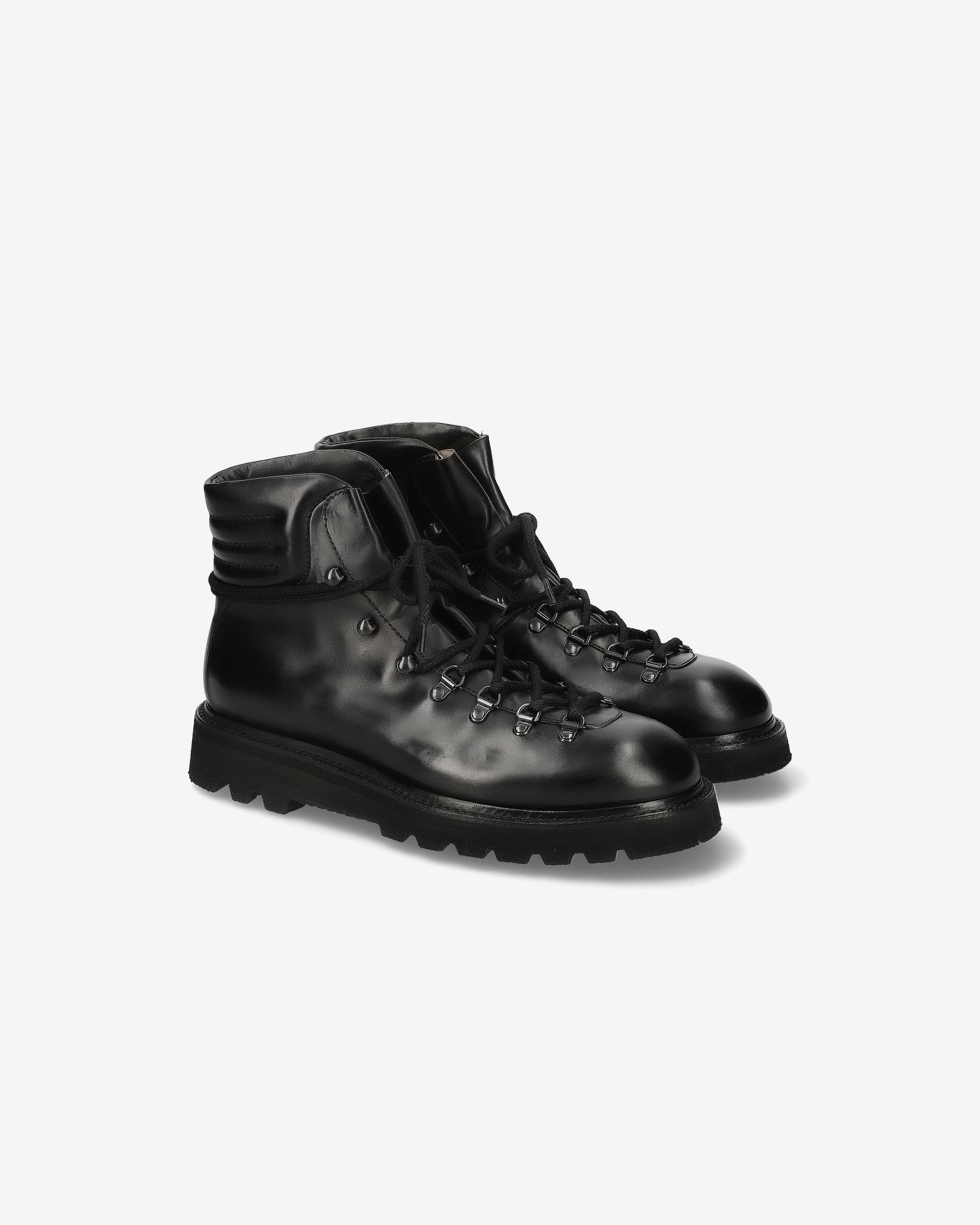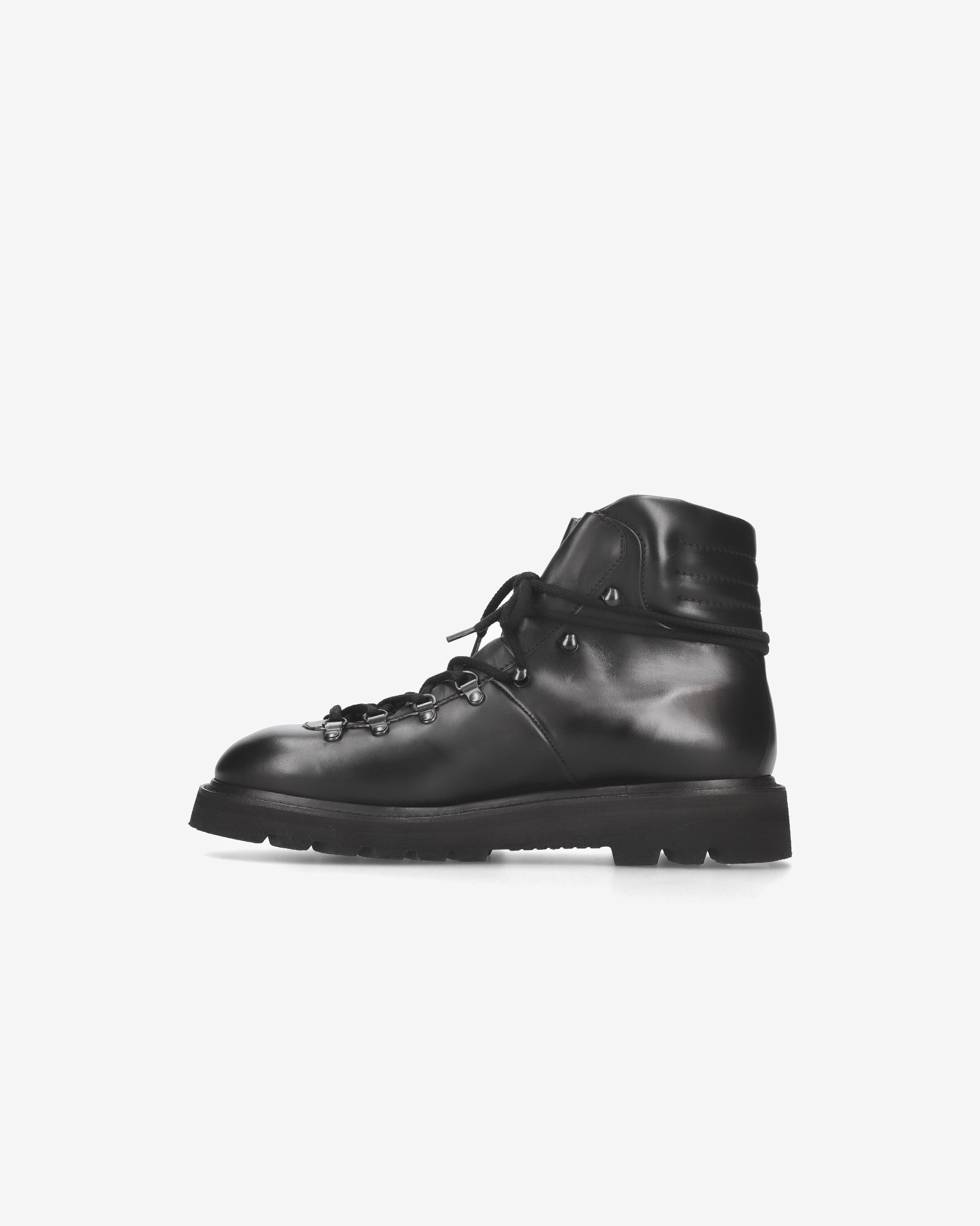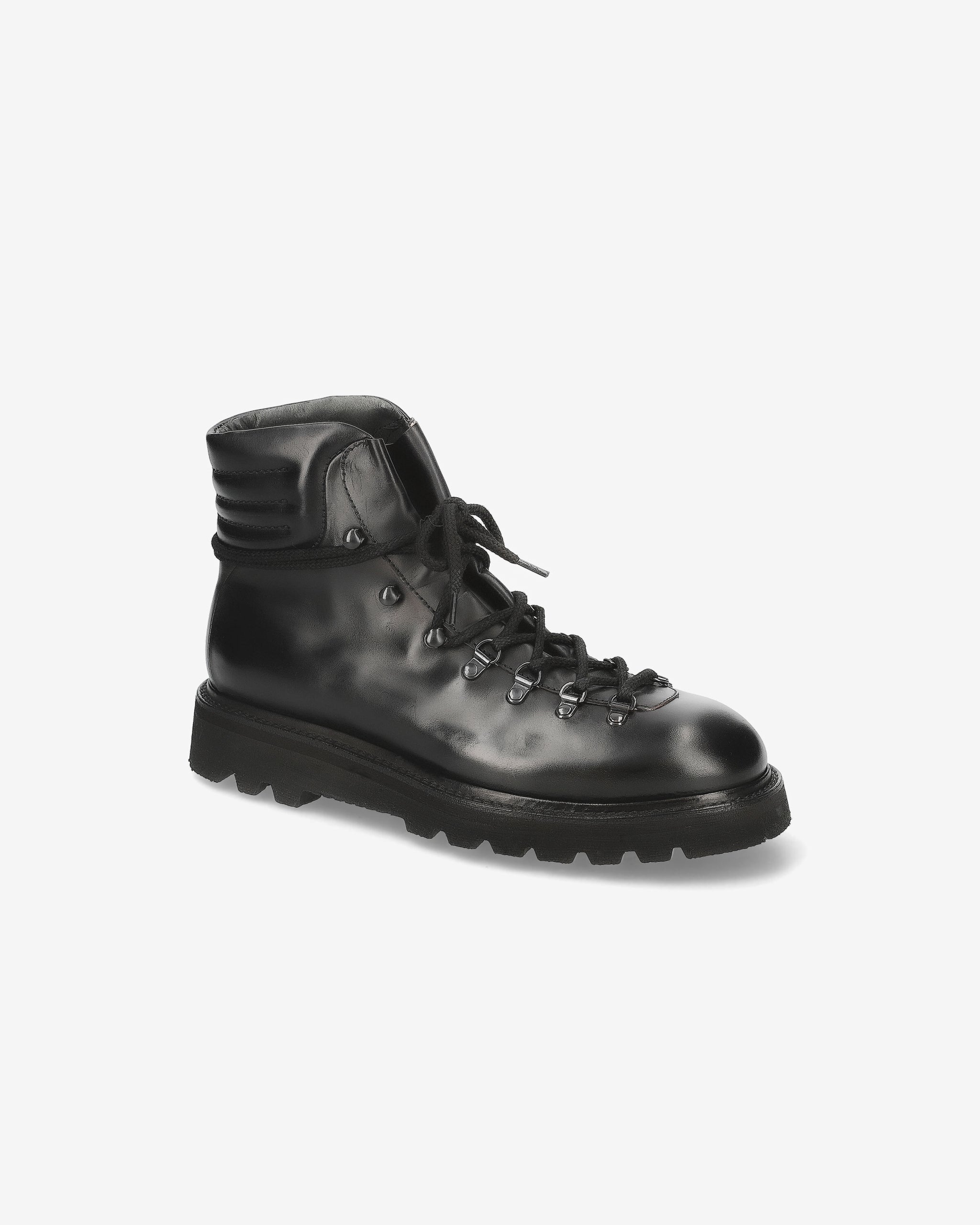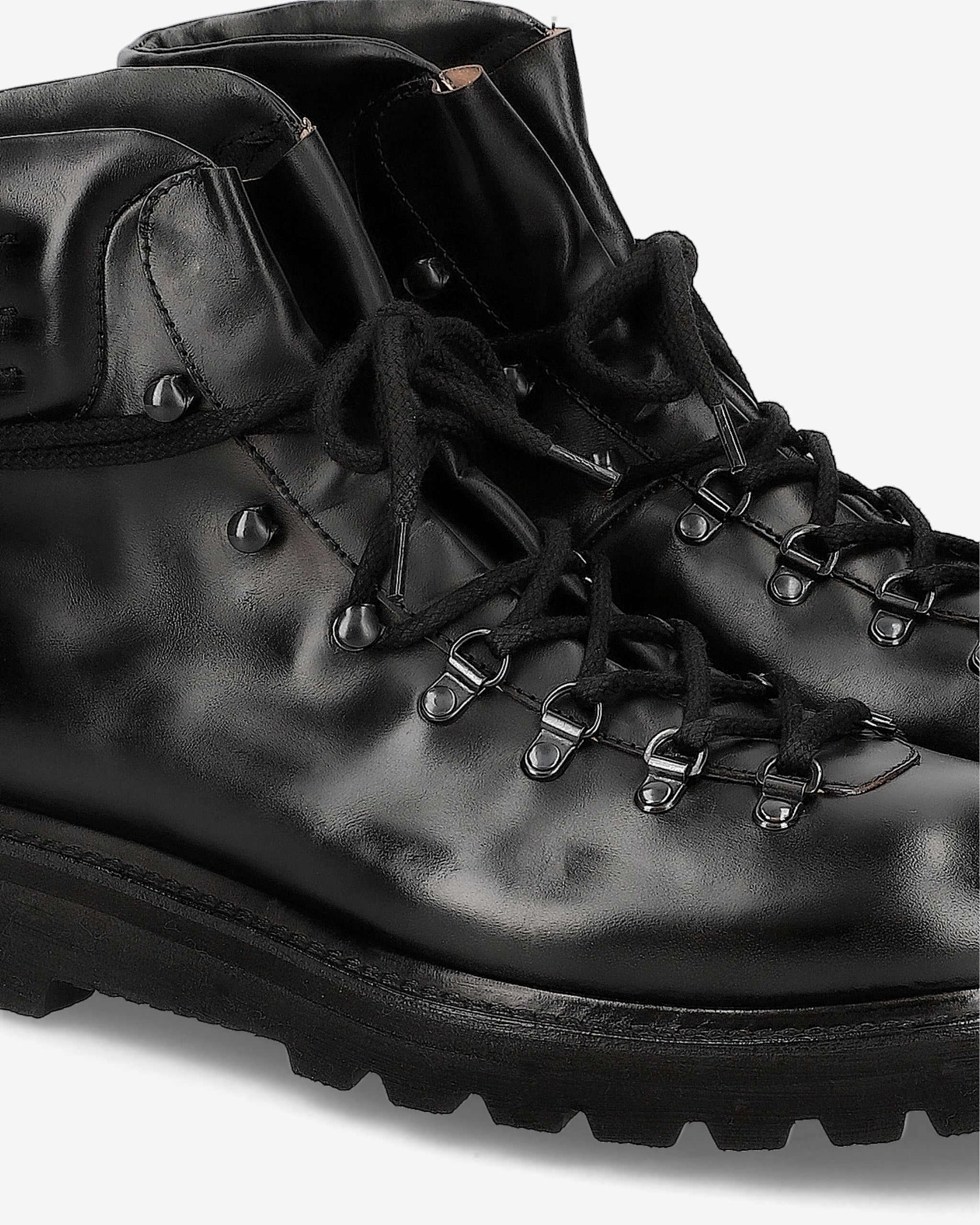 Questi stivaletti incarnano l'anima ibrida di Premiata. Realizzati in pelle di cavallo, si caratterizzano per il mix di materiali, lo stile e per il design che ricorda quello di una pedula da montagna con fondo in Vibram.