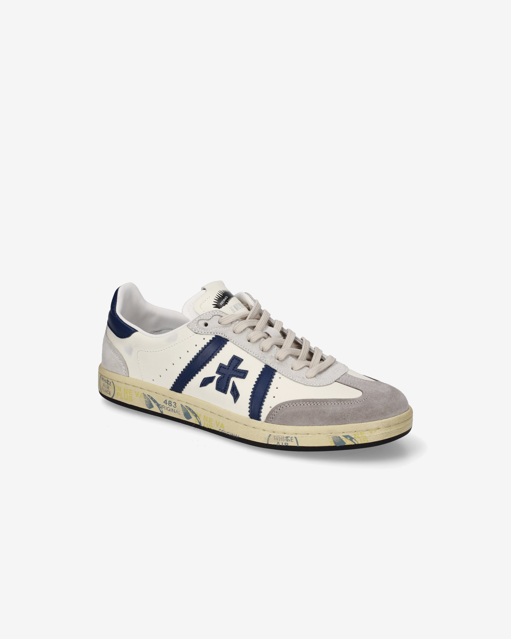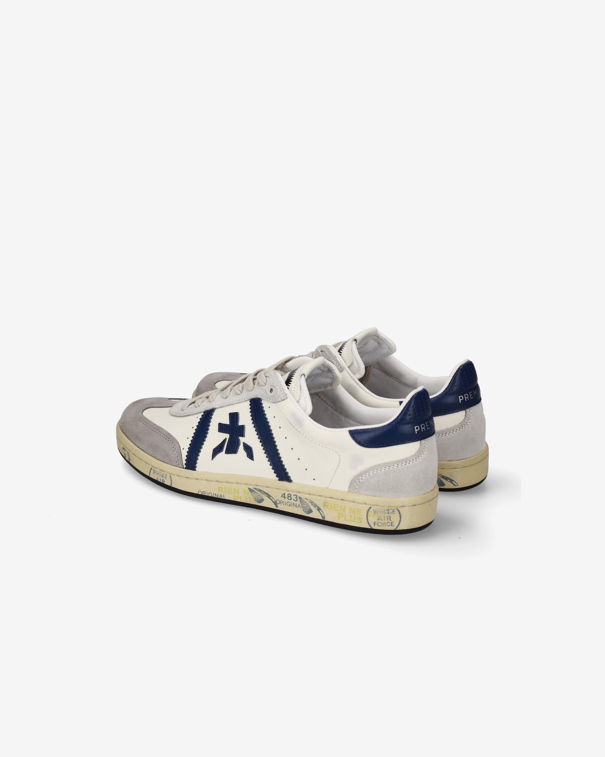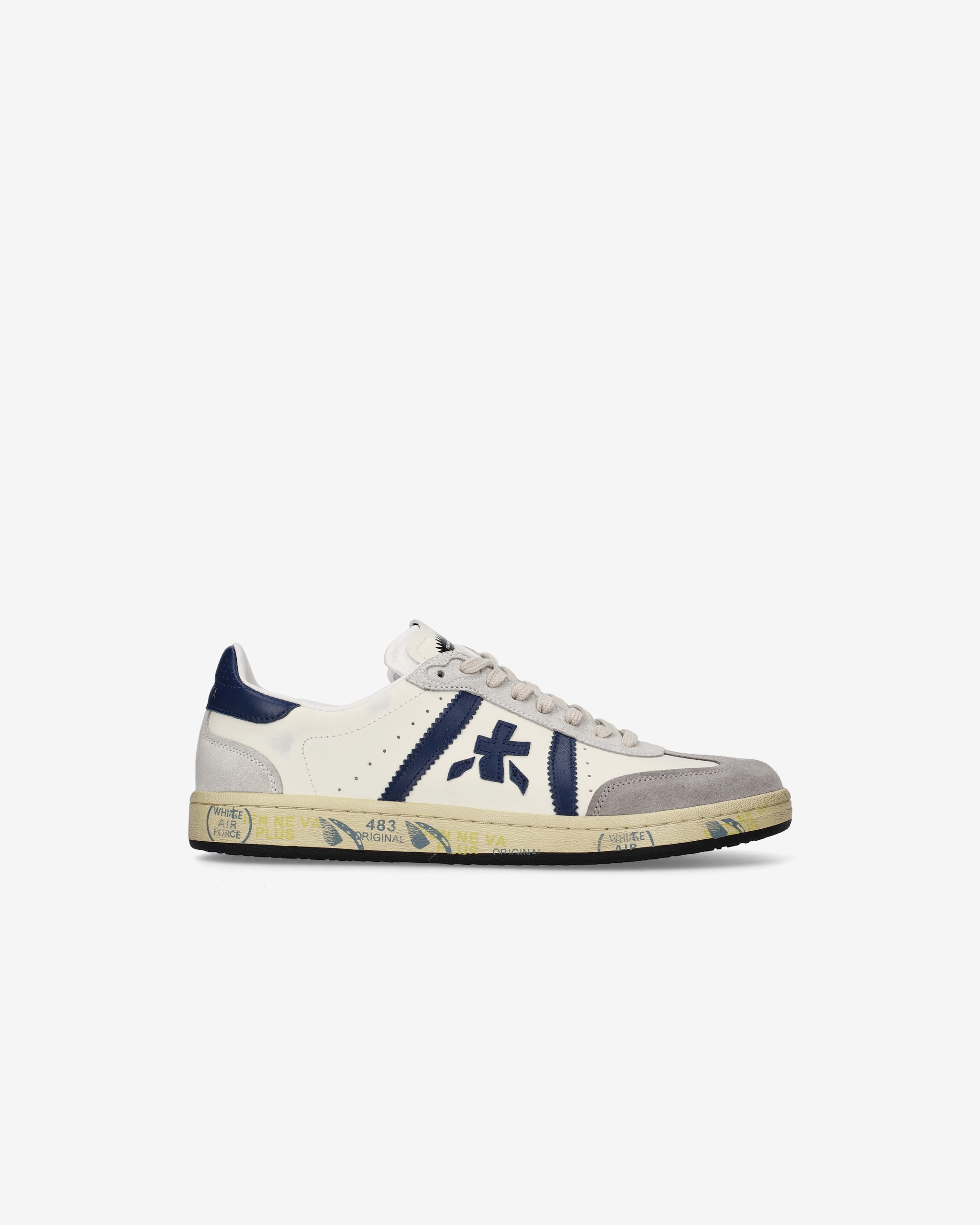 Bonnie con dettagli blu e spoiler blu, arricchita da timbri iconici sulla suola che ne sottolineano l’identità unica. Stile dinamico e riconoscibile.