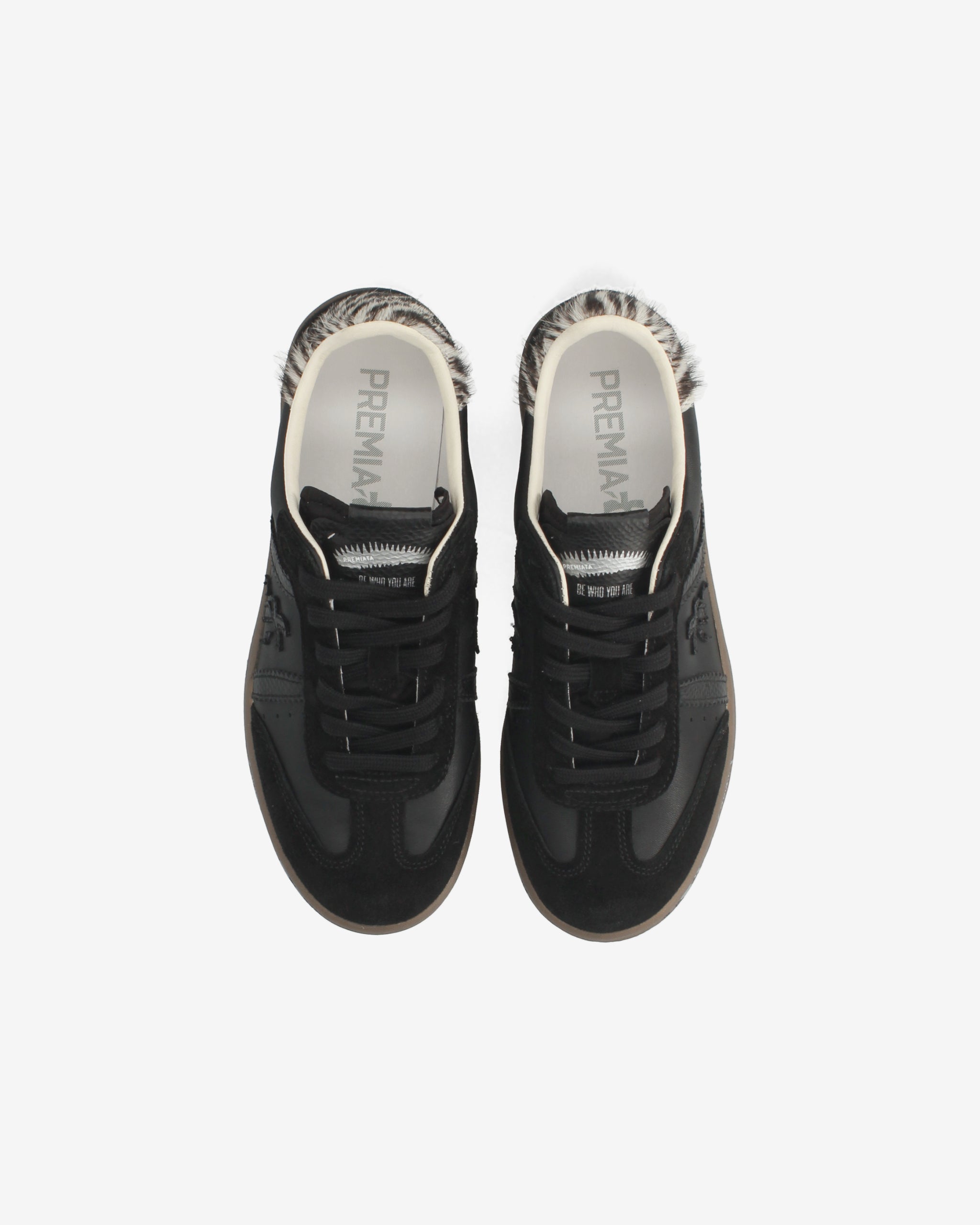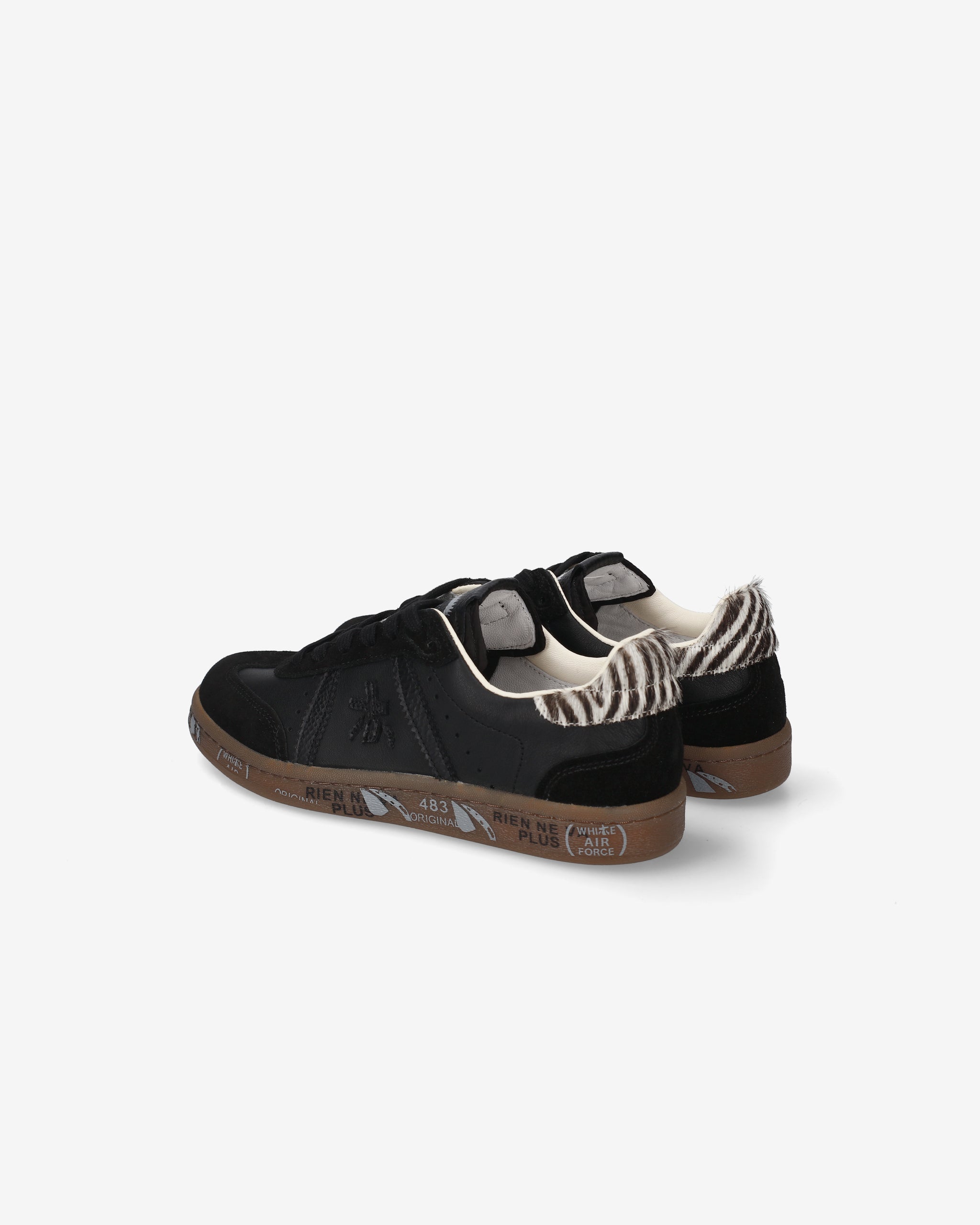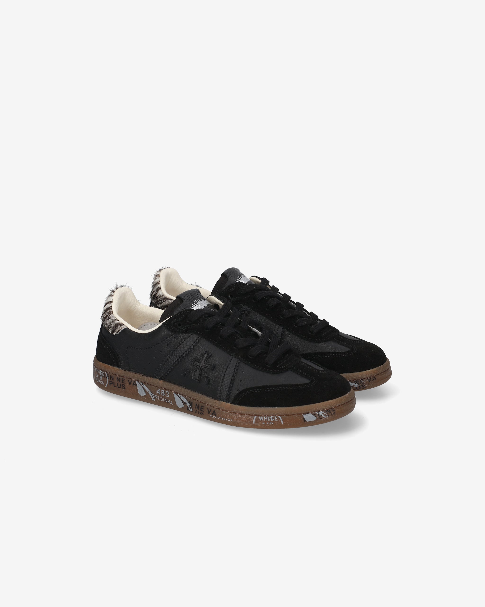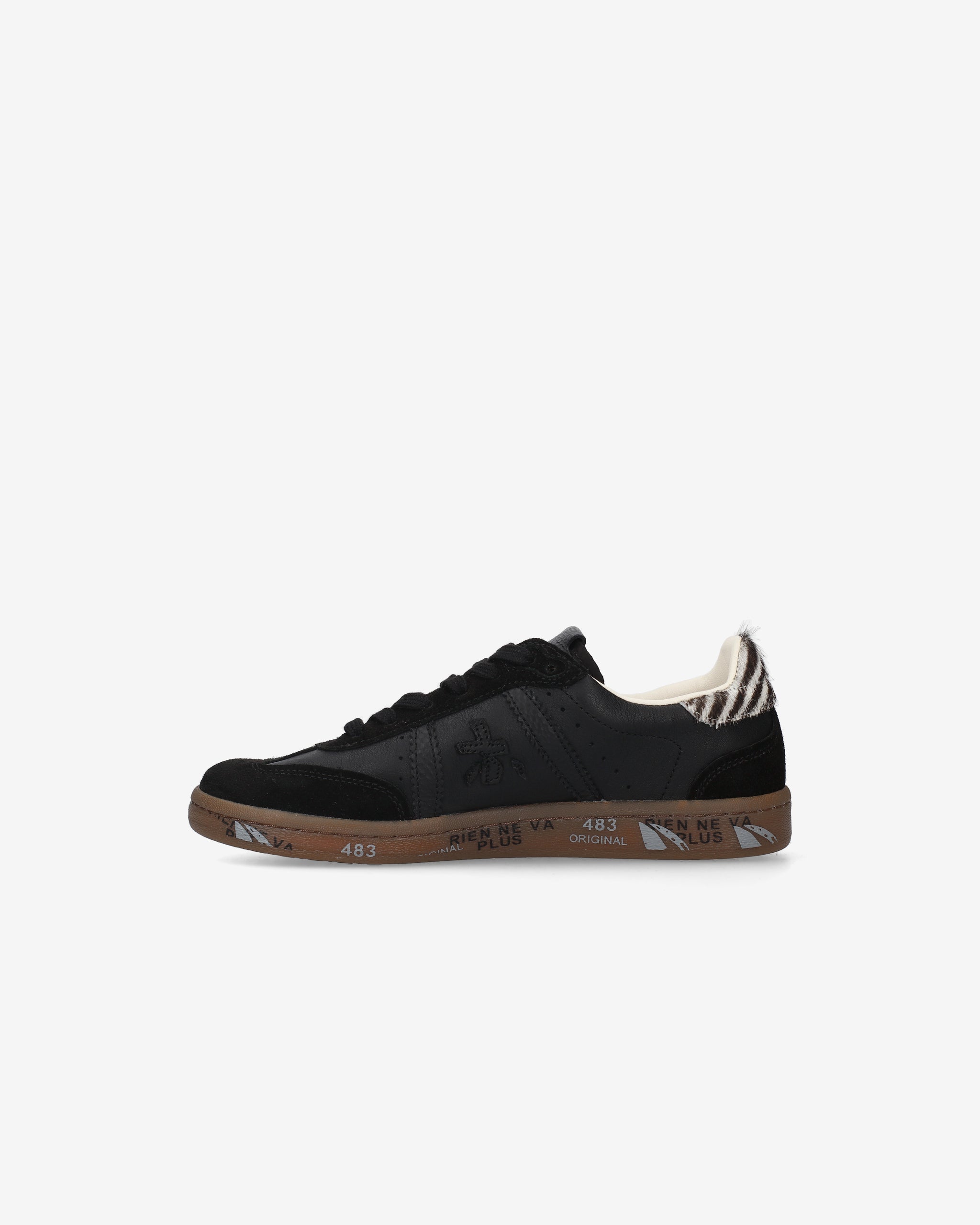 Questa sneaker dal look deciso combina pelle e tessuto in una tomaia nera arricchita da un motivo a strisce sul tallone. La suola marrone è decorata con i distintivi timbri di Premiata, che ne esaltano l’identità e lo stile urbano.