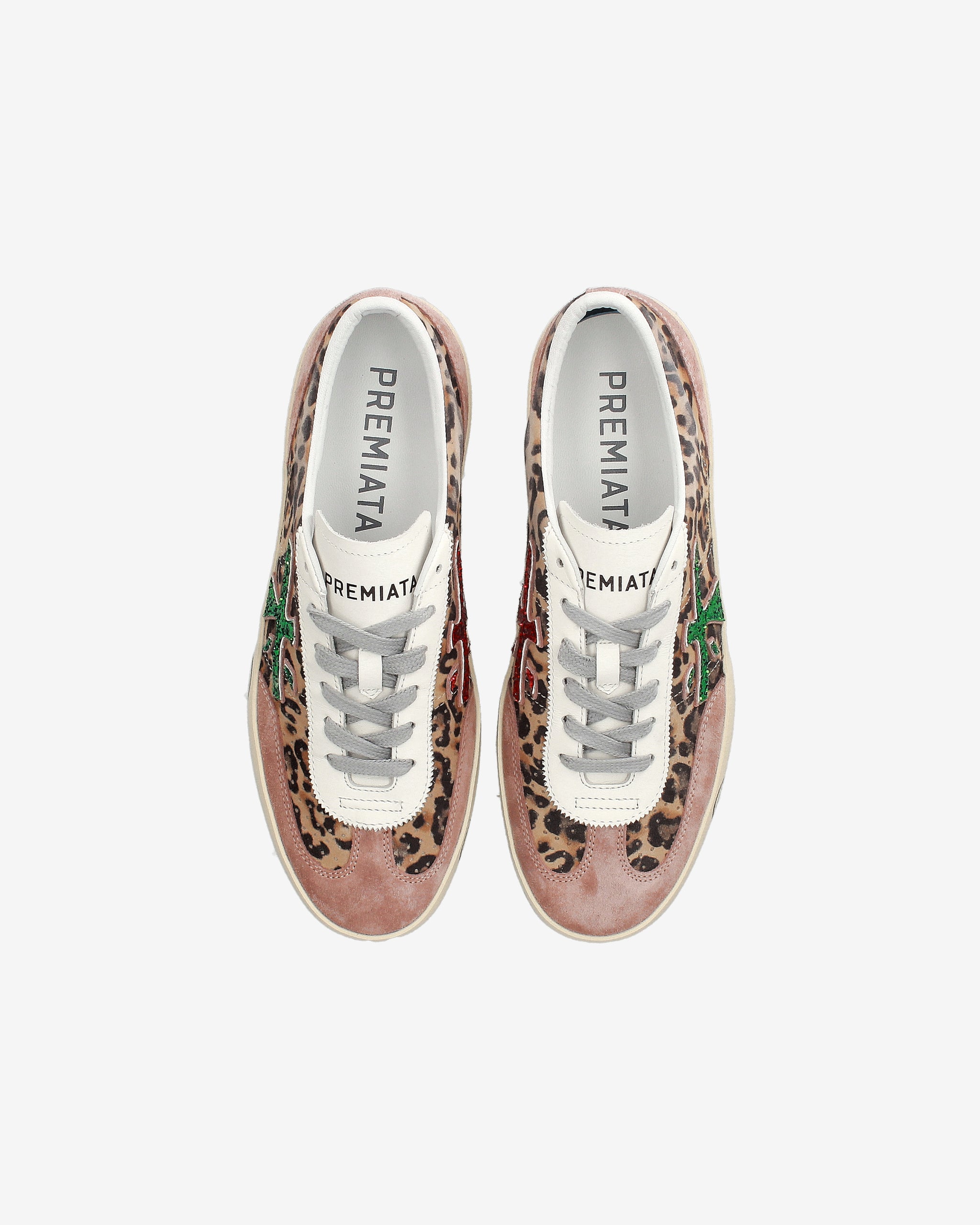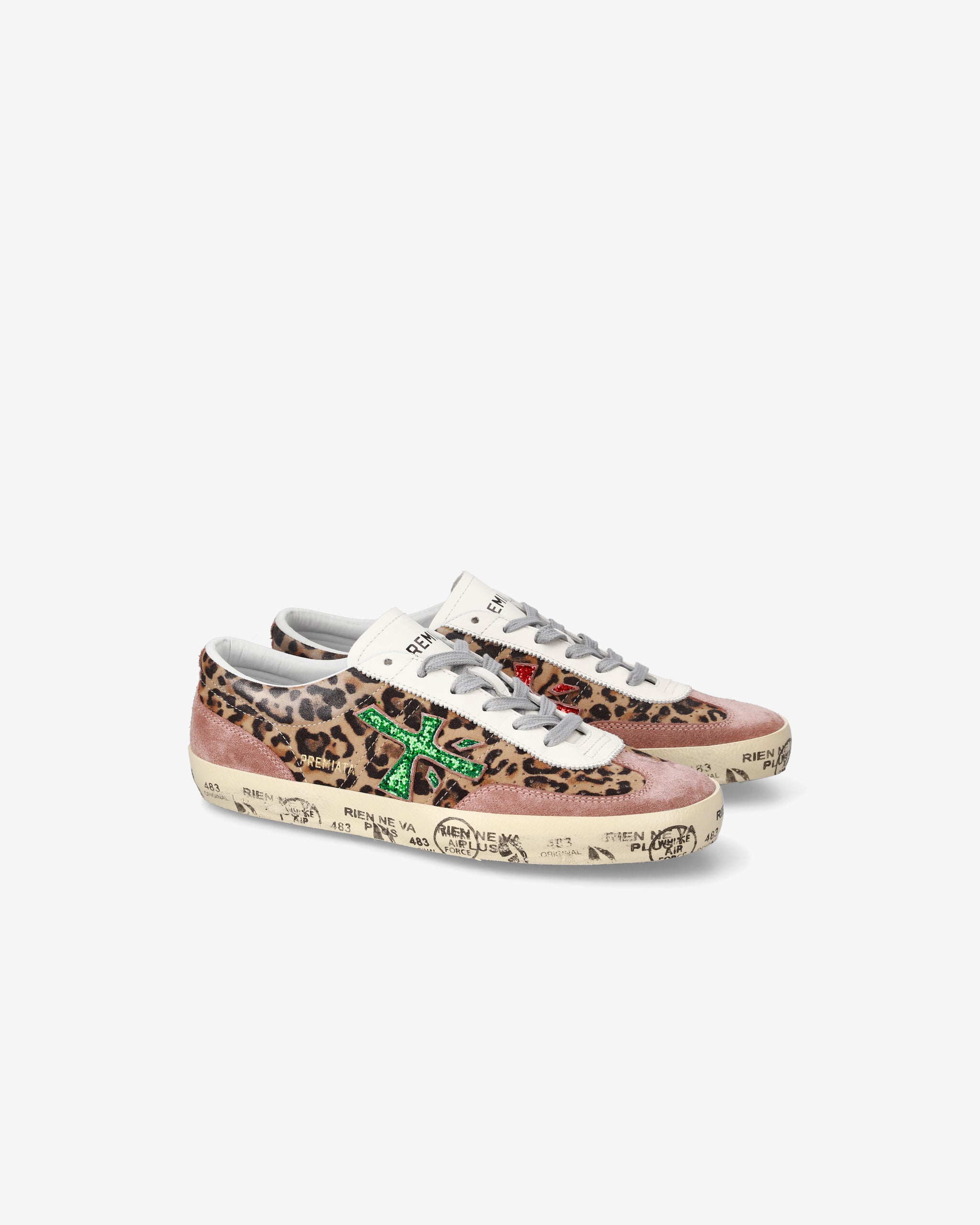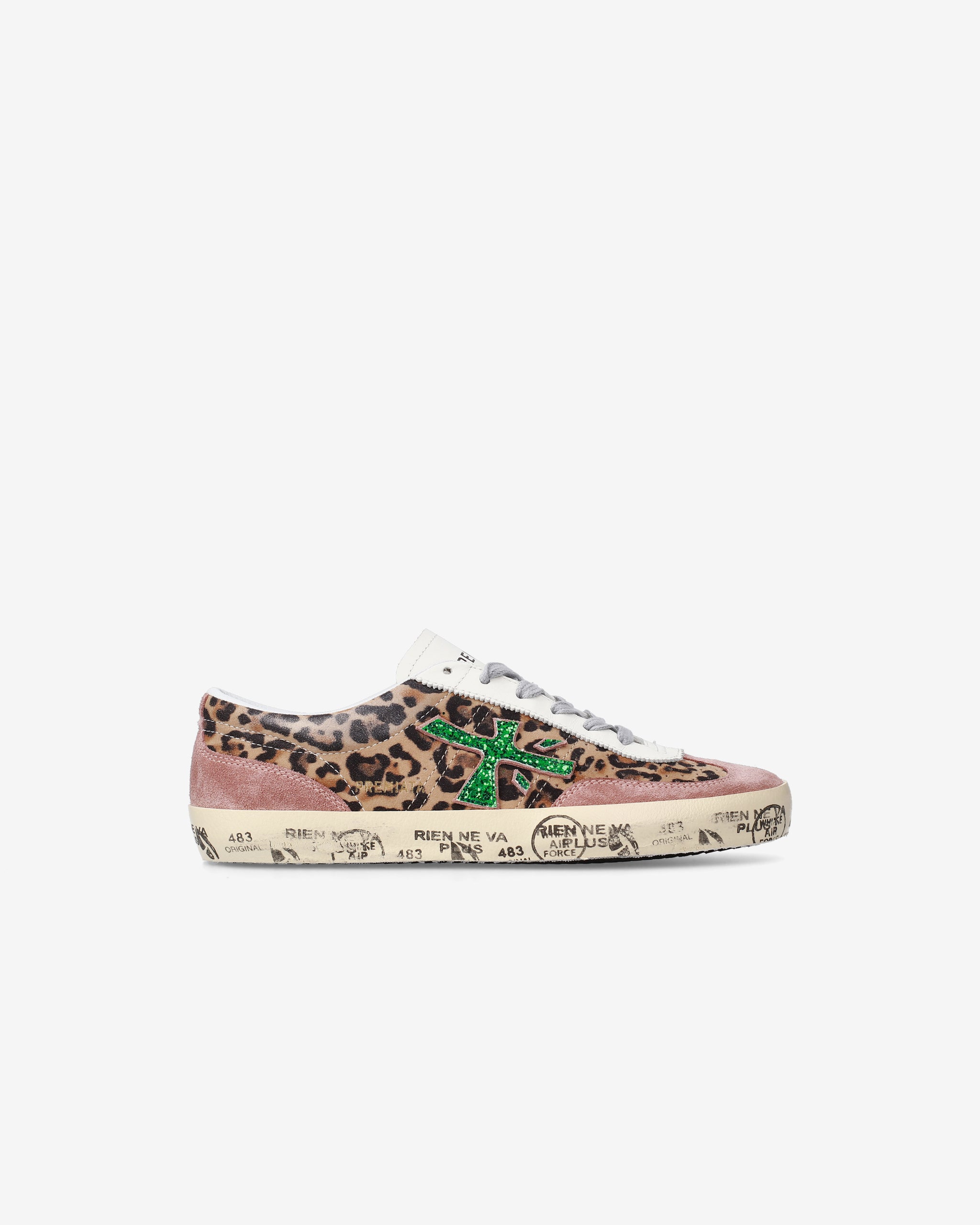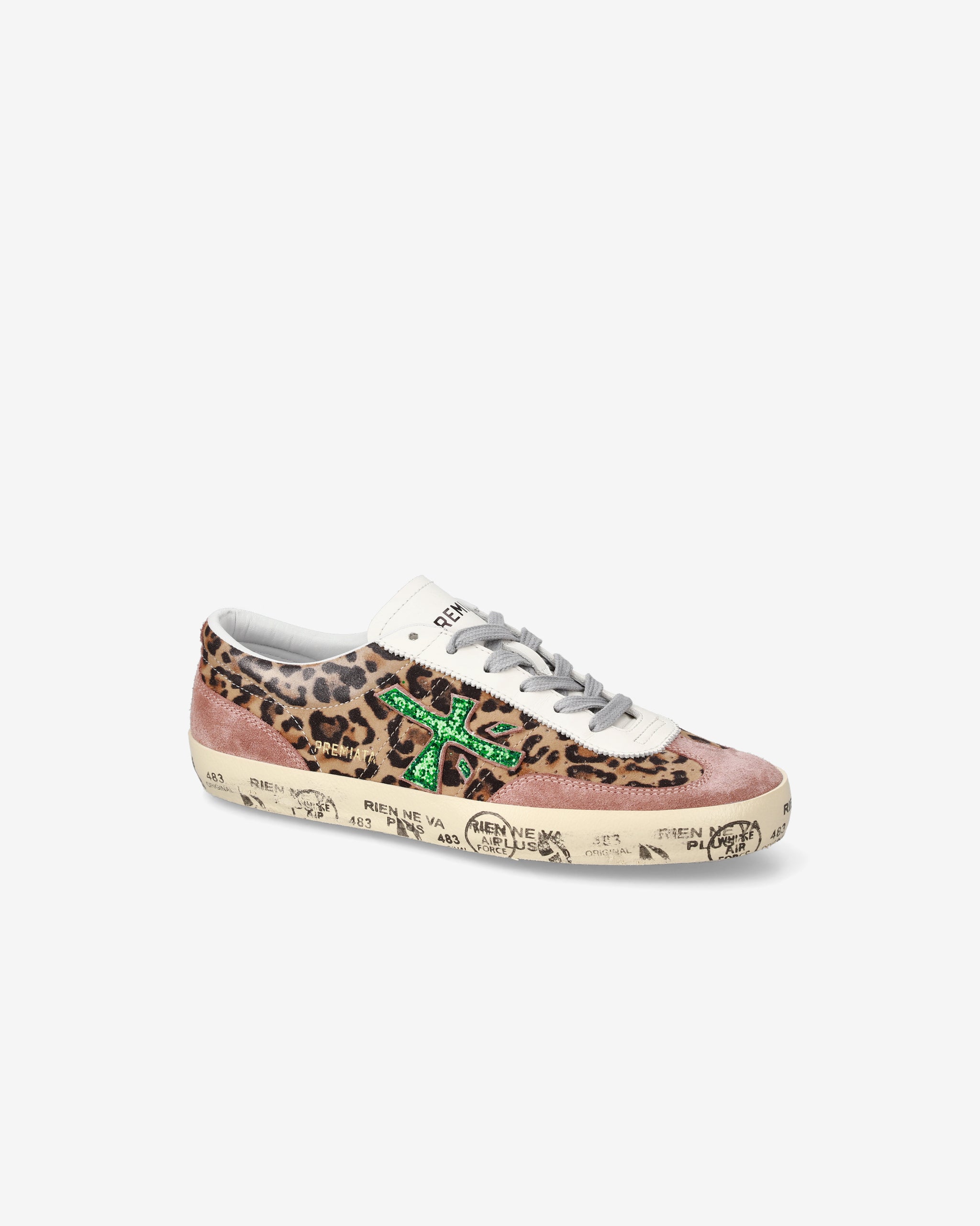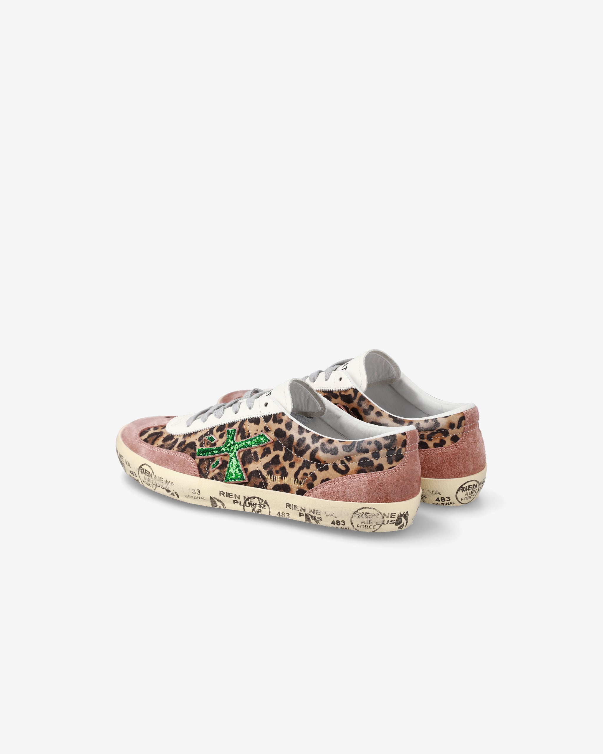 Sneakers dal design audace con stampa animalier leopardata e dettagli rosa. Logo verde brillante e suola decorata con scritte, per uno stile moderno e distintivo. Perfette per chi ama esprimere personalità.