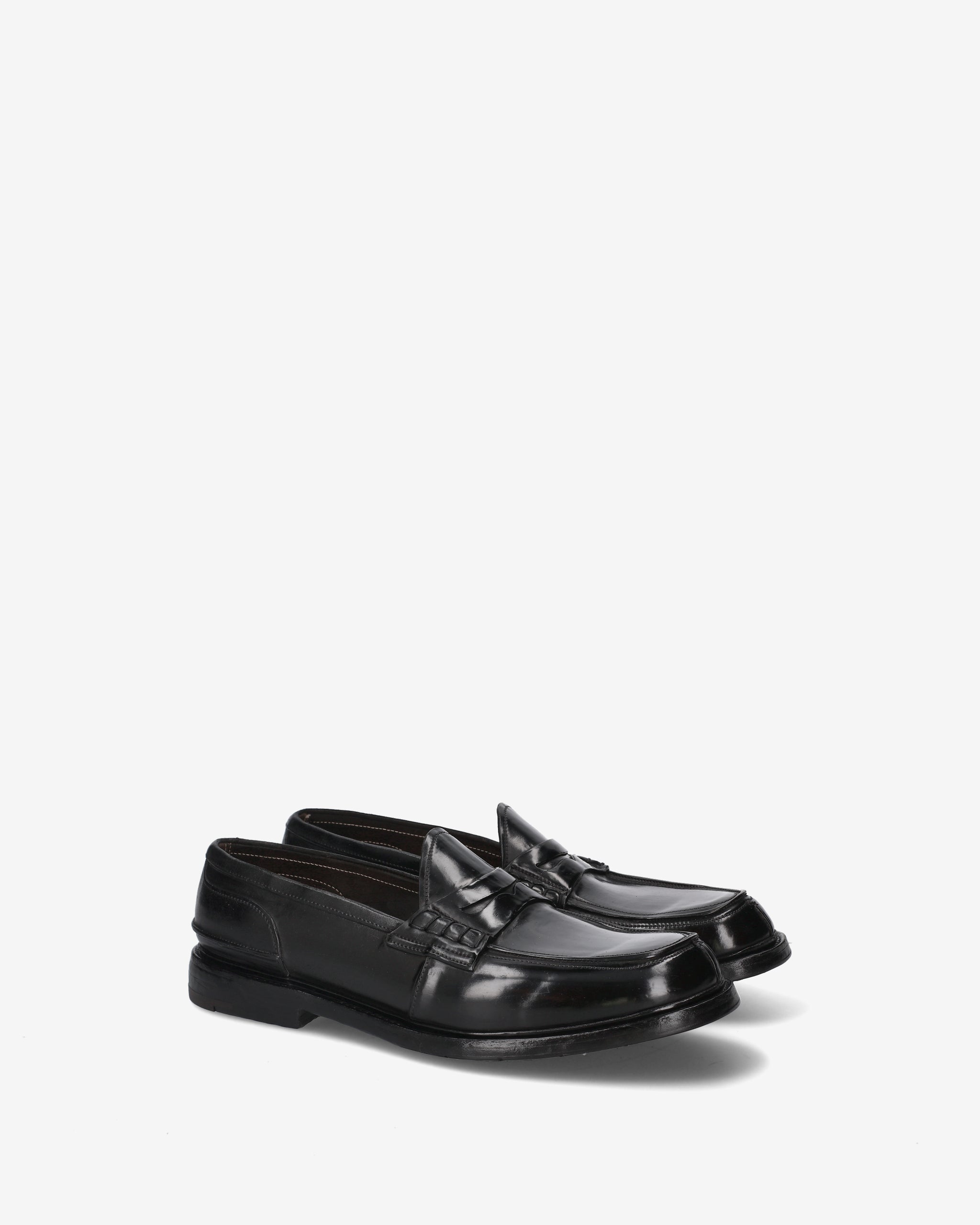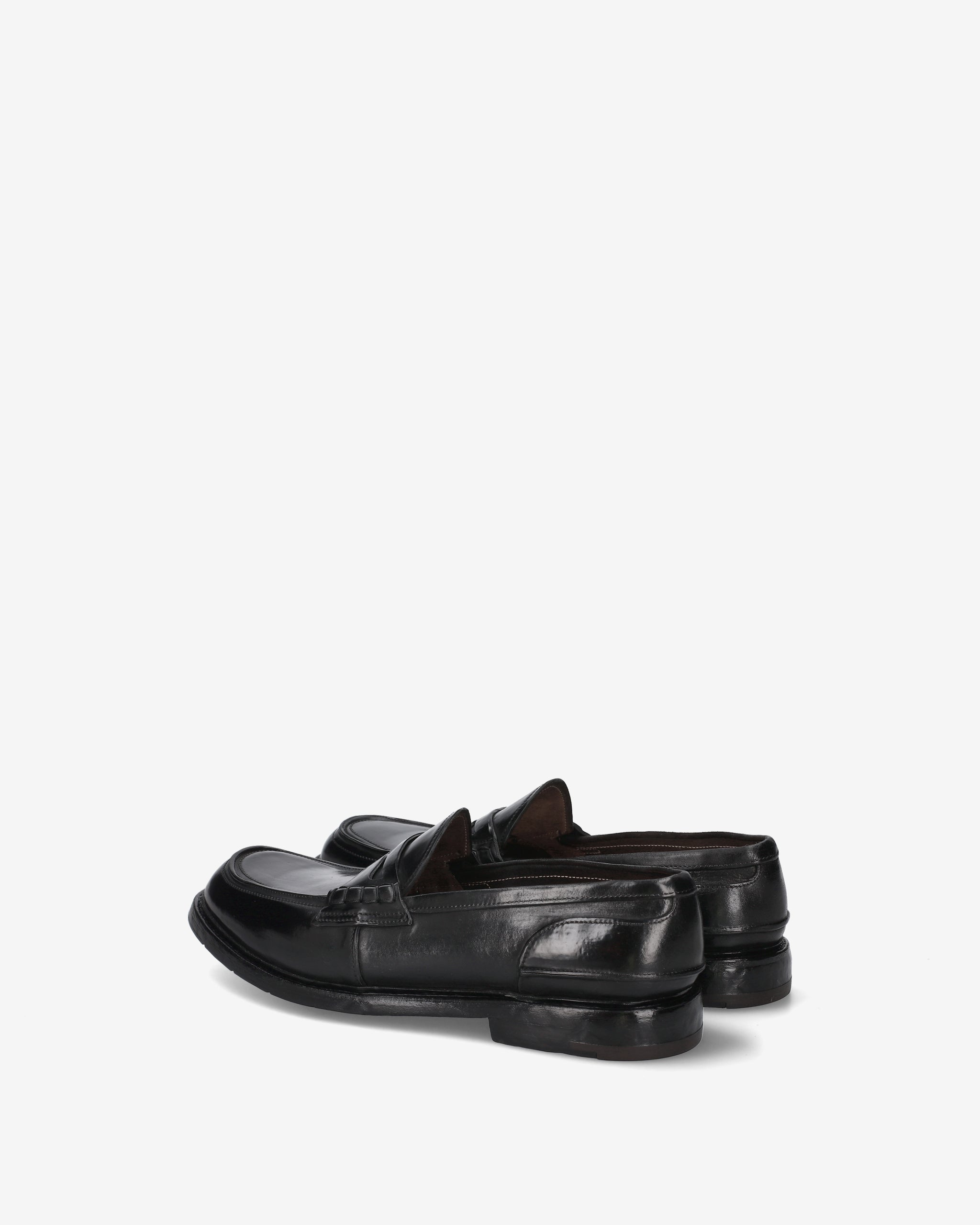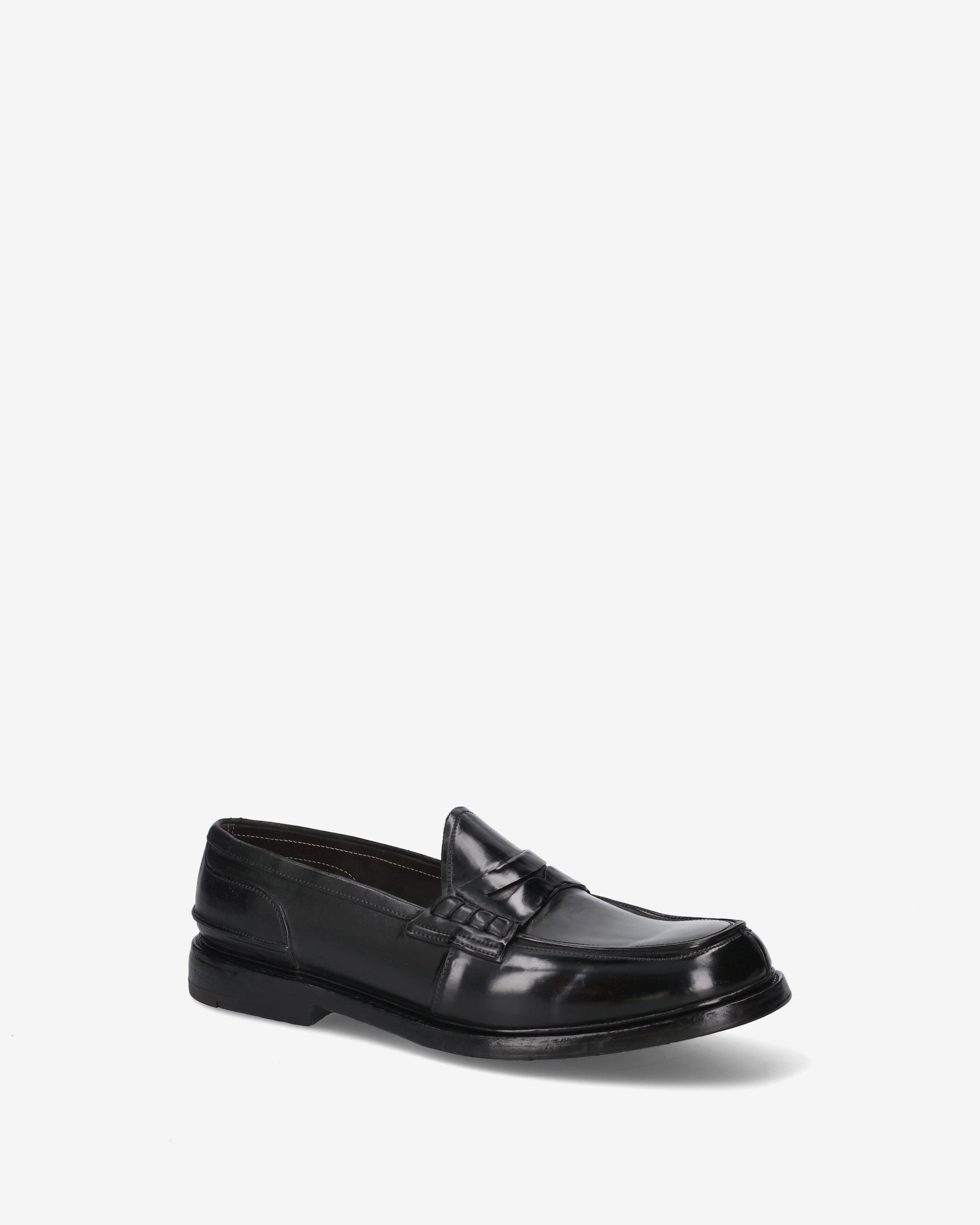 Un mocassino "Penny Loafer" dalla struttura rigorosa e dall'estetica decisa, che esprime la massima qualità calzaturiera attraverso una costruzione complessa e materiali di pregio. La finitura lucida e i dettagli artigianali ne fanno un pezzo distintivo del guardaroba formale