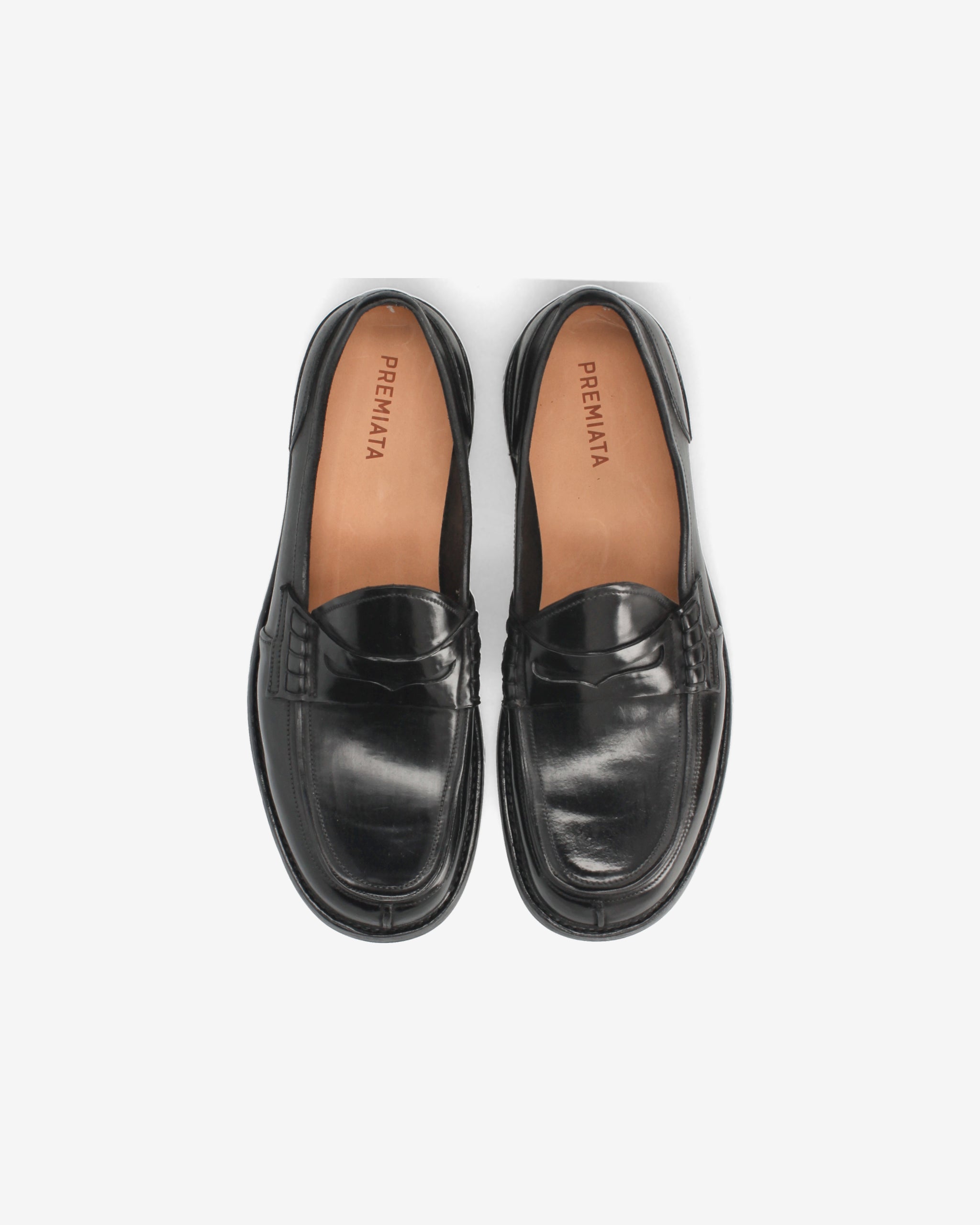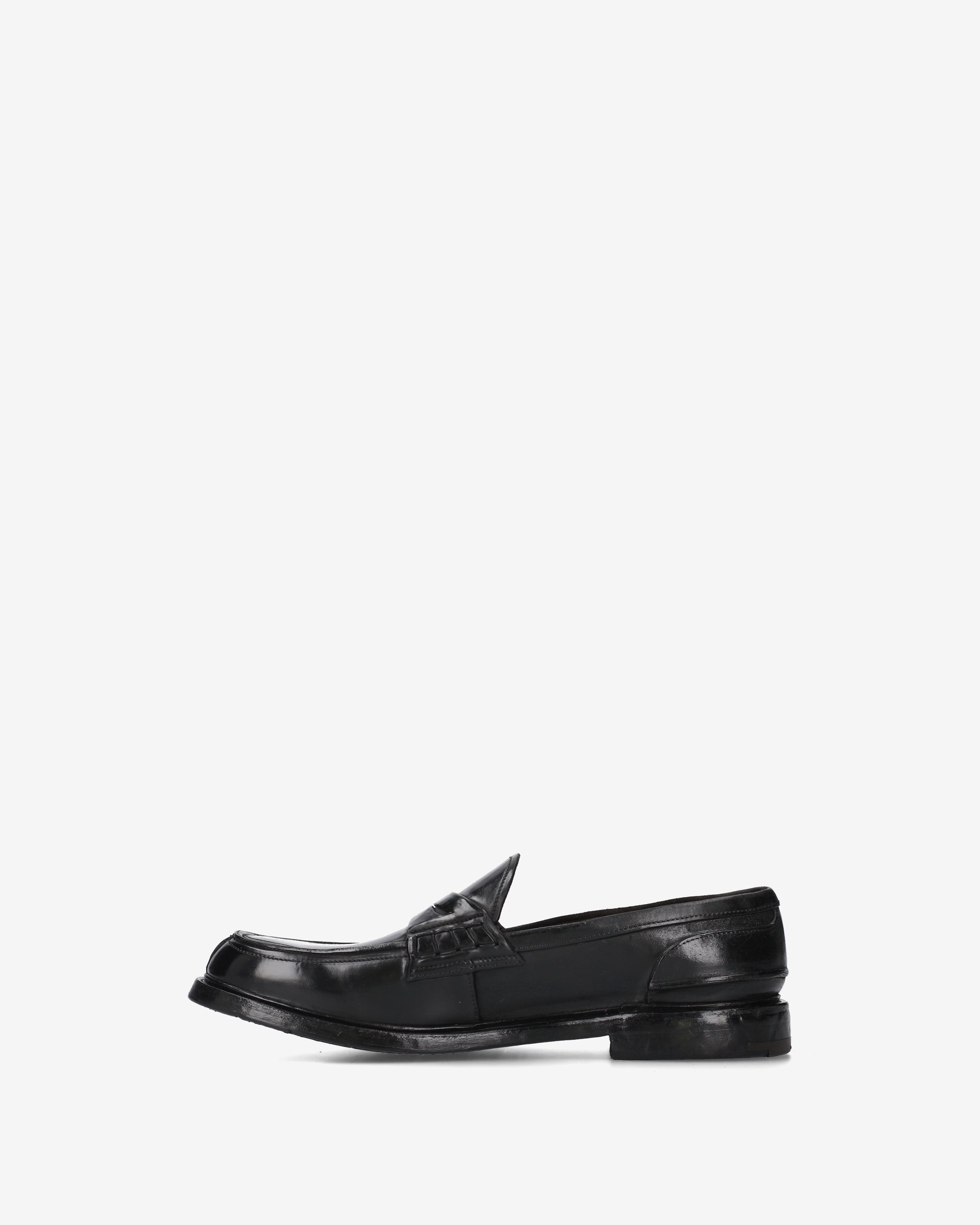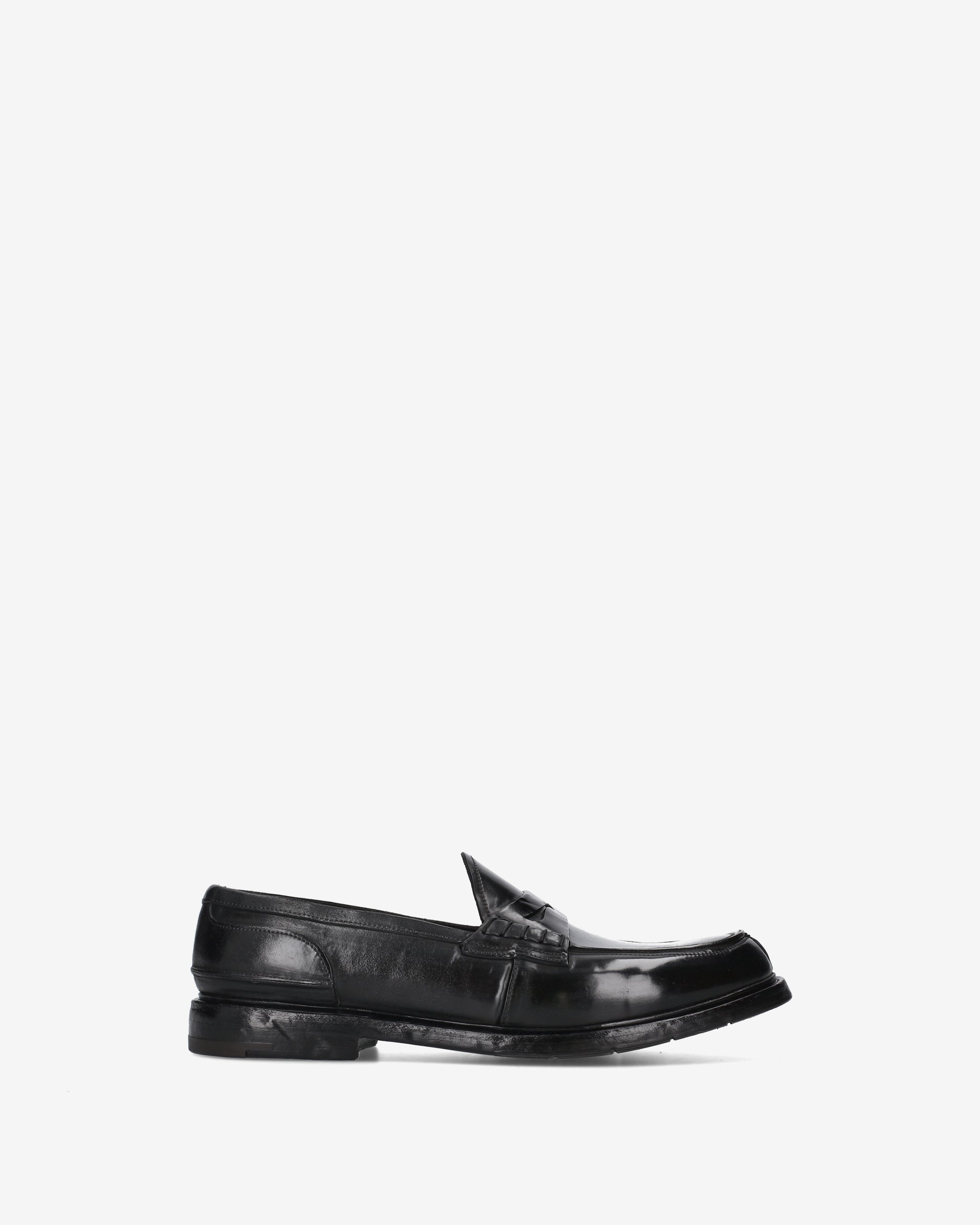 Un mocassino "Penny Loafer" dalla struttura rigorosa e dall'estetica decisa, che esprime la massima qualità calzaturiera attraverso una costruzione complessa e materiali di pregio. La finitura lucida e i dettagli artigianali ne fanno un pezzo distintivo del guardaroba formale
