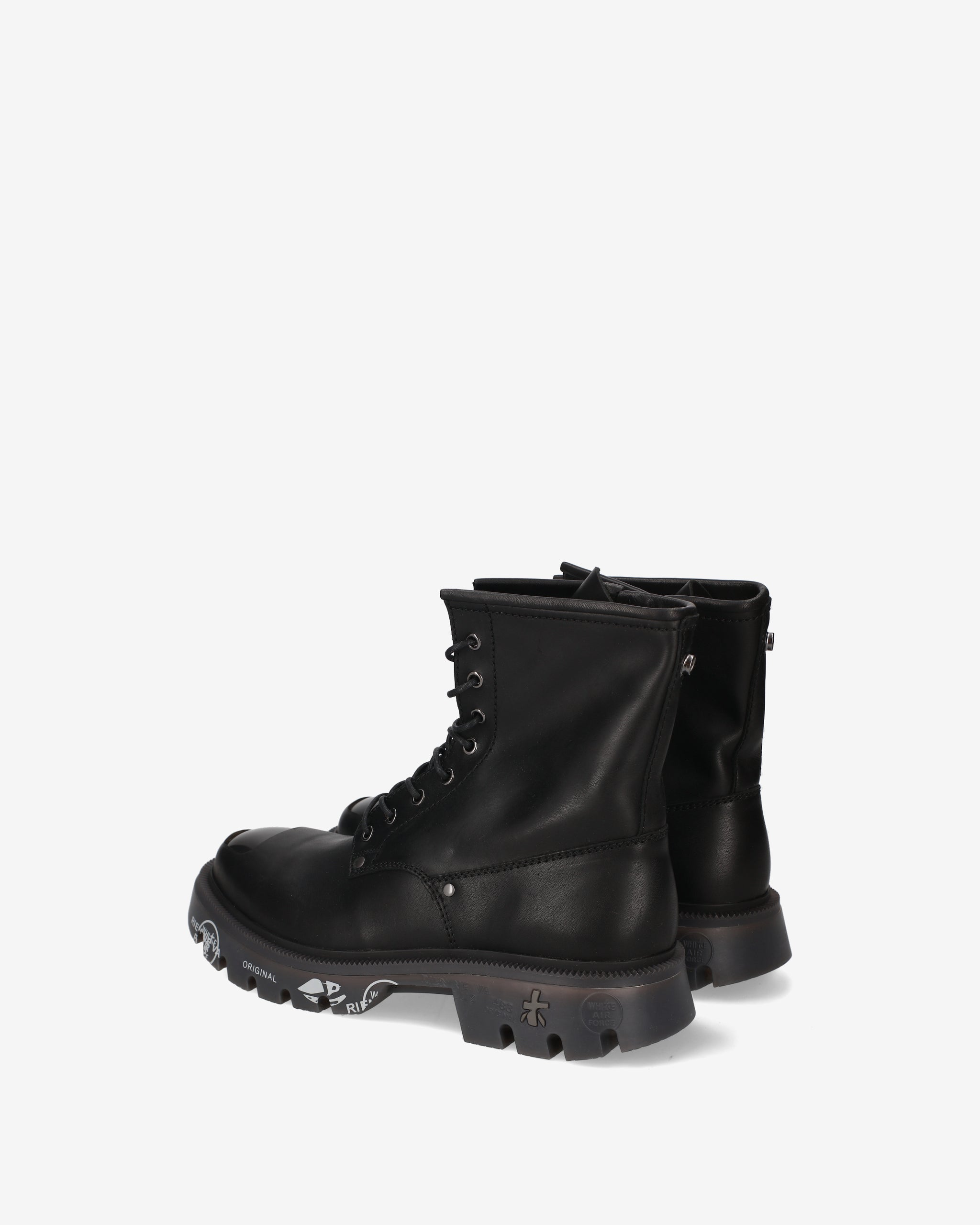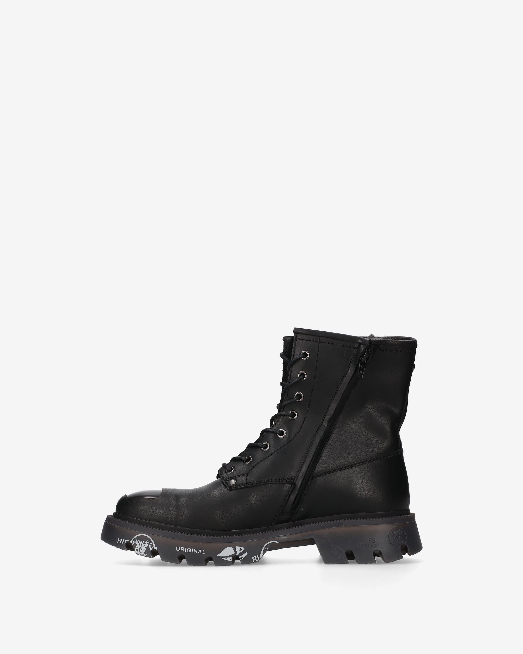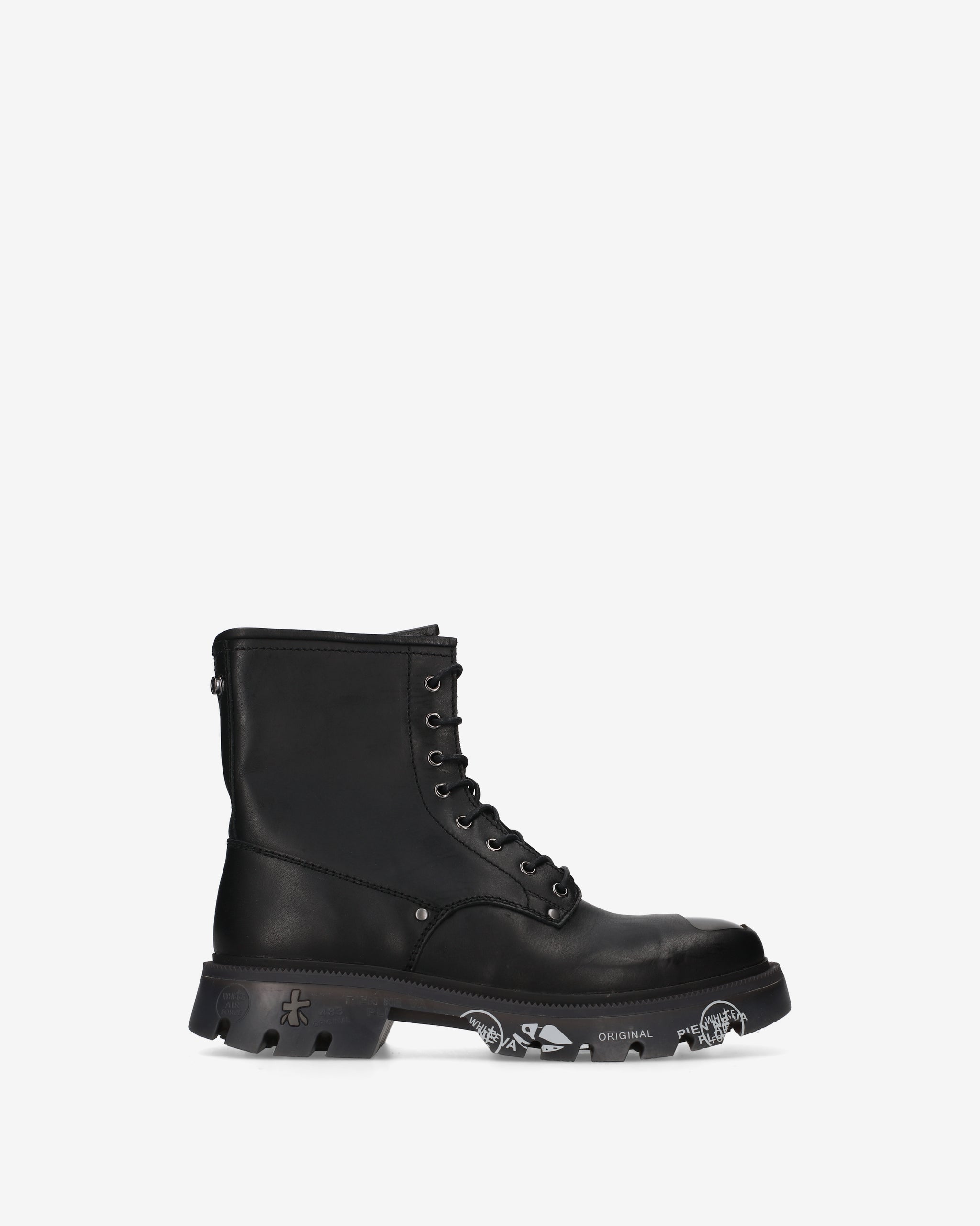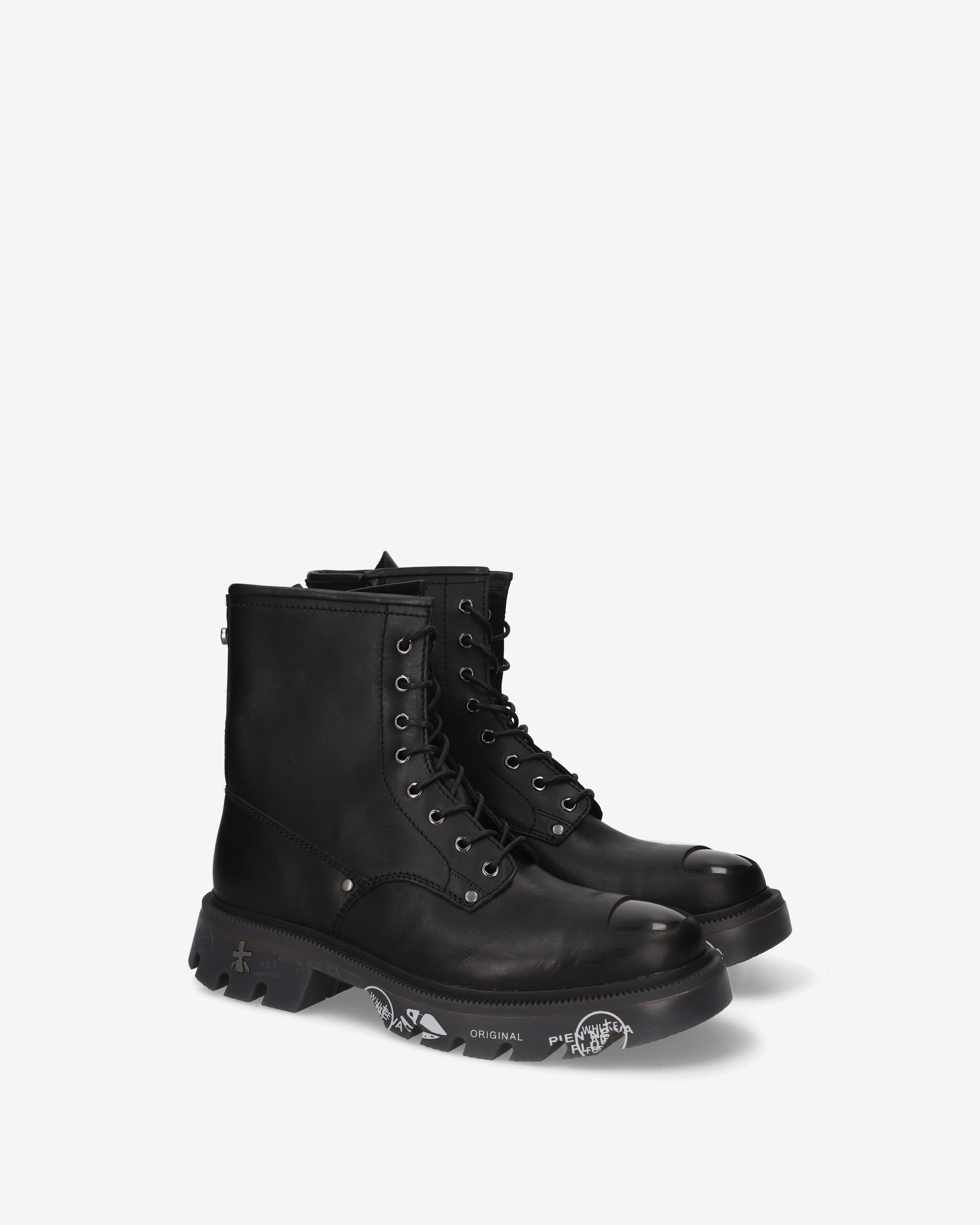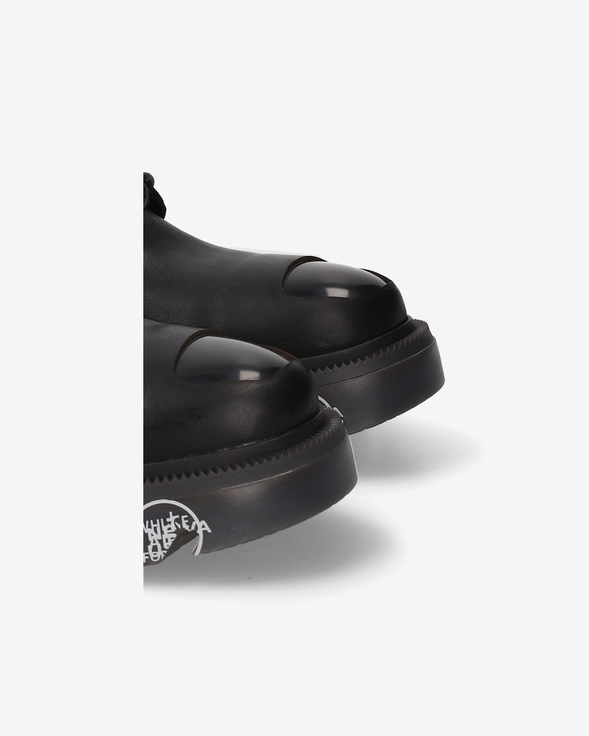 Anfibio in vitello spazzolato nero con puntale in ABS e guardolo verde militare abbinato a fondo nero. Un mix di eleganza e carattere, ispirato al mondo underground londinese.