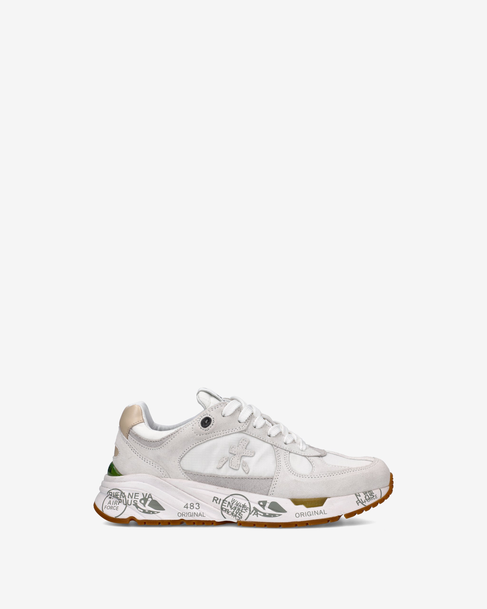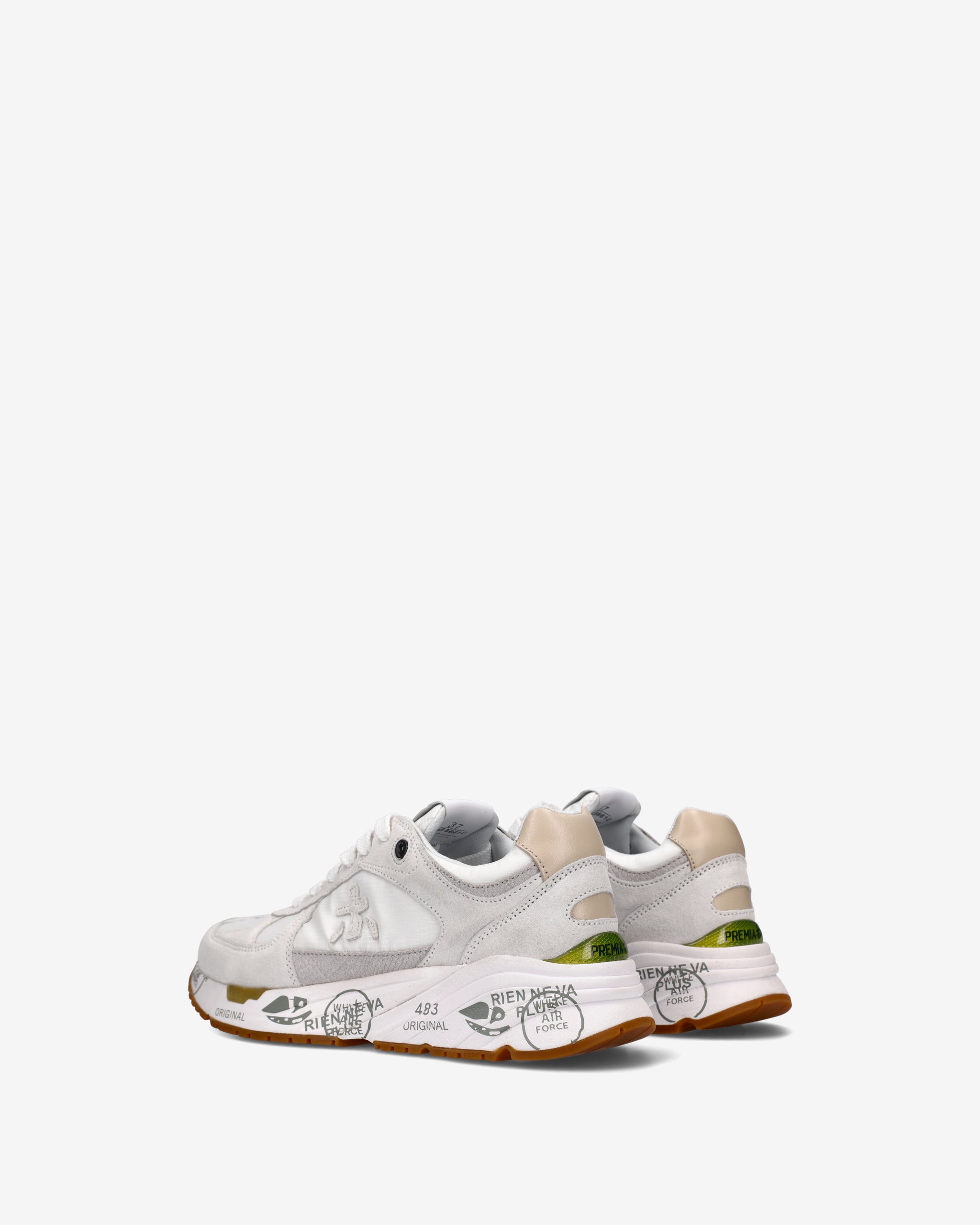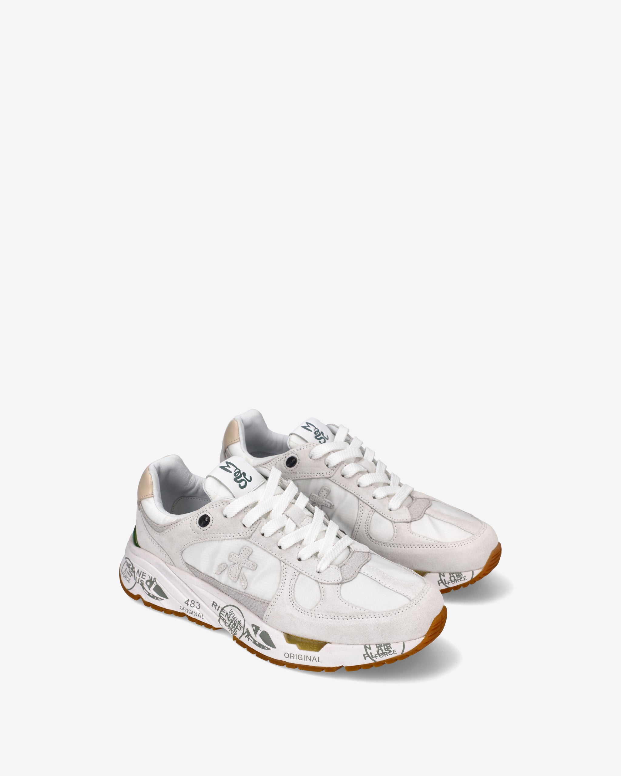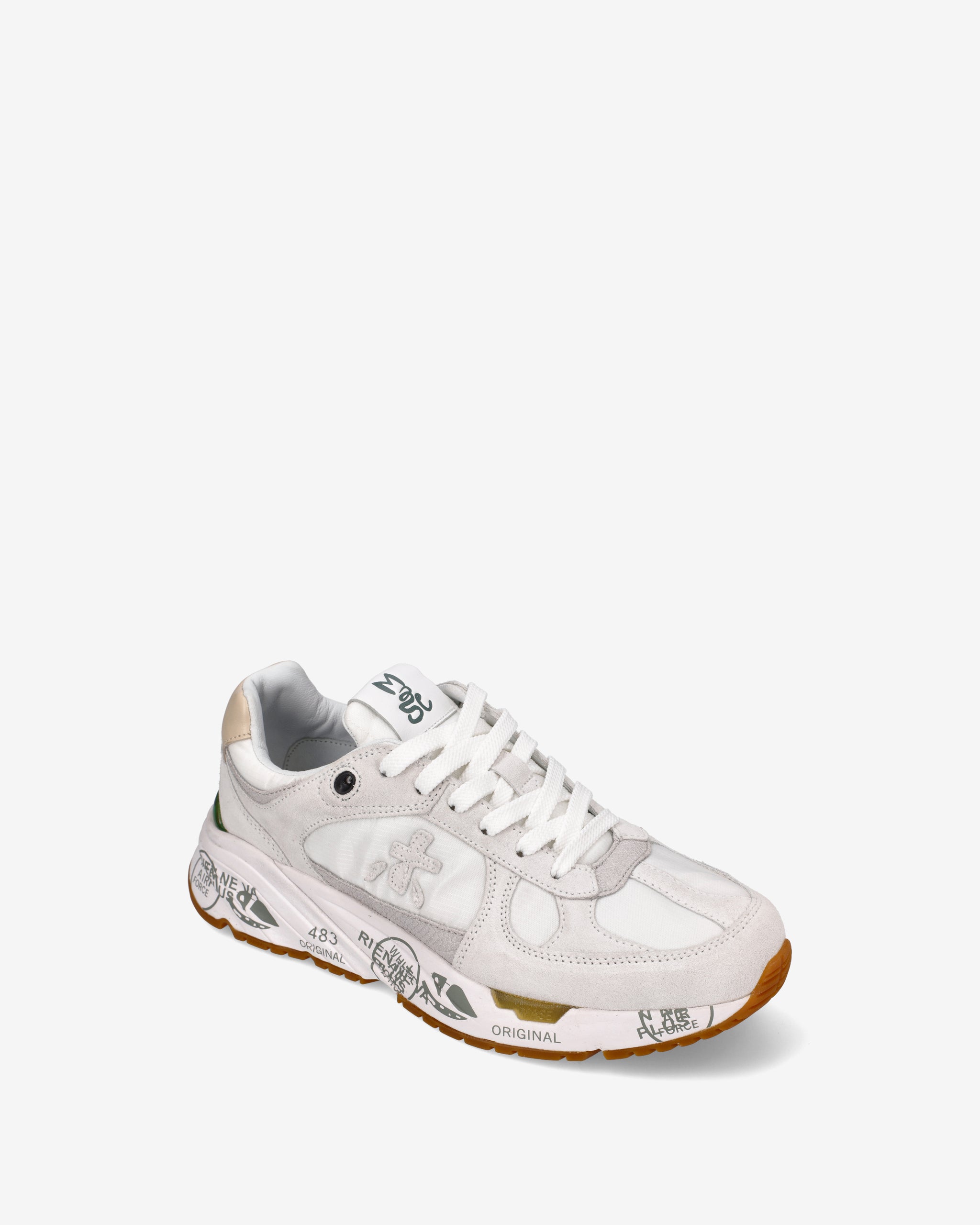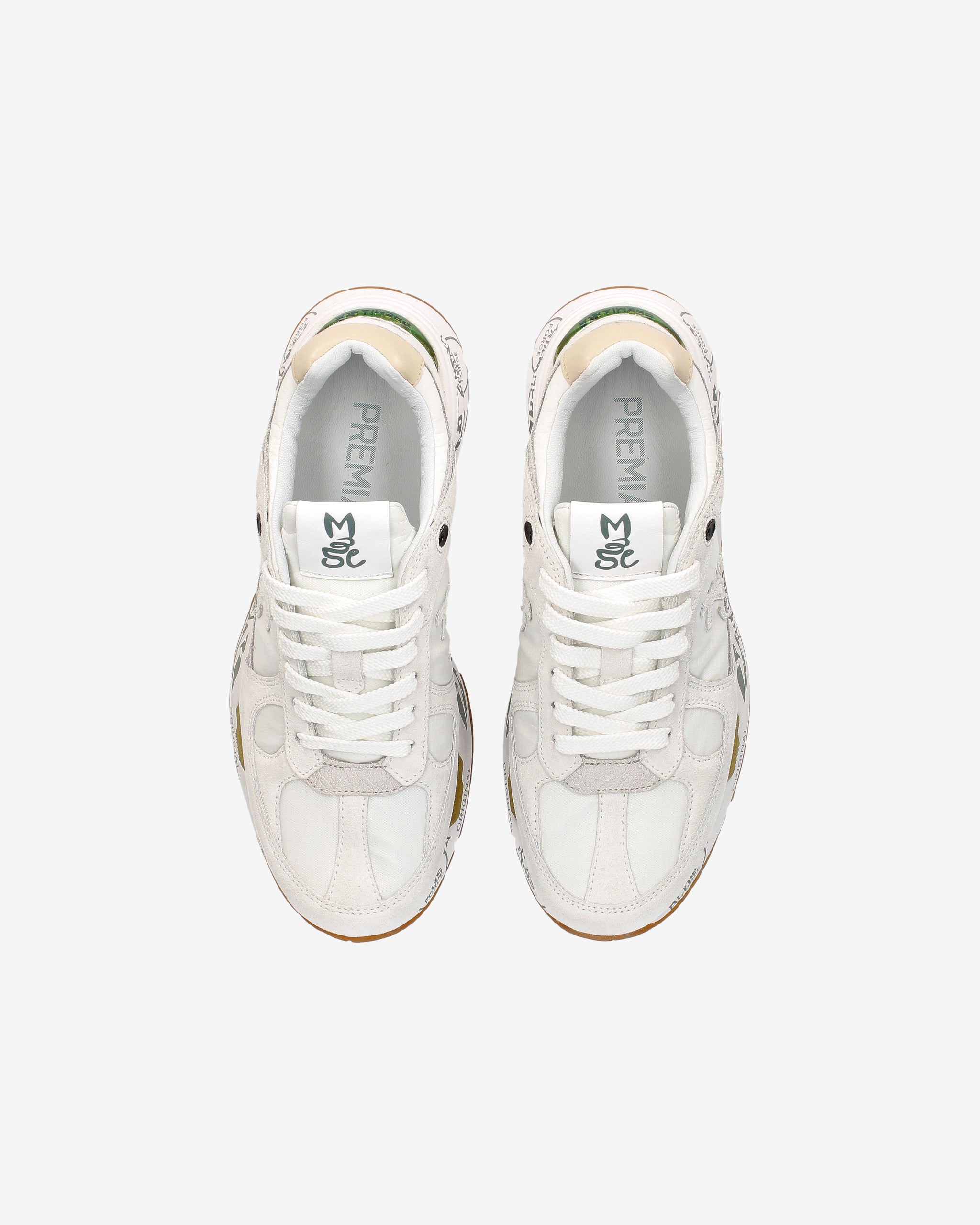 Risentono del mood nineties, combinano una silhouette moderna con materiali pregiati e dettagli vivaci. Fedeli al design Premiata, ne conservano tutti gli elementi chiave: il logo che decora i laterali, la scritta MASE che si evince sull’etichetta, trattamenti e dettagli a contrasto che ne risaltano la visibilità.