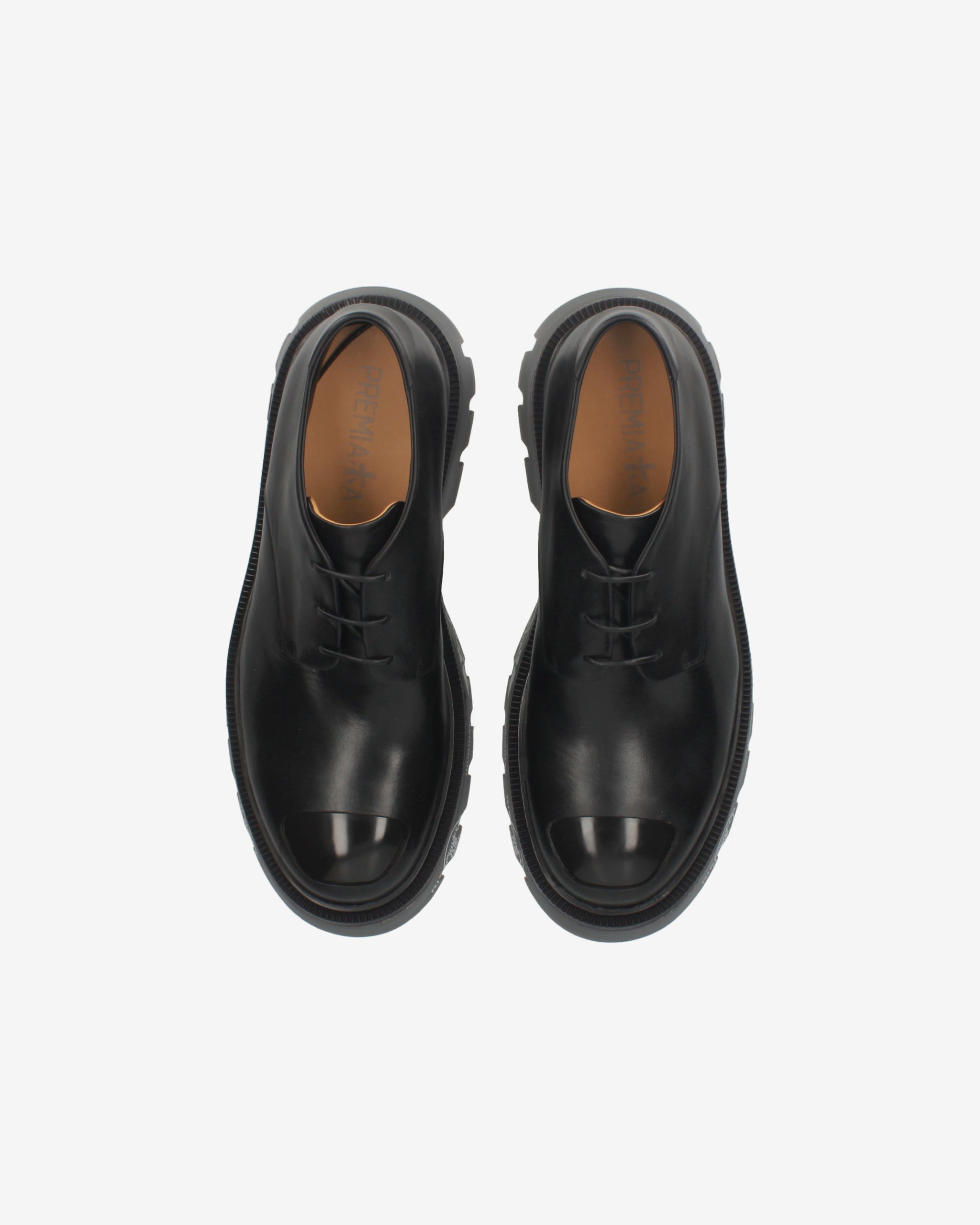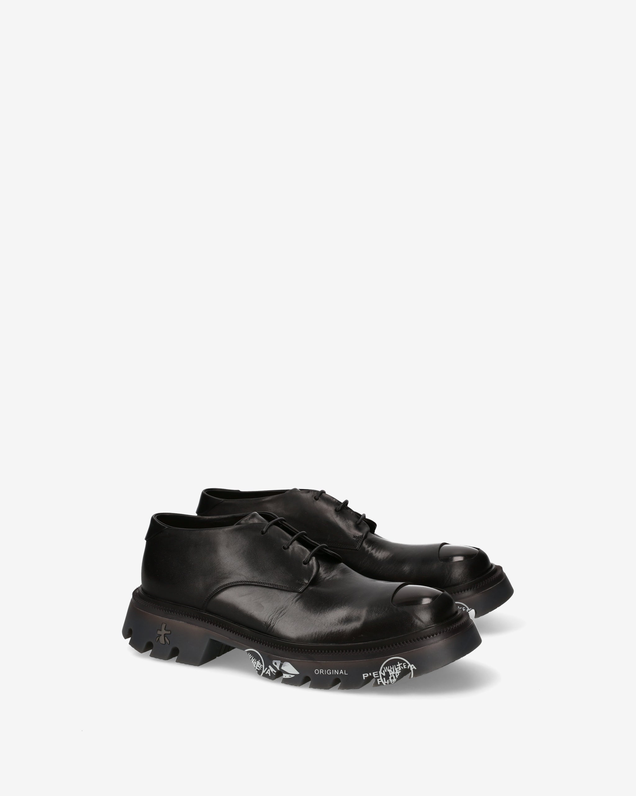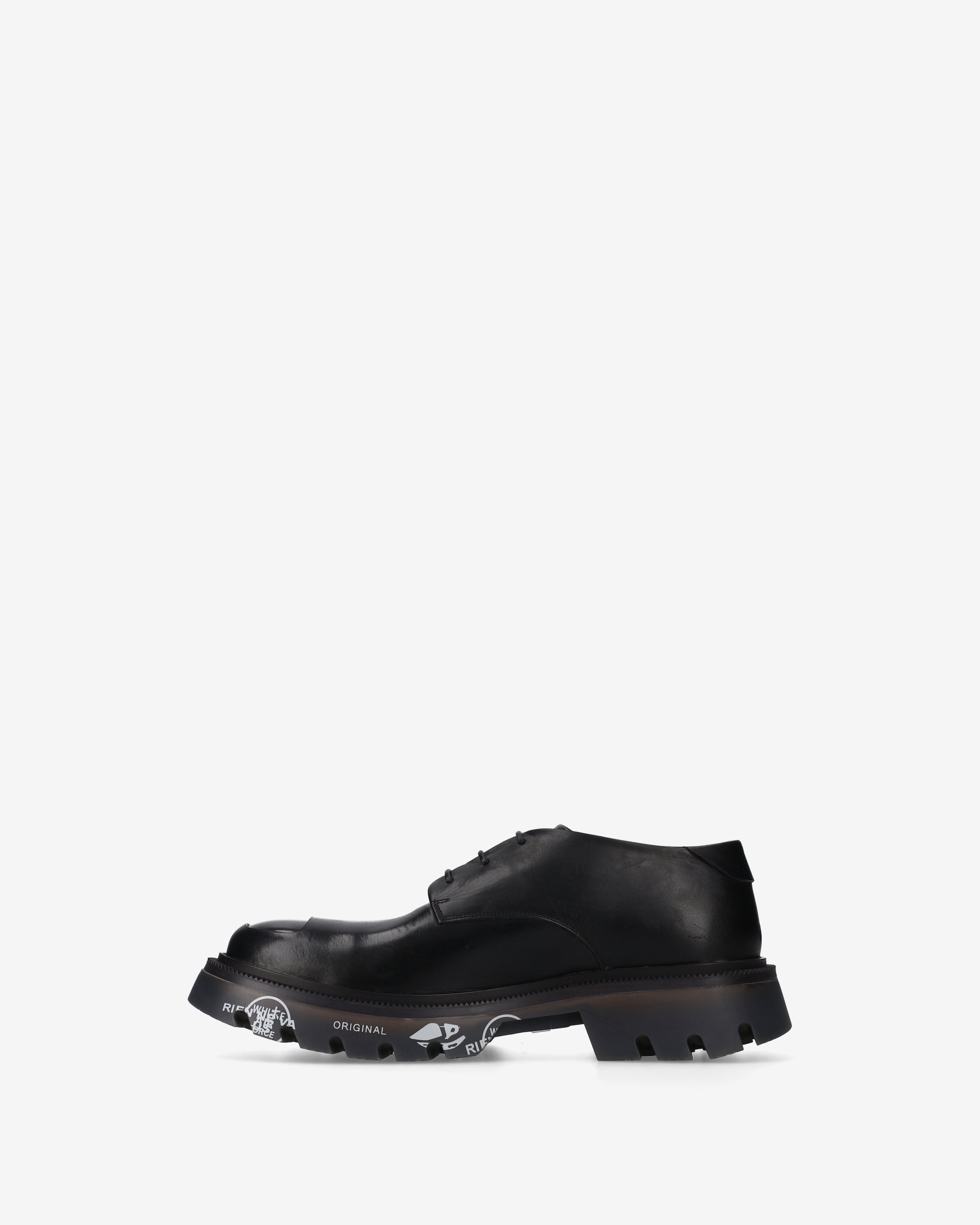 Derby in vitello con puntale in ABS e fondo in tono al pellame. Linee pulite e materiali di qualità per uno stile sobrio e contemporaneo, ispirato all’estetica underground londinese.