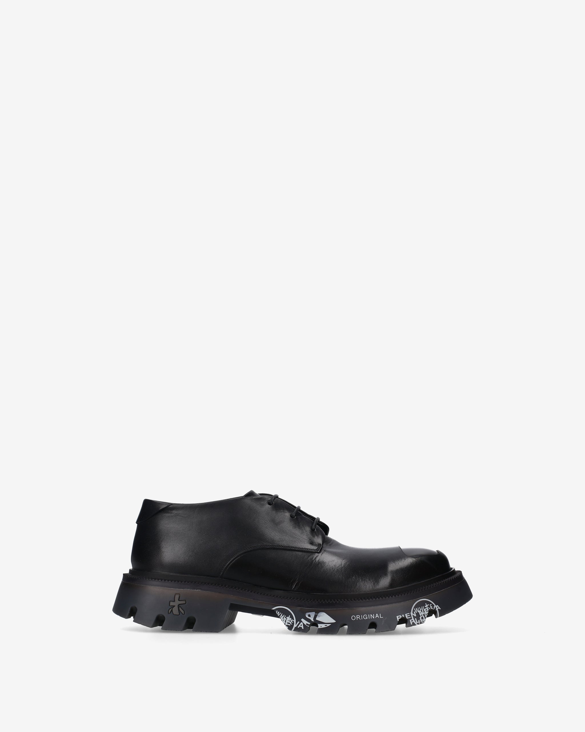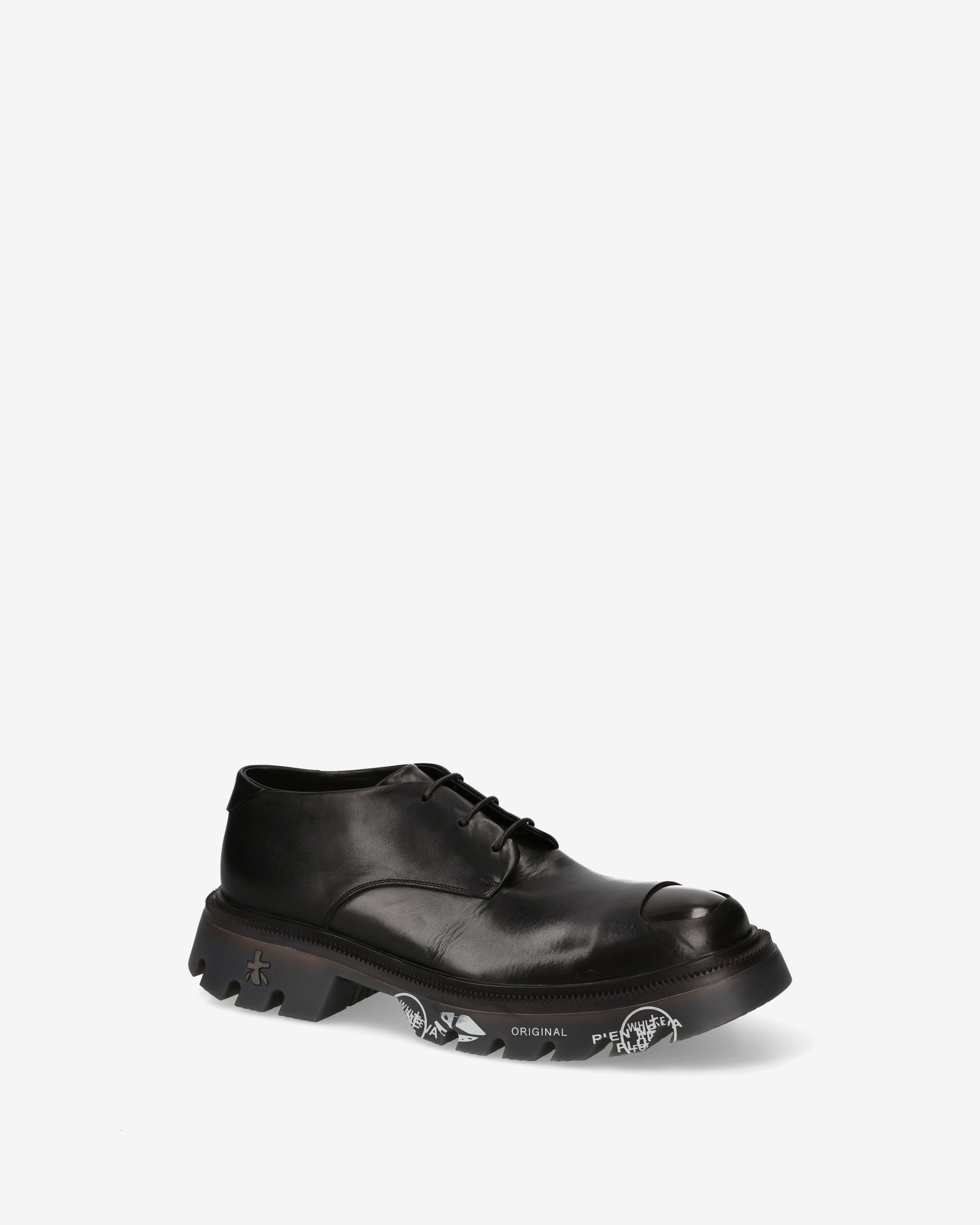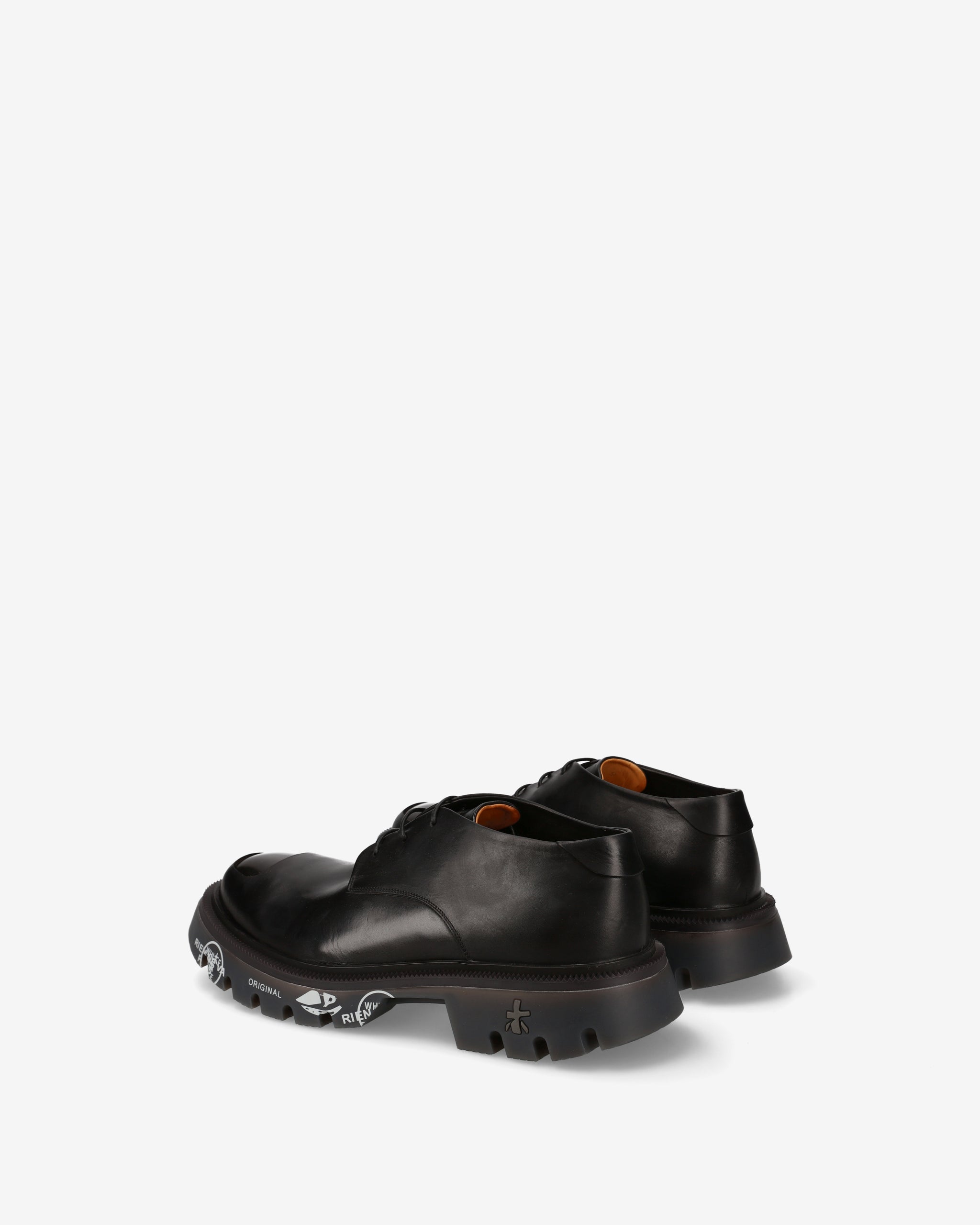 Derby in vitello con puntale in ABS e fondo in tono al pellame. Linee pulite e materiali di qualità per uno stile sobrio e contemporaneo, ispirato all’estetica underground londinese.