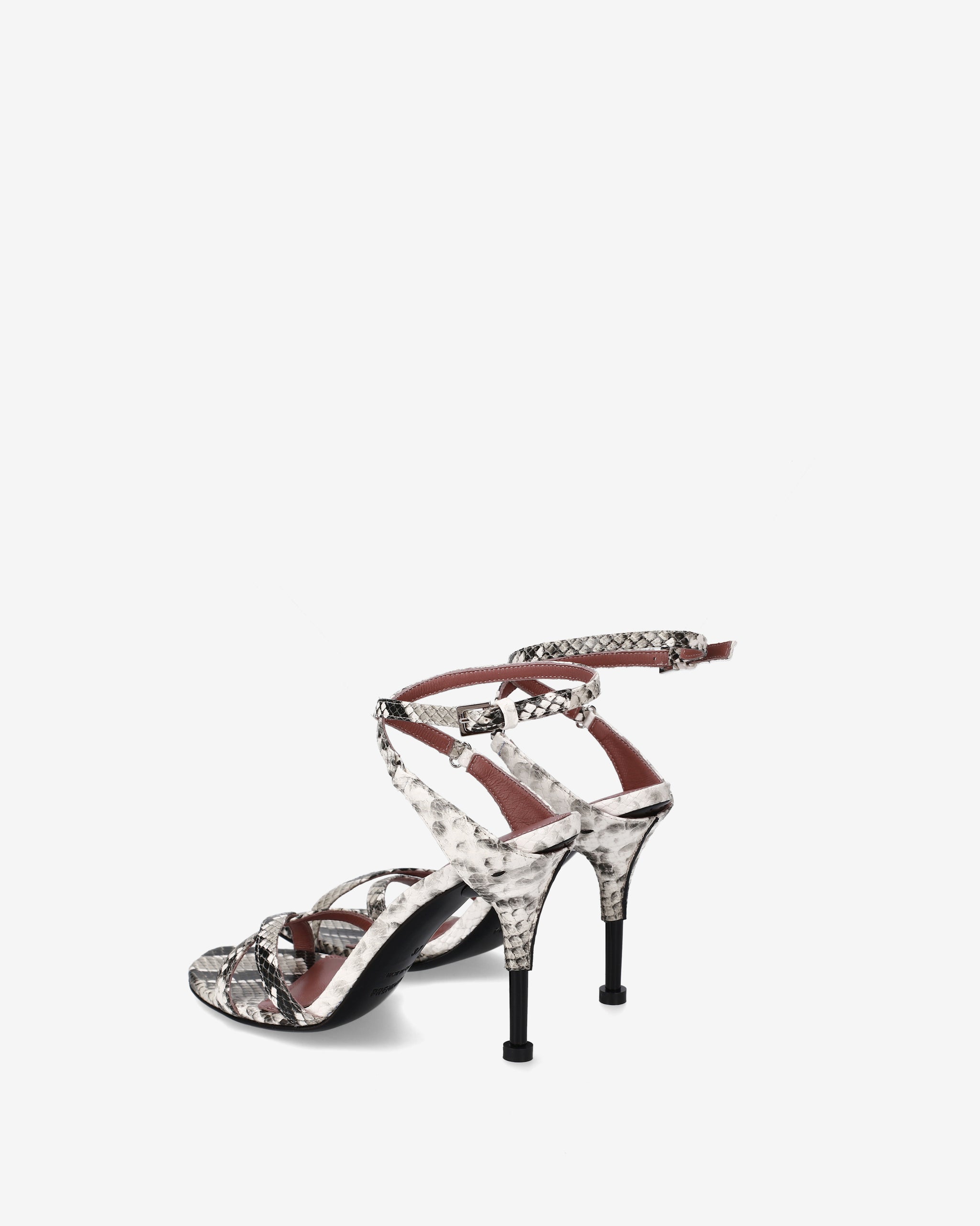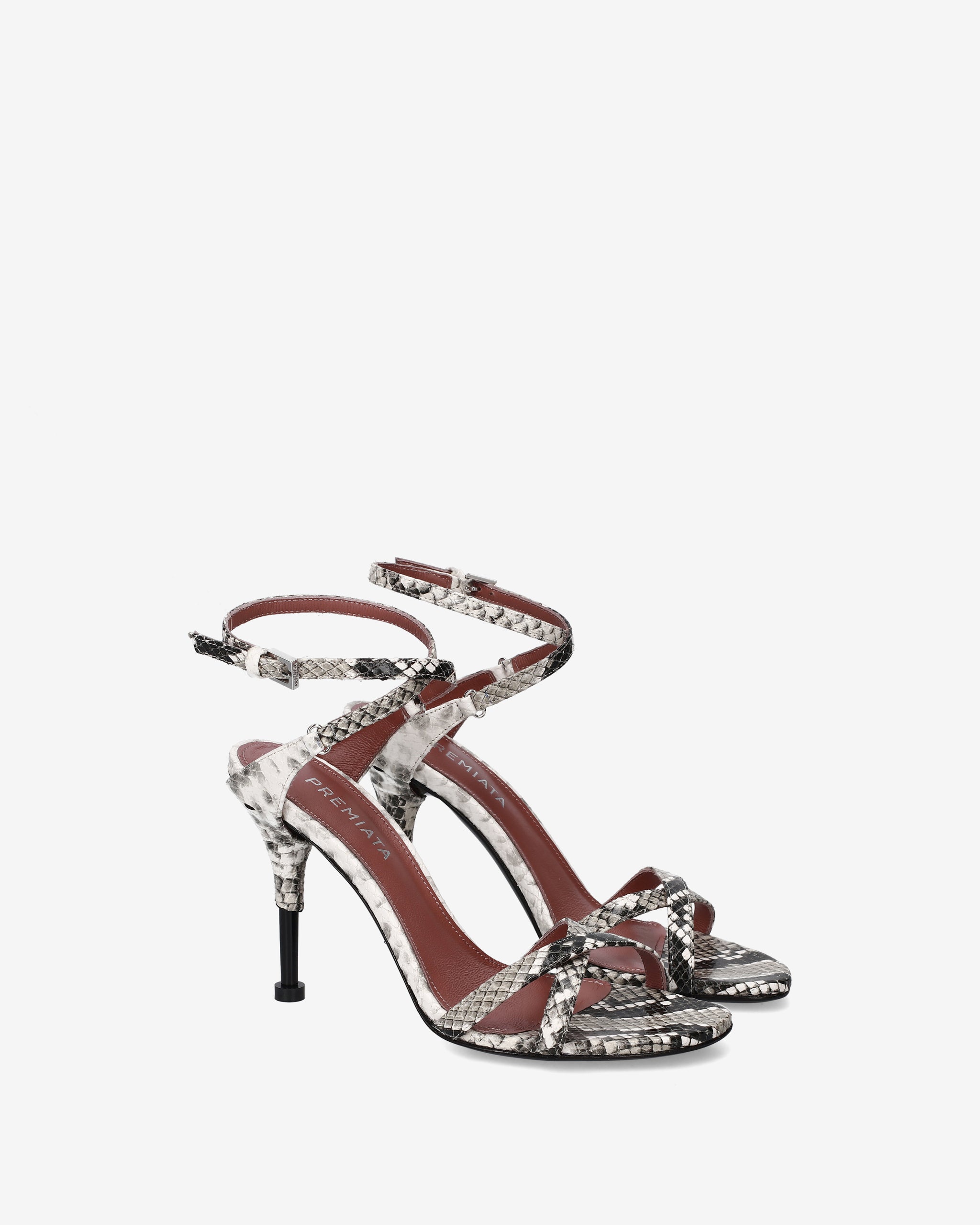 Un sandalo dal design audace e ultra-femminile, caratterizzato da una texture esotica che richiama il fascino selvaggio della natura