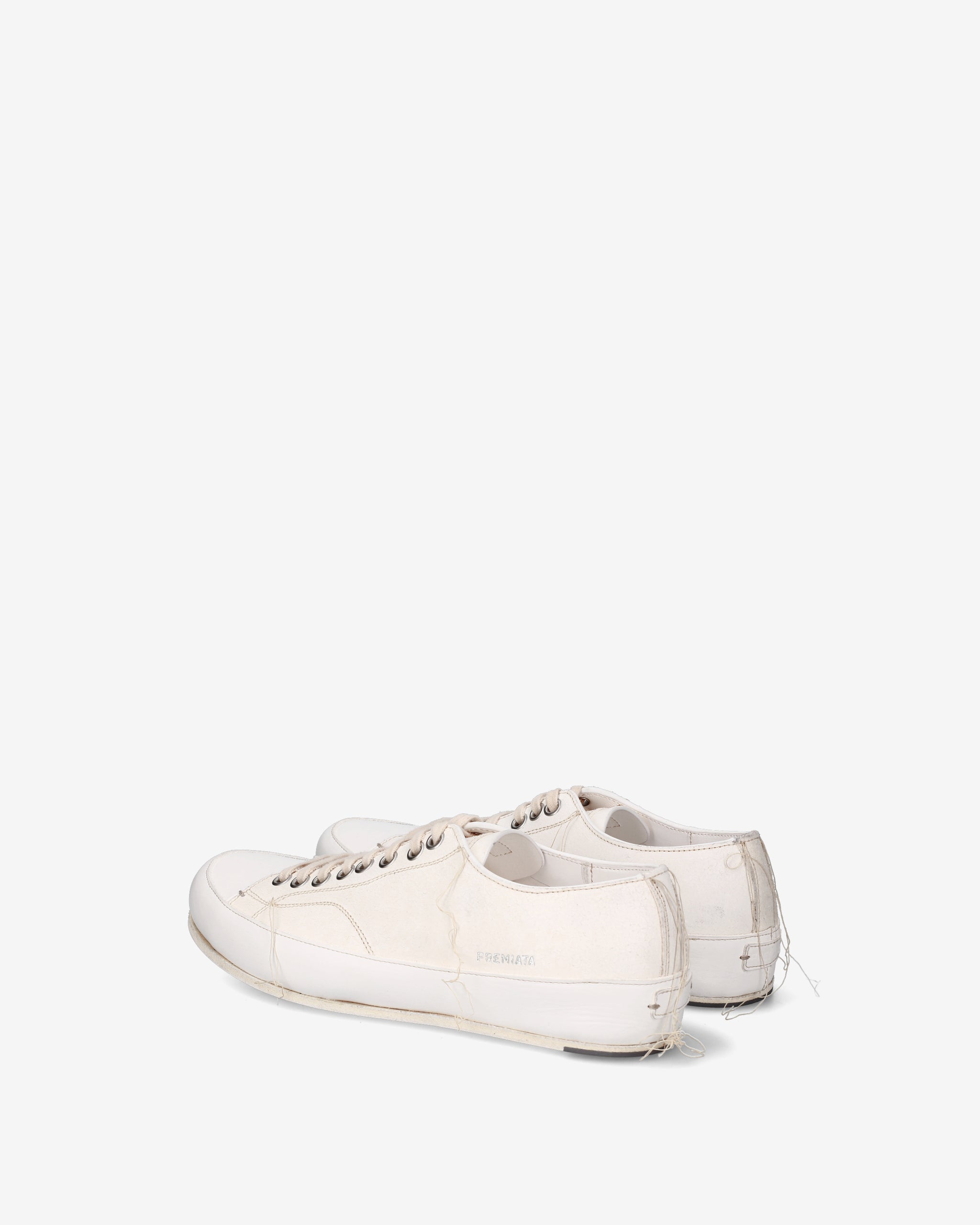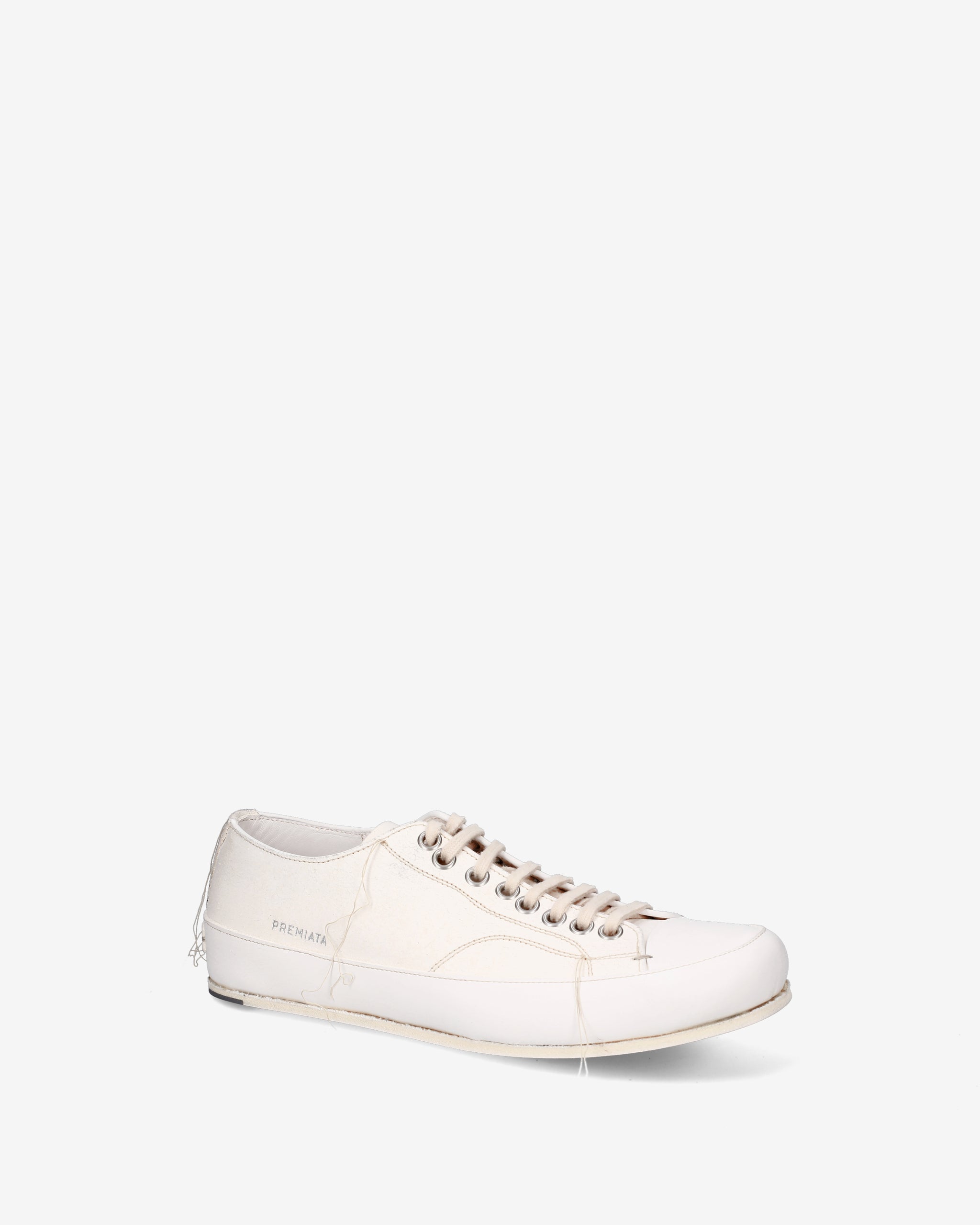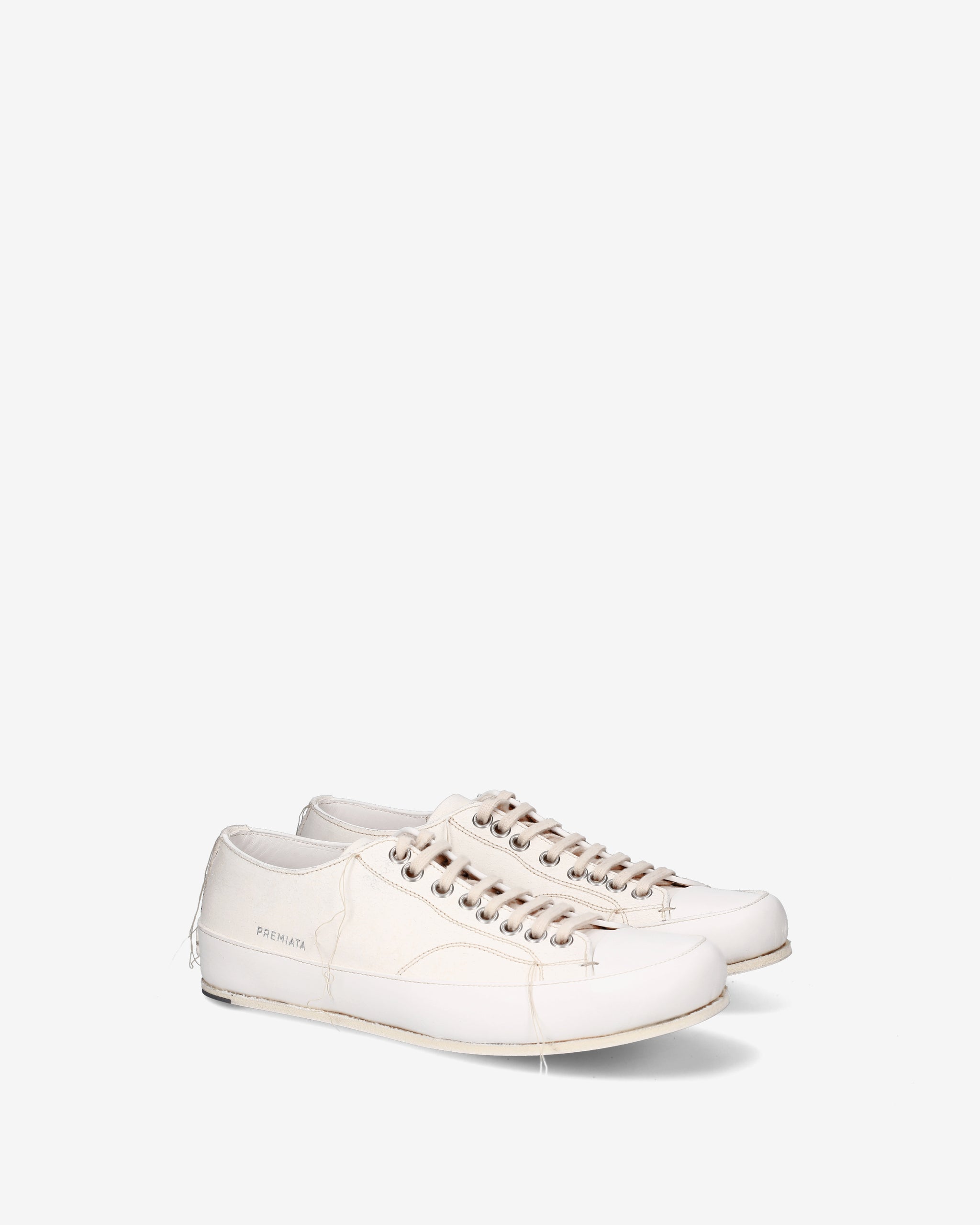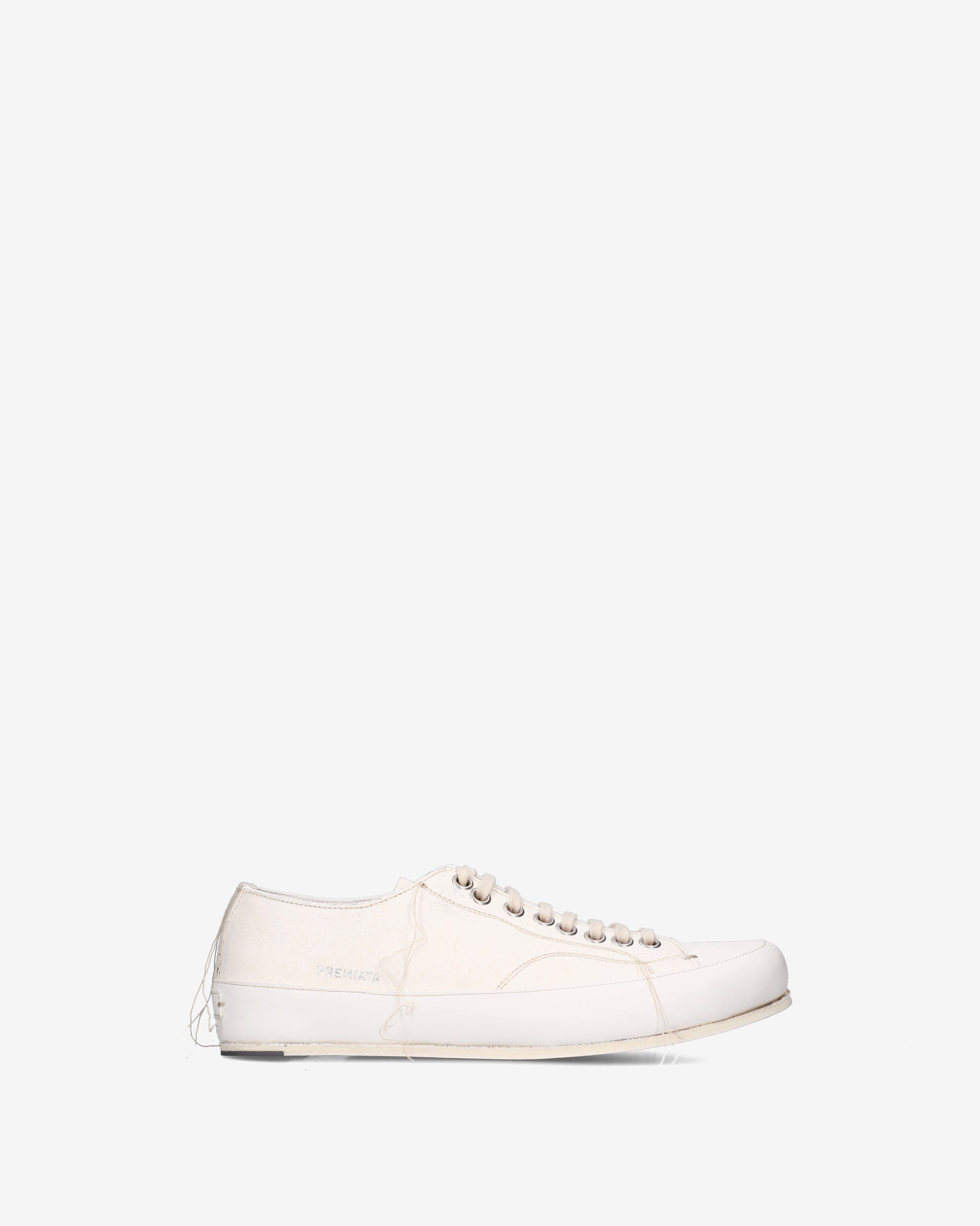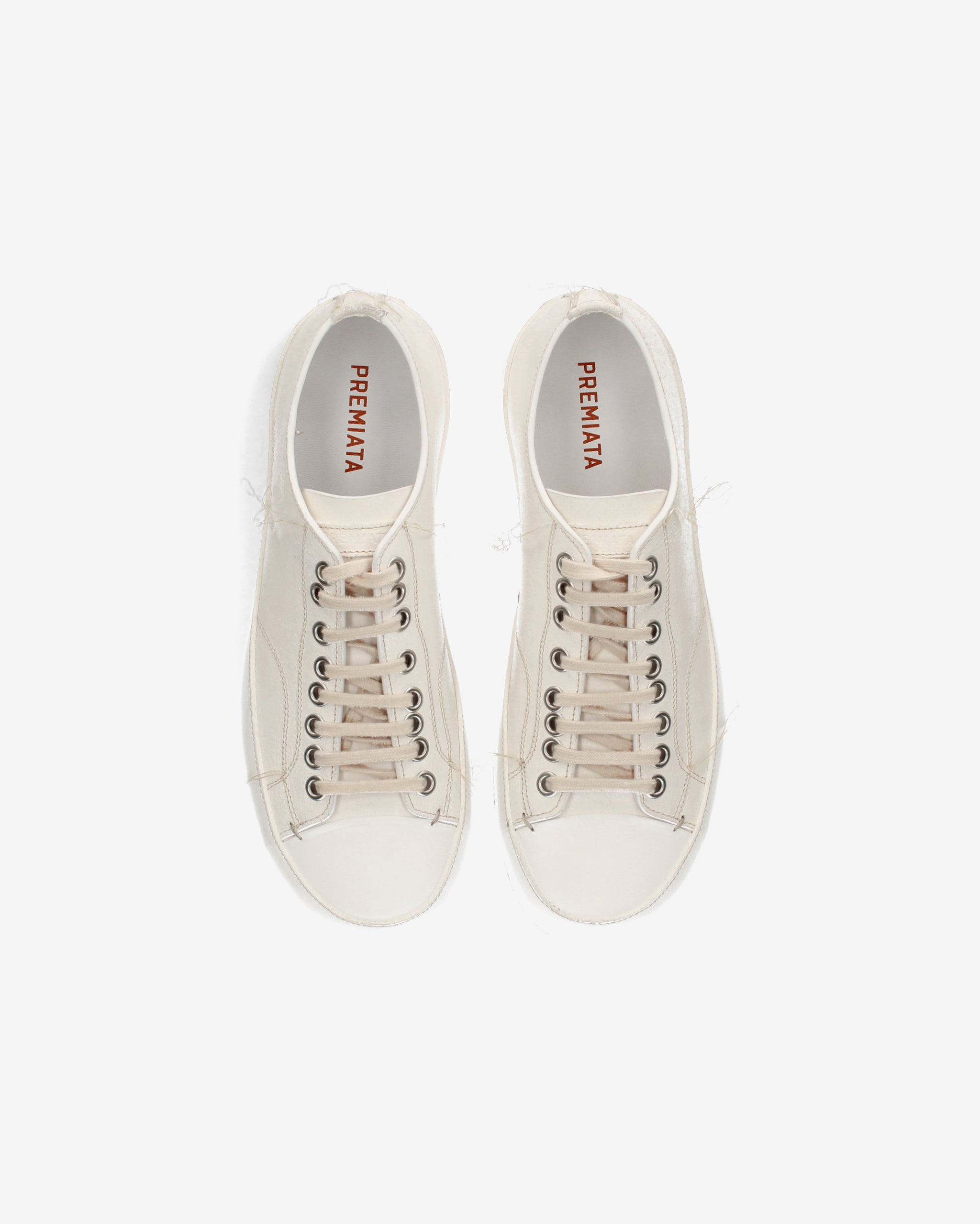- Silhouette low-top con allacciatura a 7 fori, occhielli metallici rinforzati e logo "PREMIATA" impresso lateralmente in argento