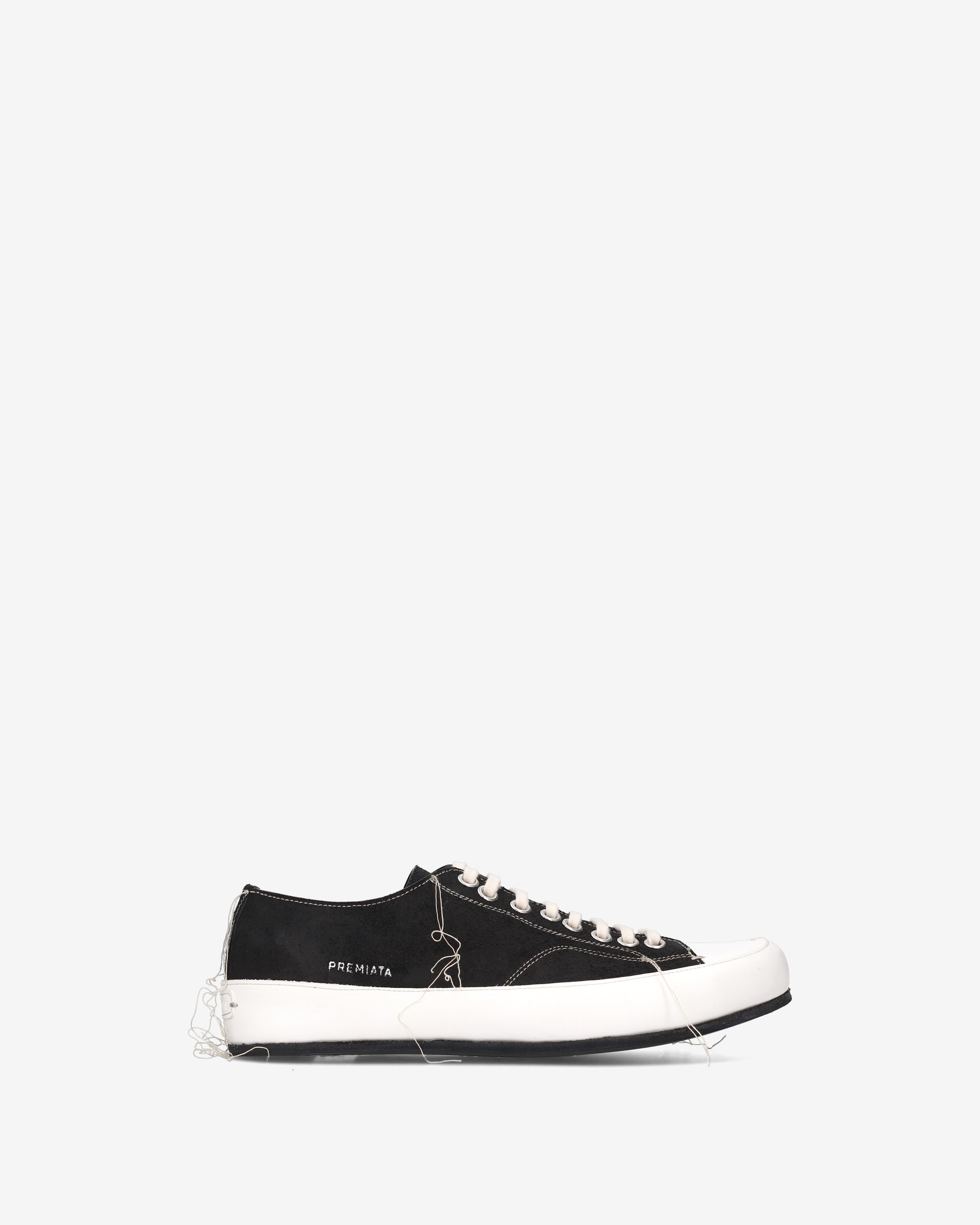 • Silhouette low-top con allacciatura a 7 fori, occhielli metallici rinforzati e logo "PREMIATA" impresso lateralmente in argento