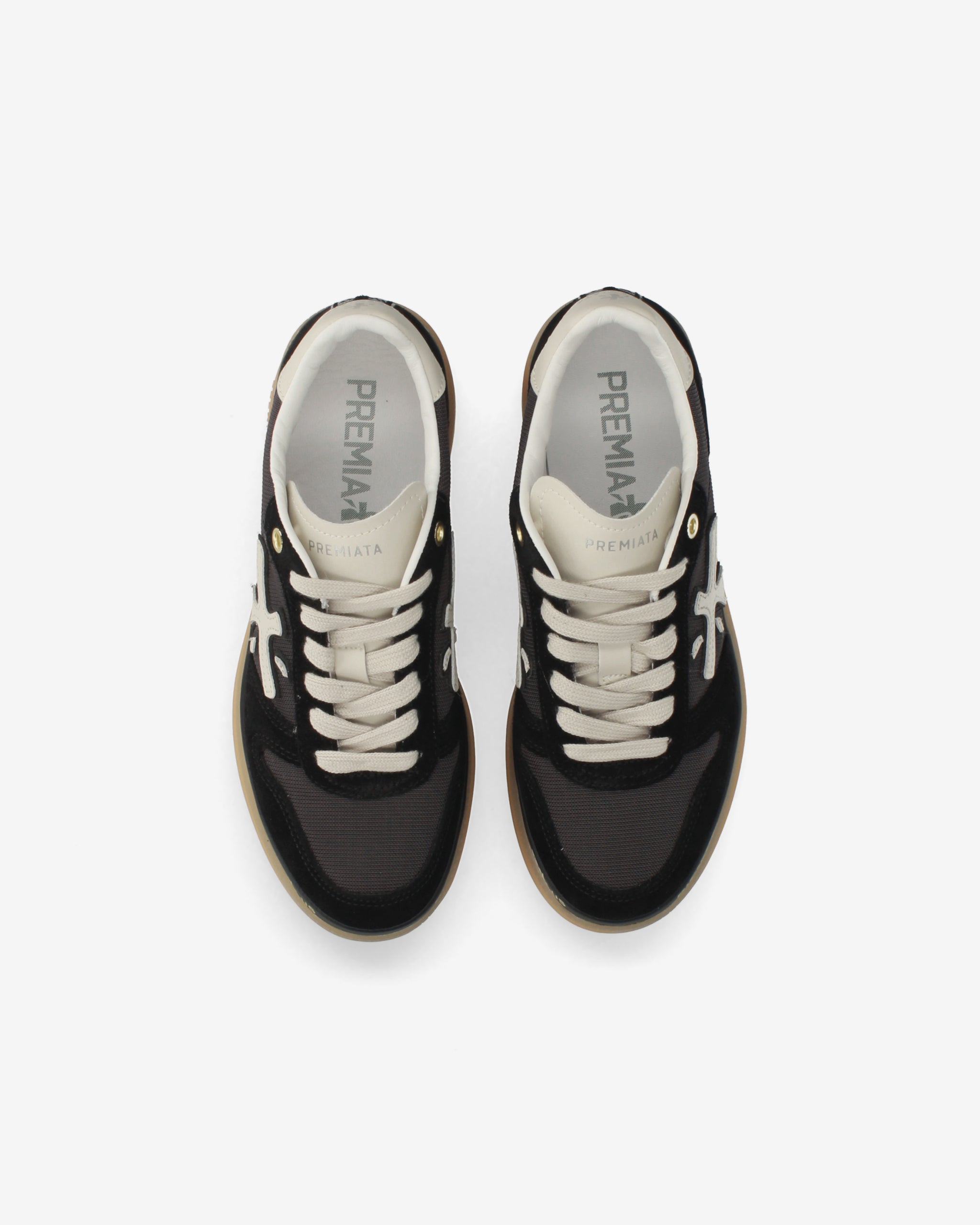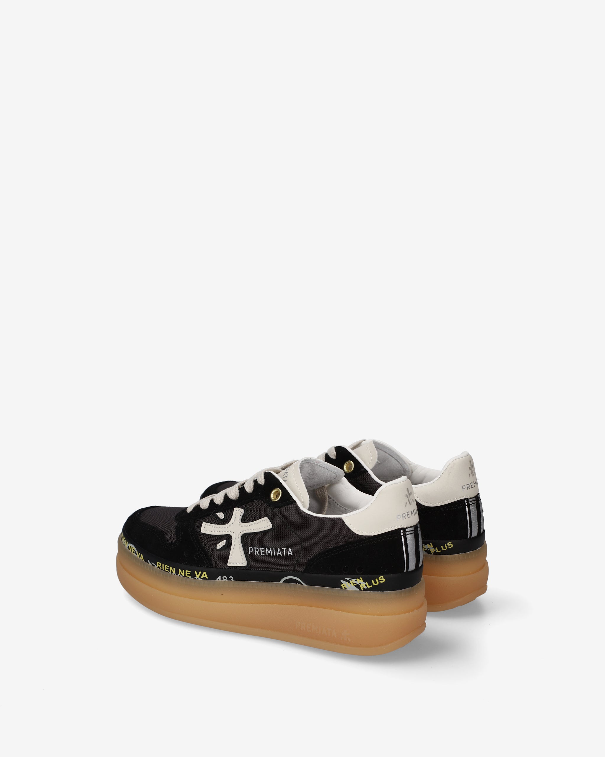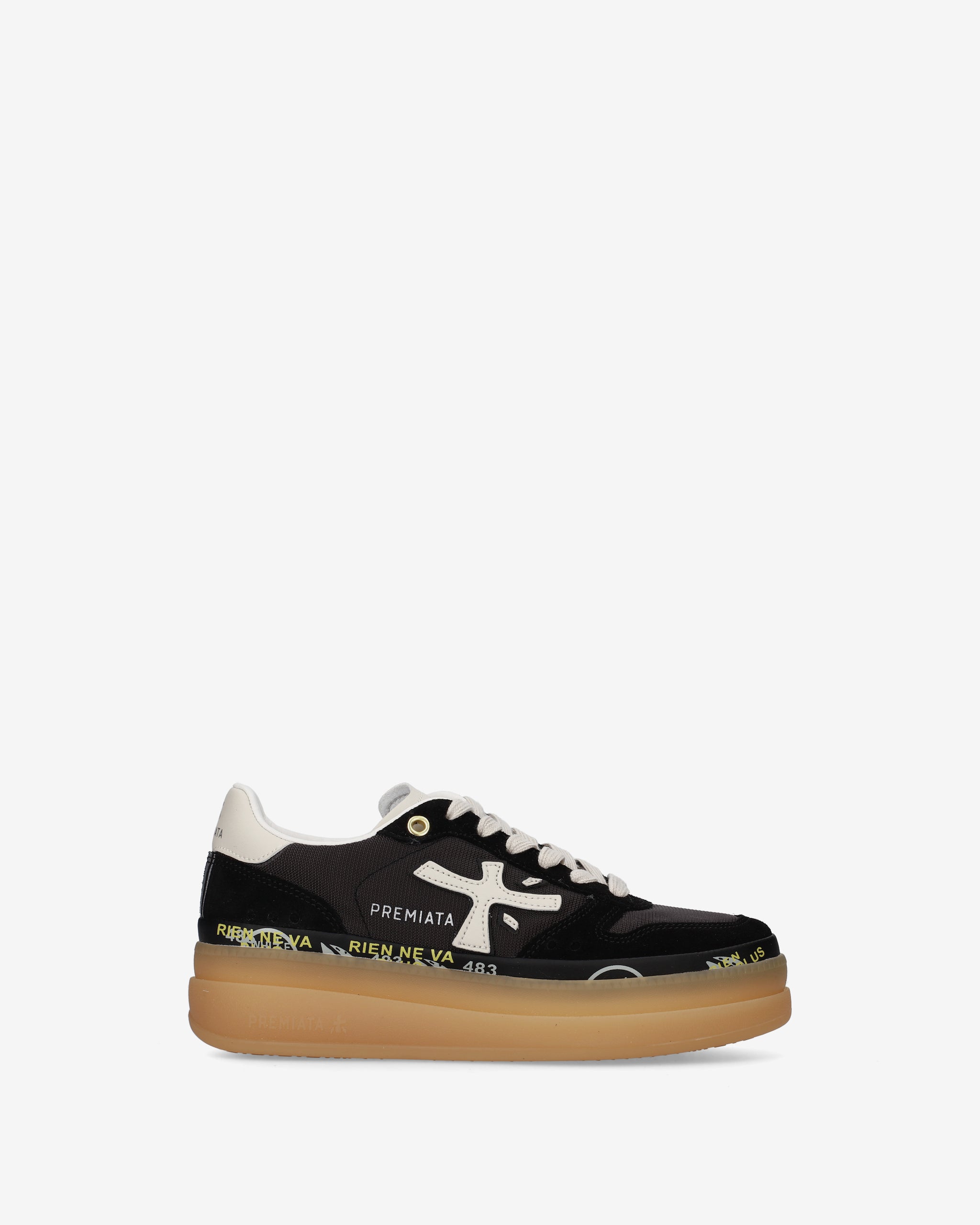 One of Premiata's new must-haves. Style reaches new heights, combining designs such as the double-layer platform sole with a midsole embellished with the brand's iconic stamps.