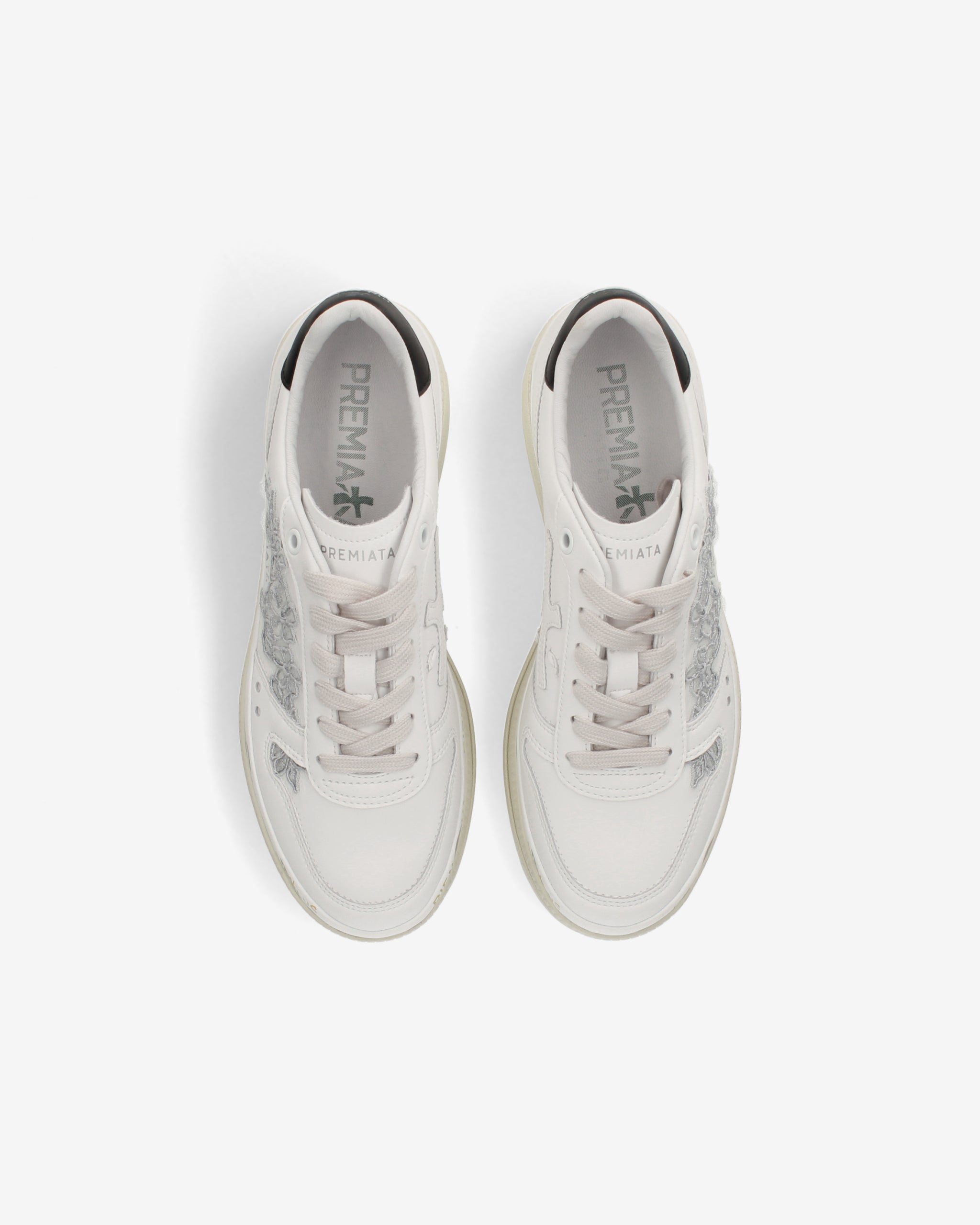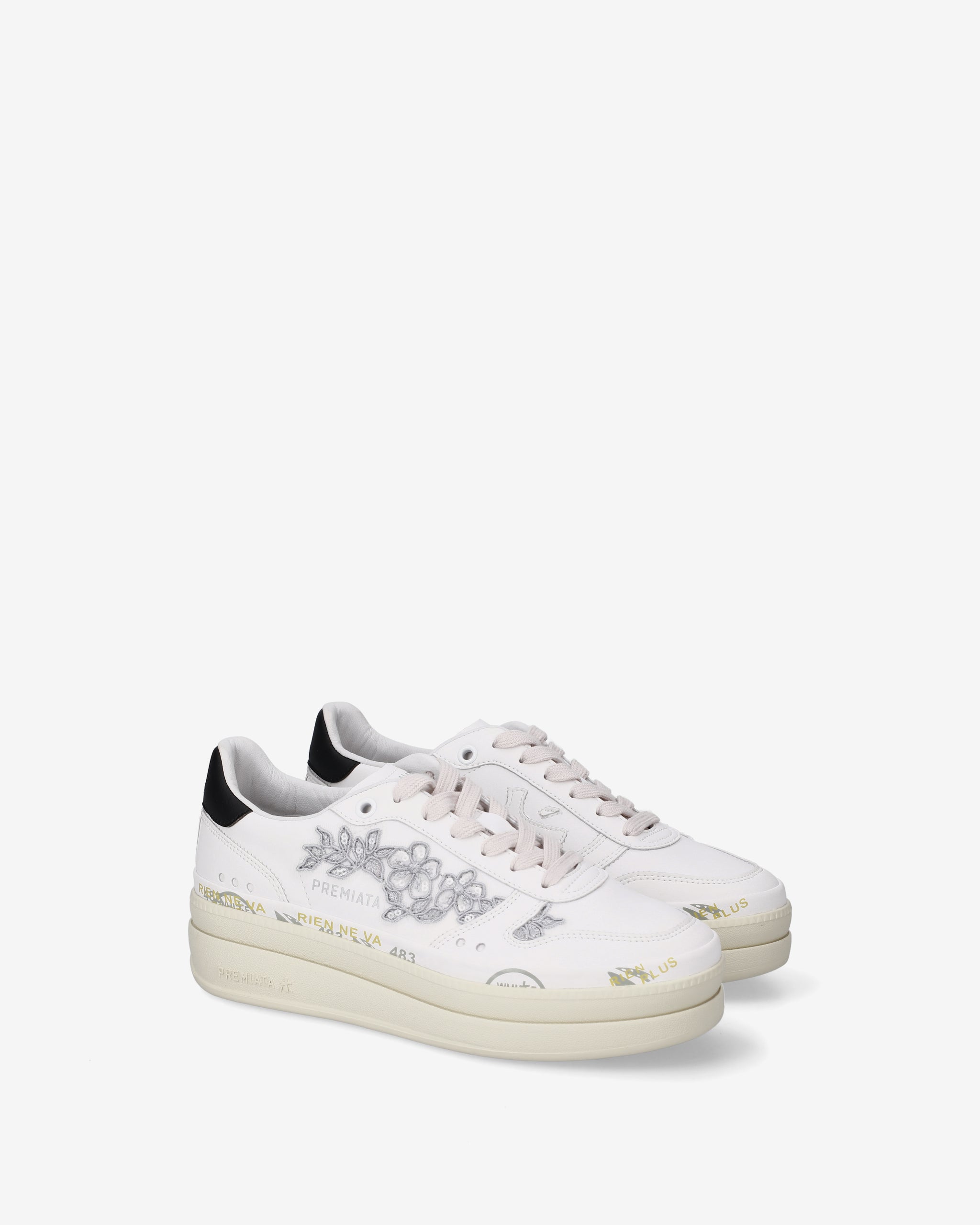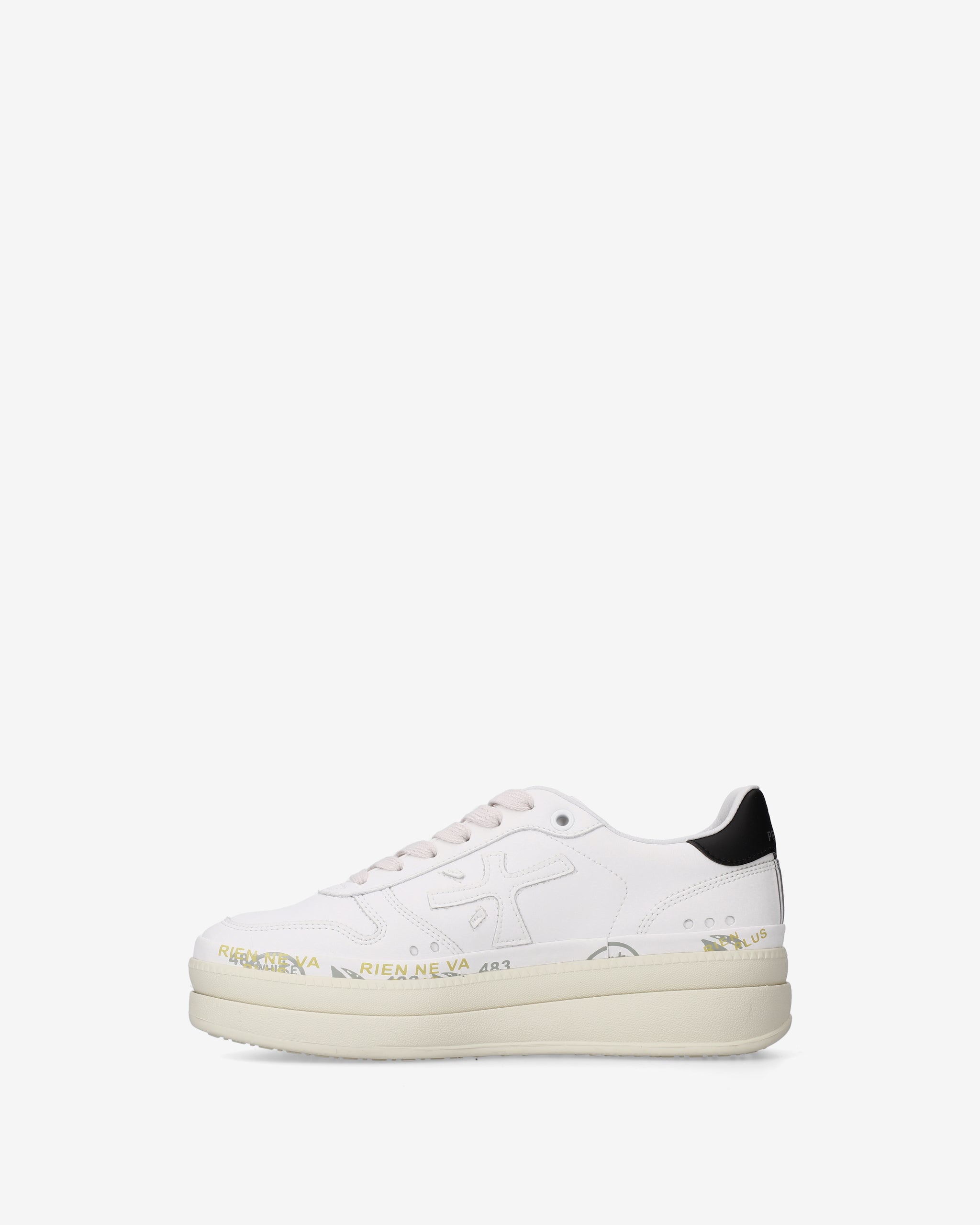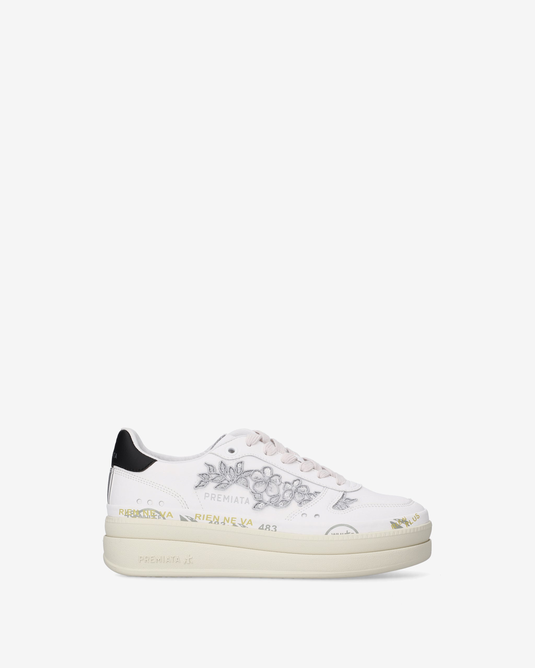 One of Premiata's new must-haves. Style reaches new heights, combining designs such as the double-layer platform sole with a midsole embellished with the brand's iconic stamps.