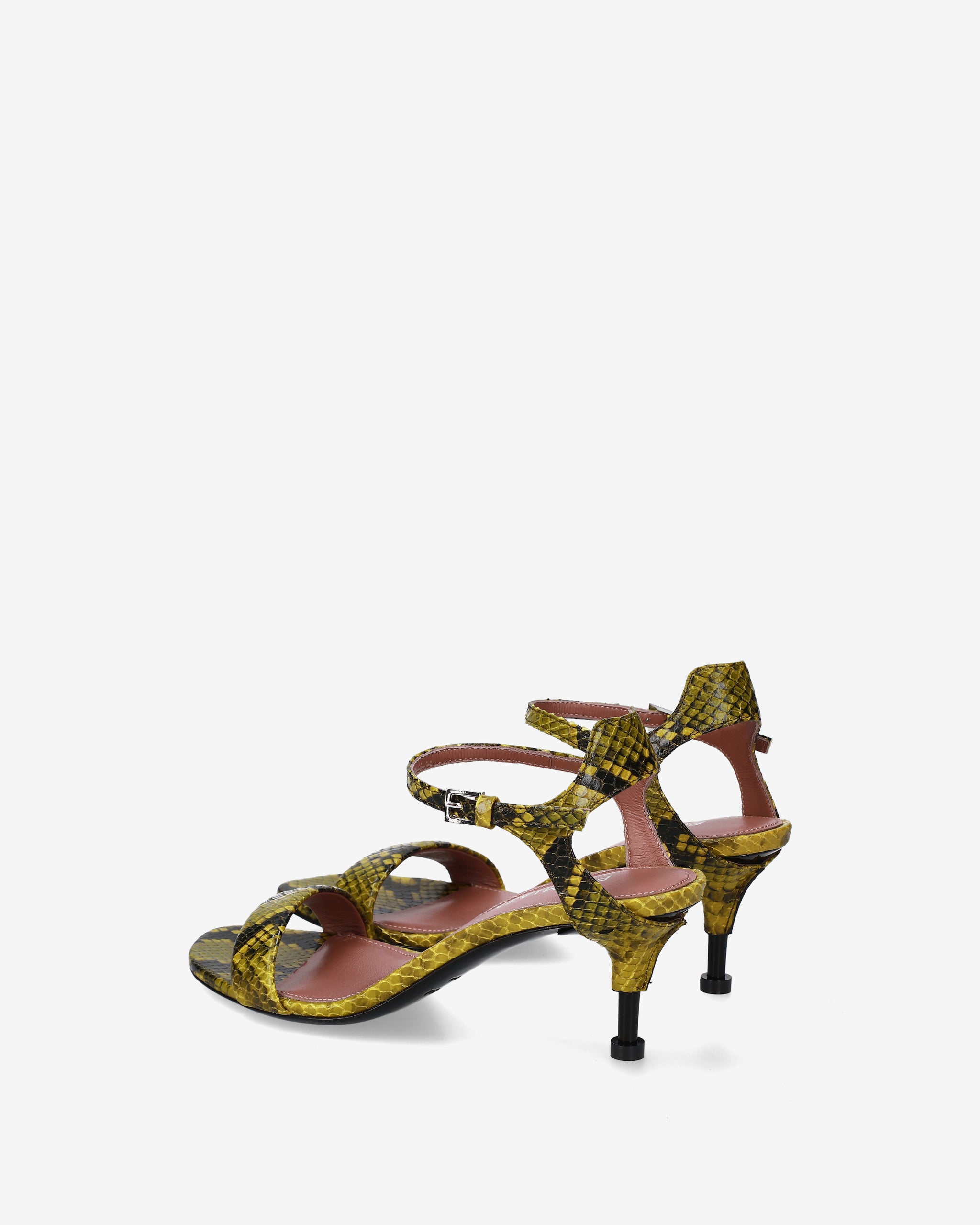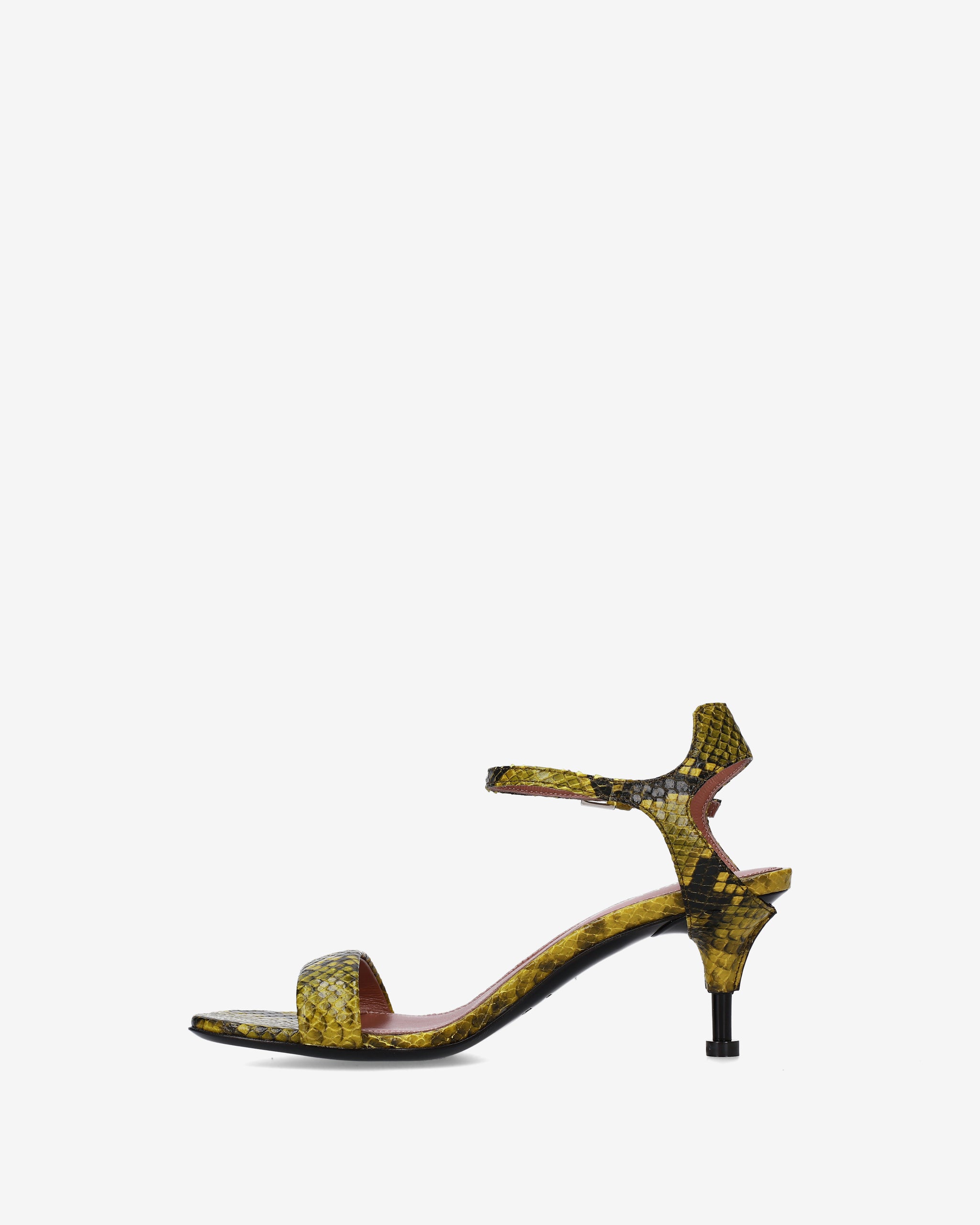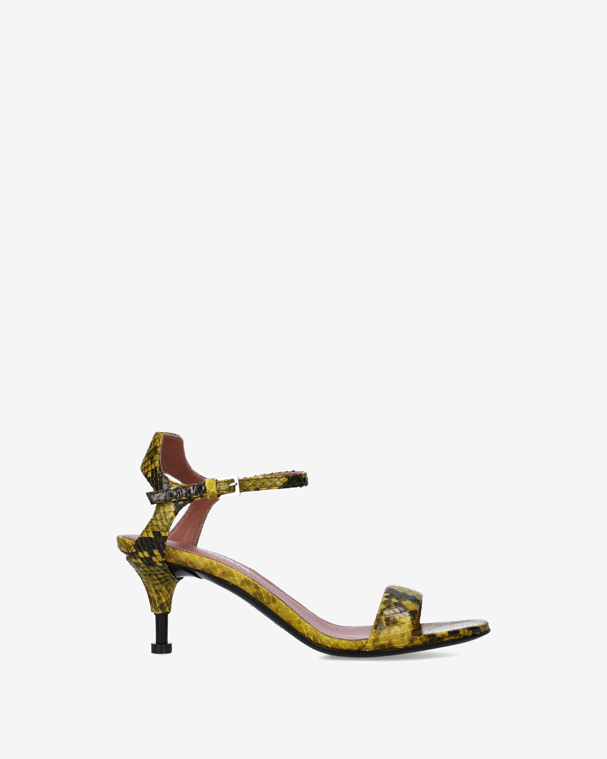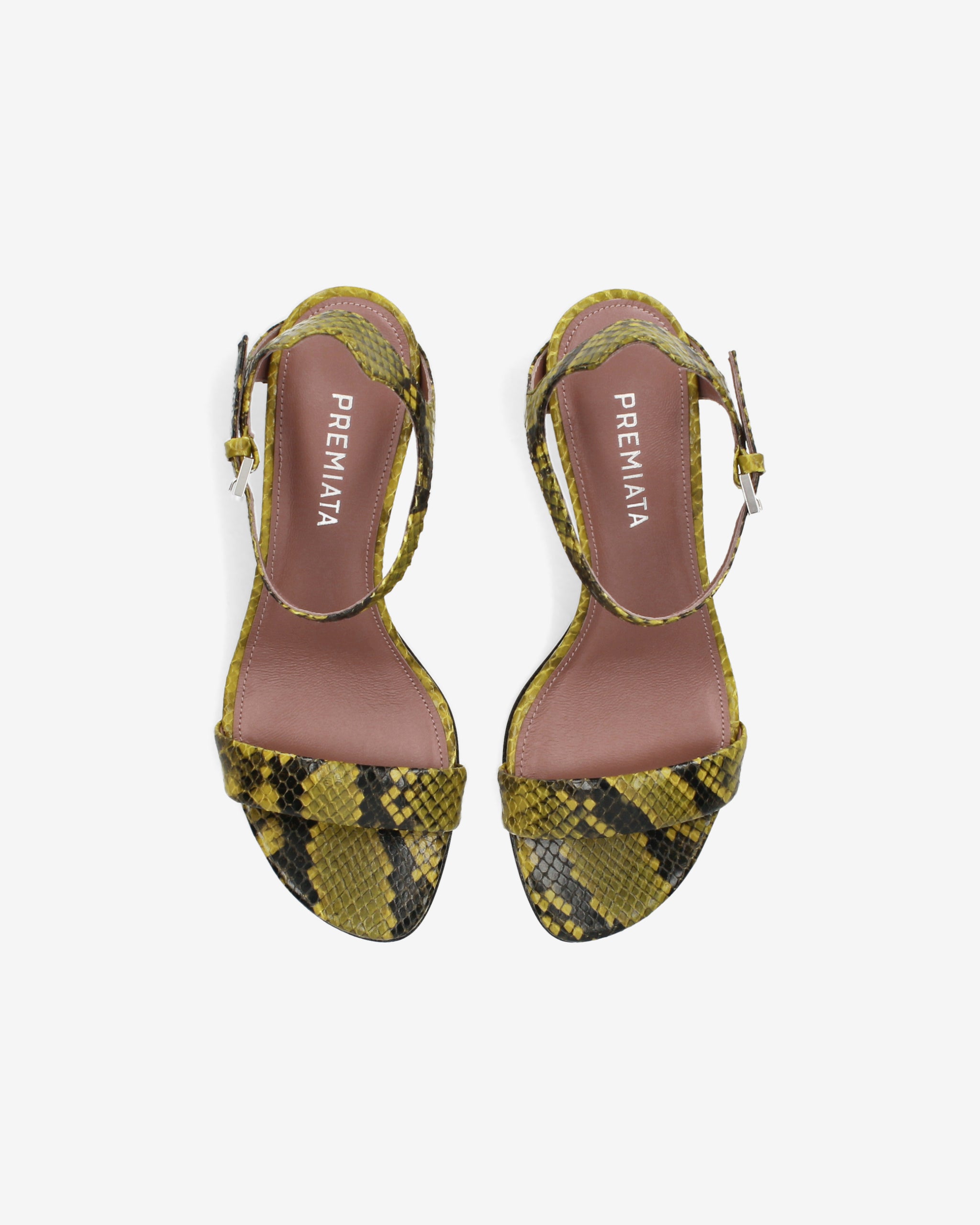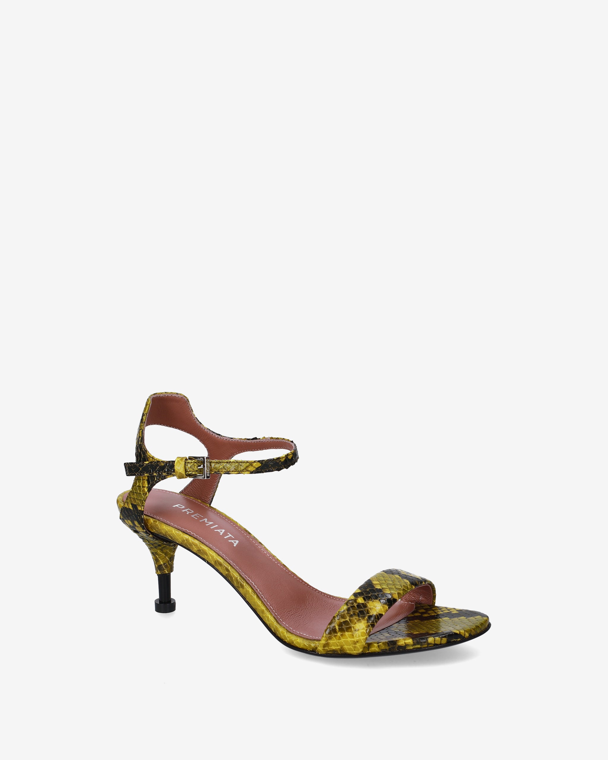 A sandal with a minimalist and exotic design that focuses on the visual impact of the animal print texture. The slender silhouette and use of fine leathers make it a sophisticated accessory.