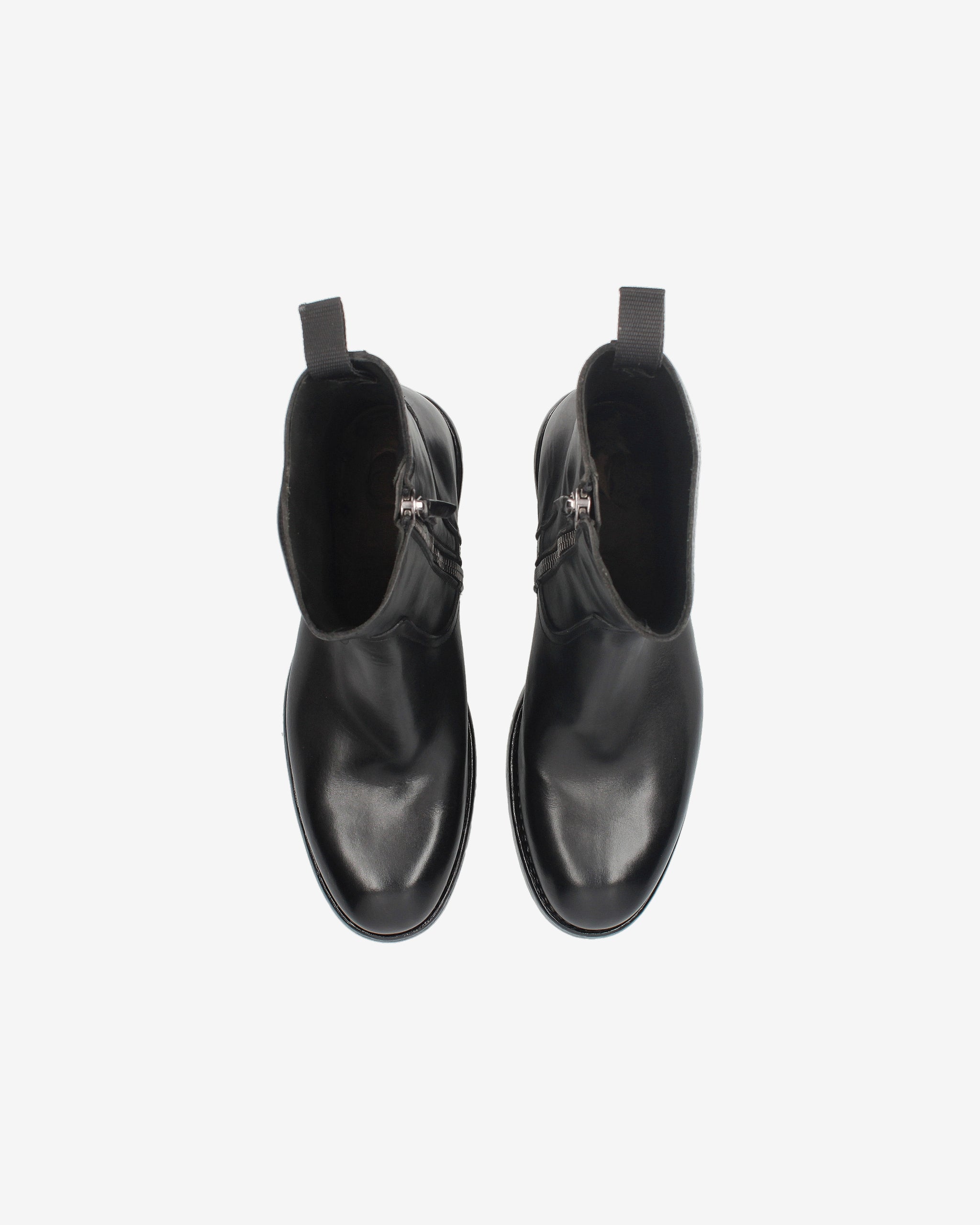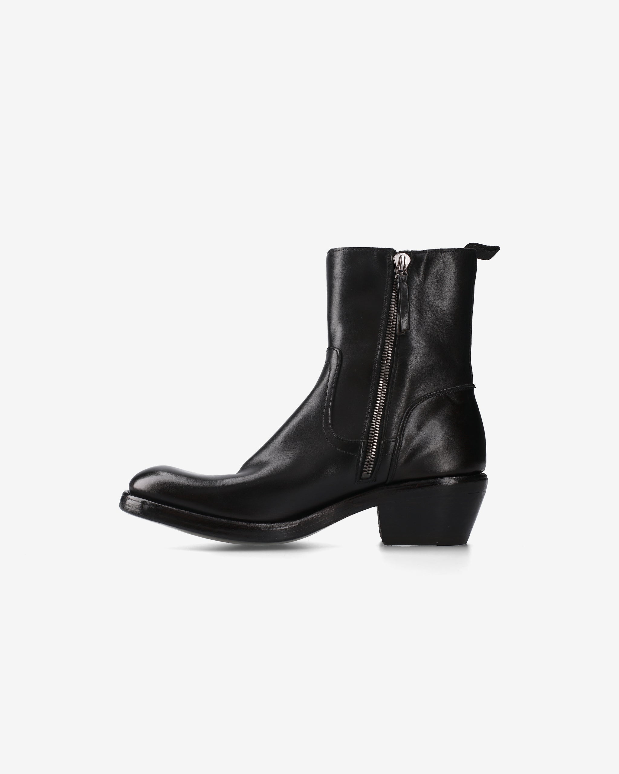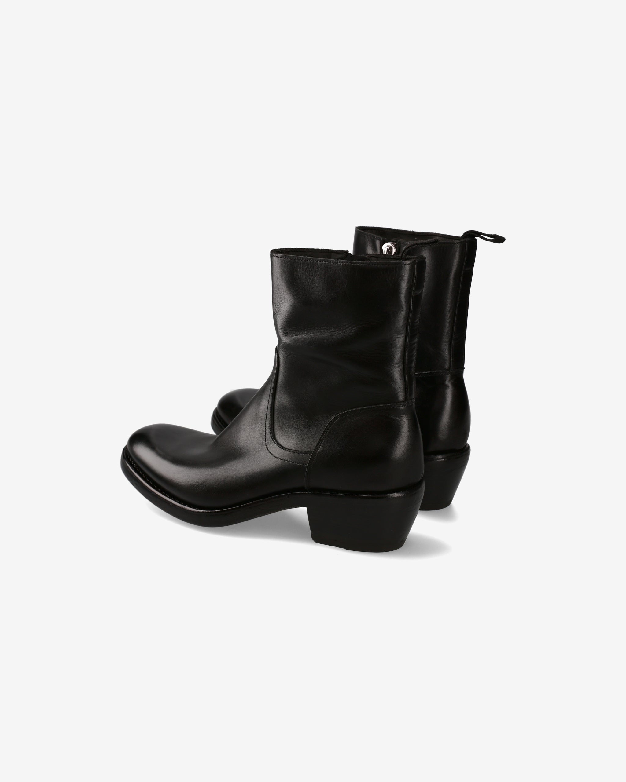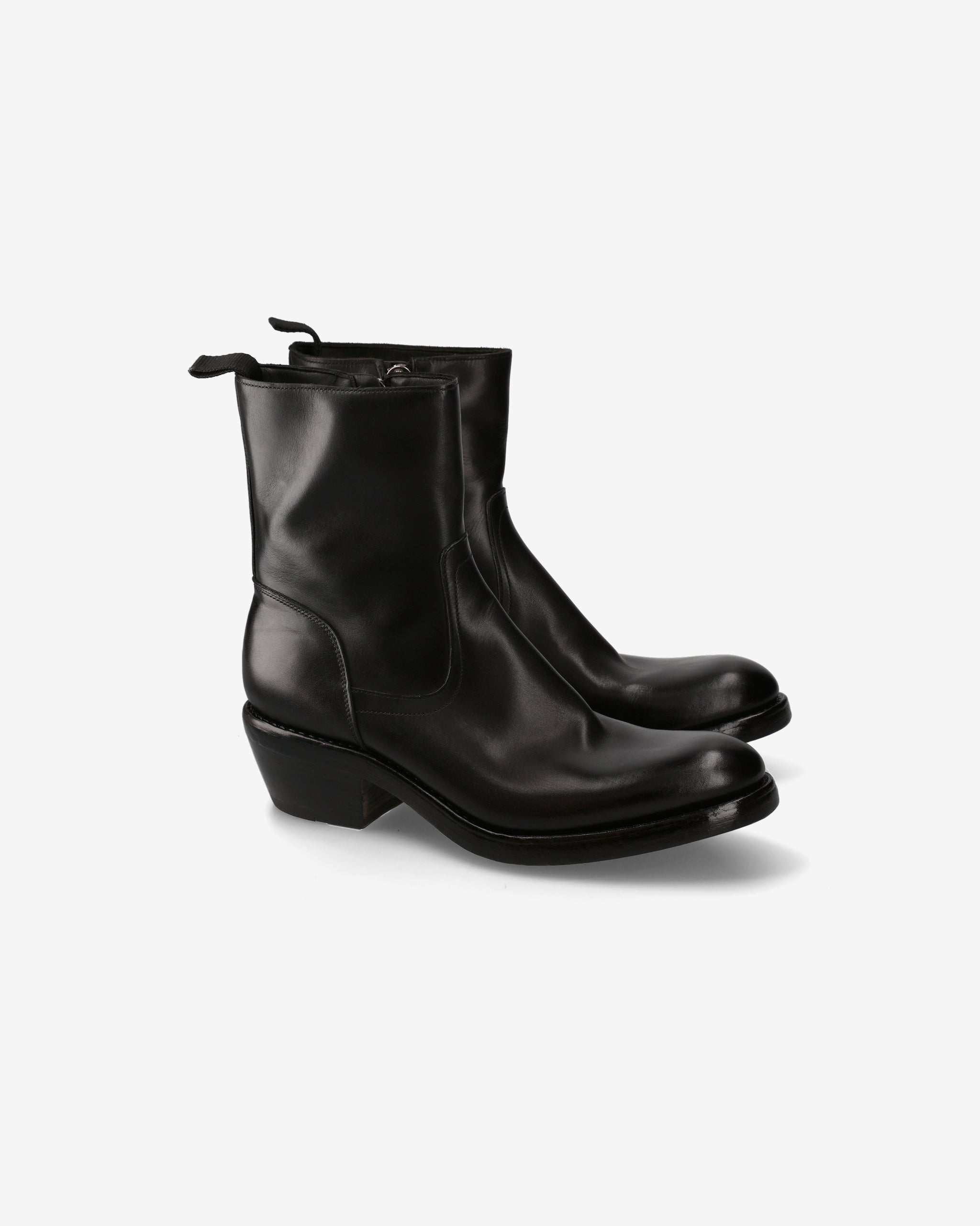 Comfort and style are in perfect symbiosis in our handcrafted Texan boots, made of fine black garment-dyed horse breech. The essential and timeless lines make them a contemporary classic, with distinctive details such as the rounded blunt toe, side zipper and Gros Grain pull on the heel. Goodyear Welted construction and a double leather bottom with 50mm Texas heel complete a product with a strong and sophisticated character.